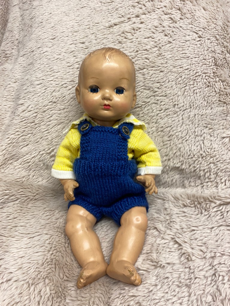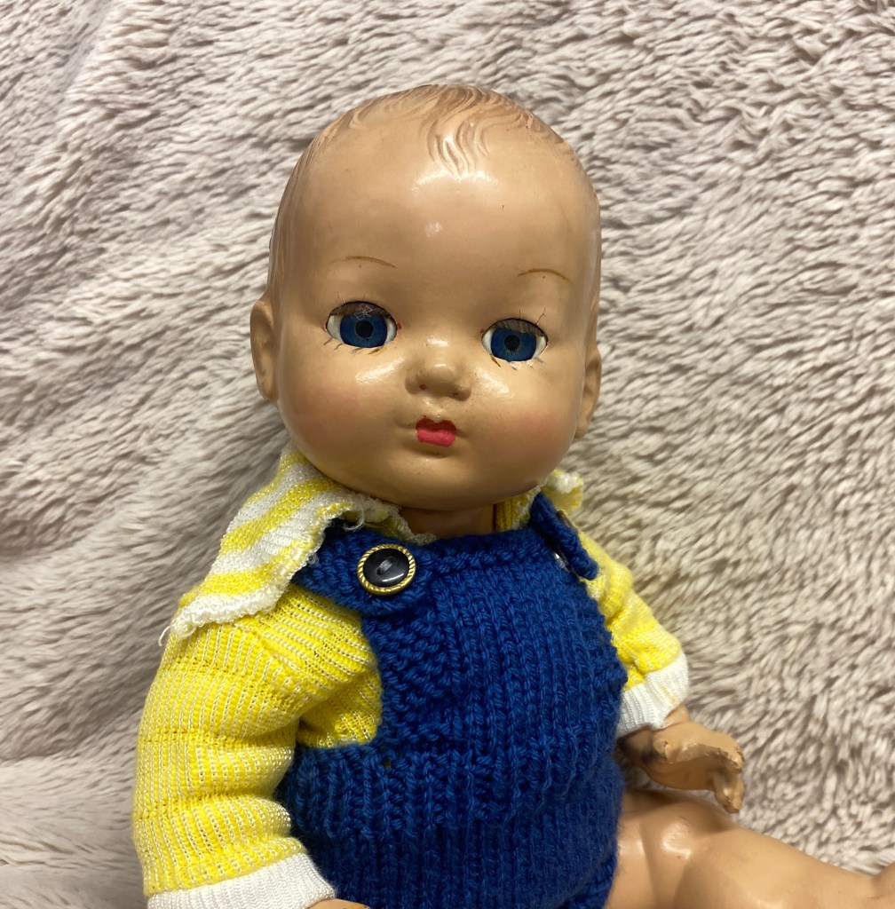 Christian is a 1930’s antique British Rosebud composition baby doll with nice colour and blue sleep eyes with all lashes. 13 inches in height, Christian has light playwear but overall very good for his years, no cracks/chips cracks to his composition and all fingers/toes are intact. He wears vintage yellow top along with adorable navy dungarees knitted by my mum. FREE UK SHIPPING!