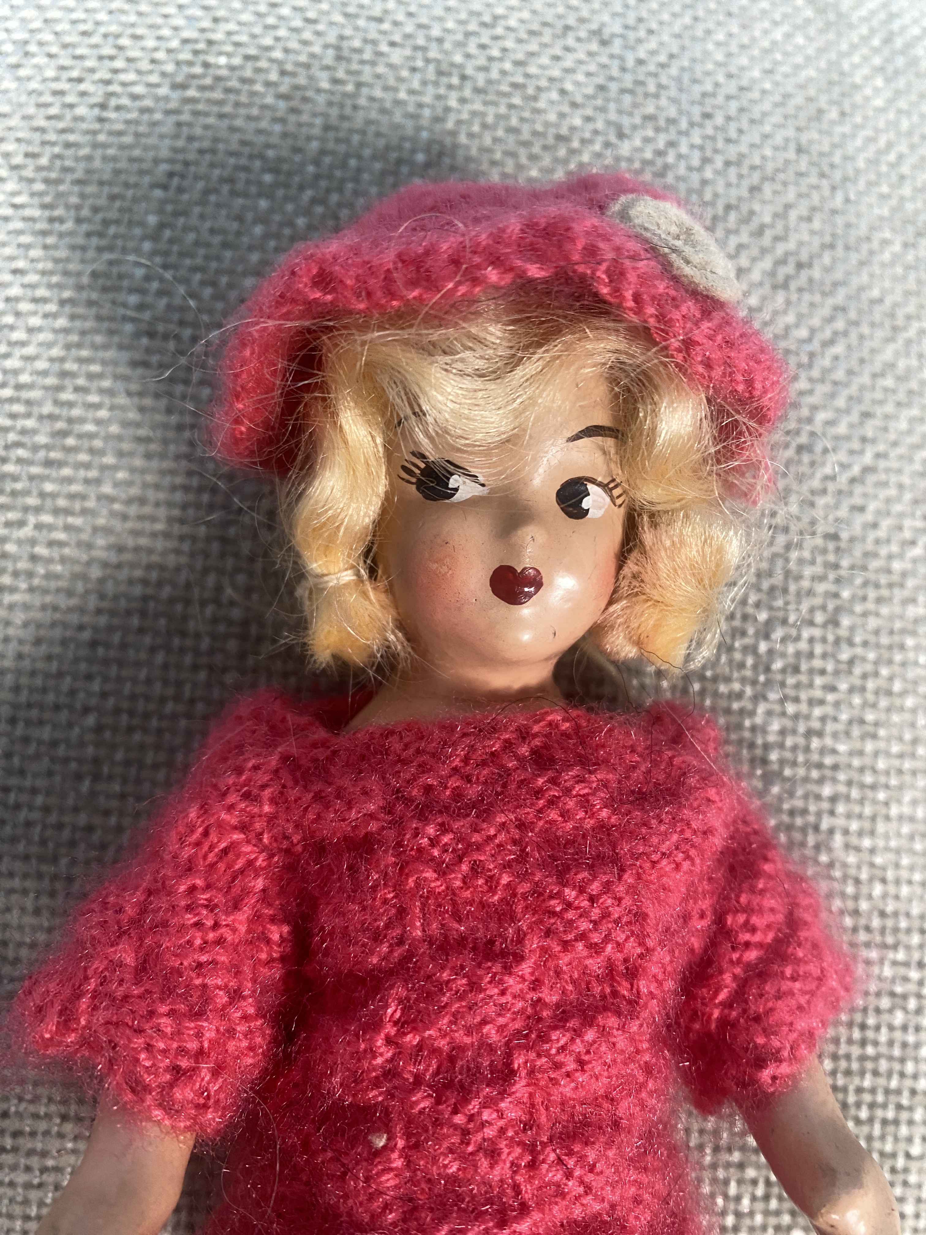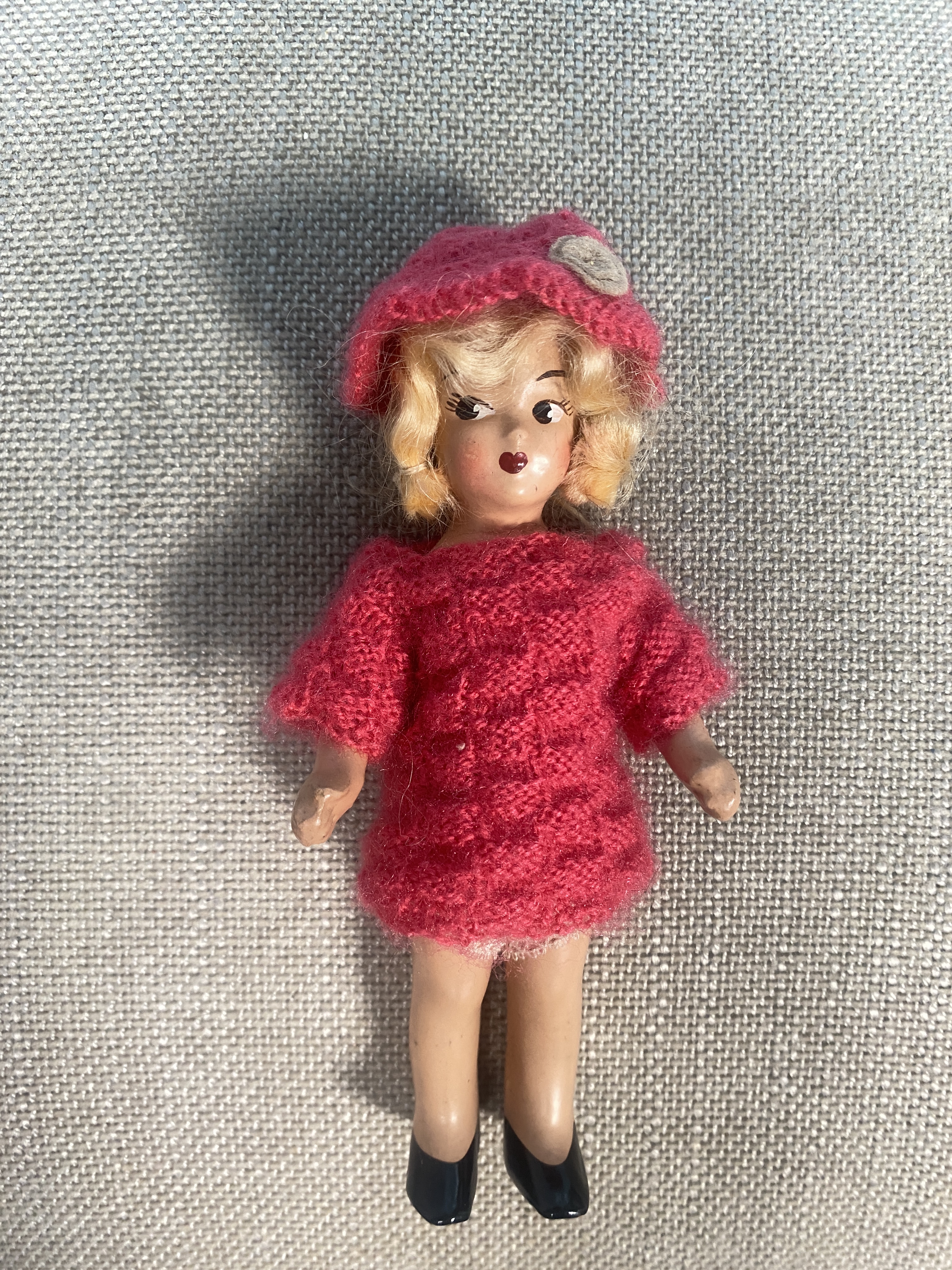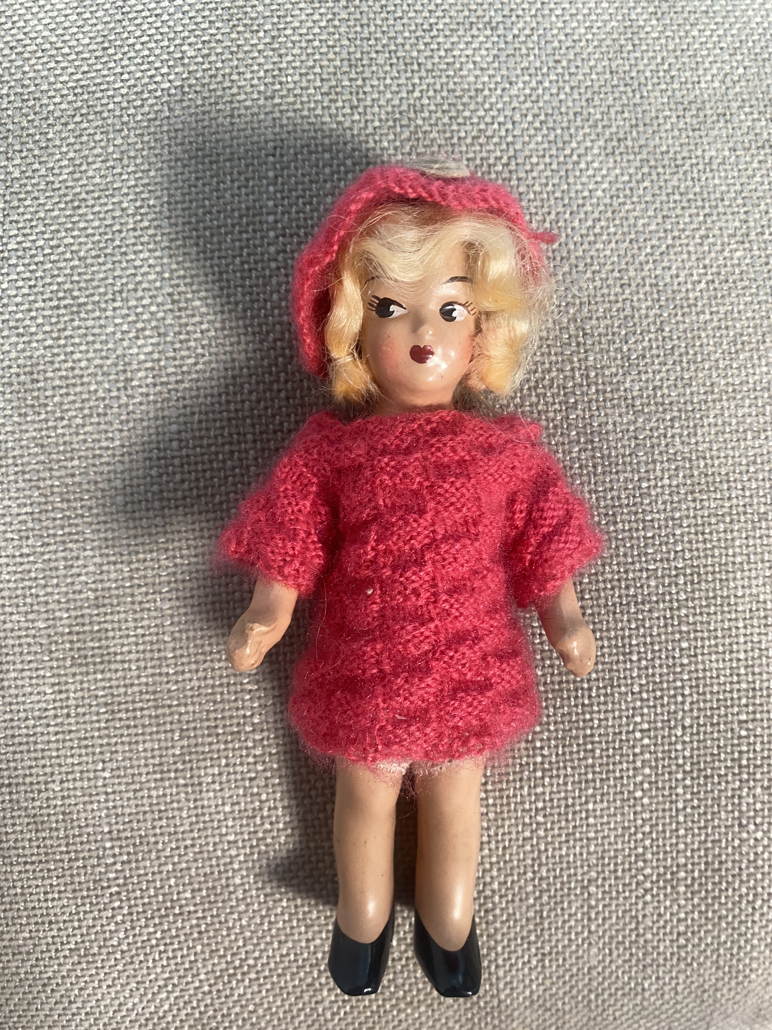 Joyce is a circa 1940’s American antique composition doll (unmarked), a nice smaller size of 7 inches, Joyce has jointed arms and is in lovely clean condition for her years. She comes just as shown in adorable vintage knitted outfit. FREE UK SHIPPING!