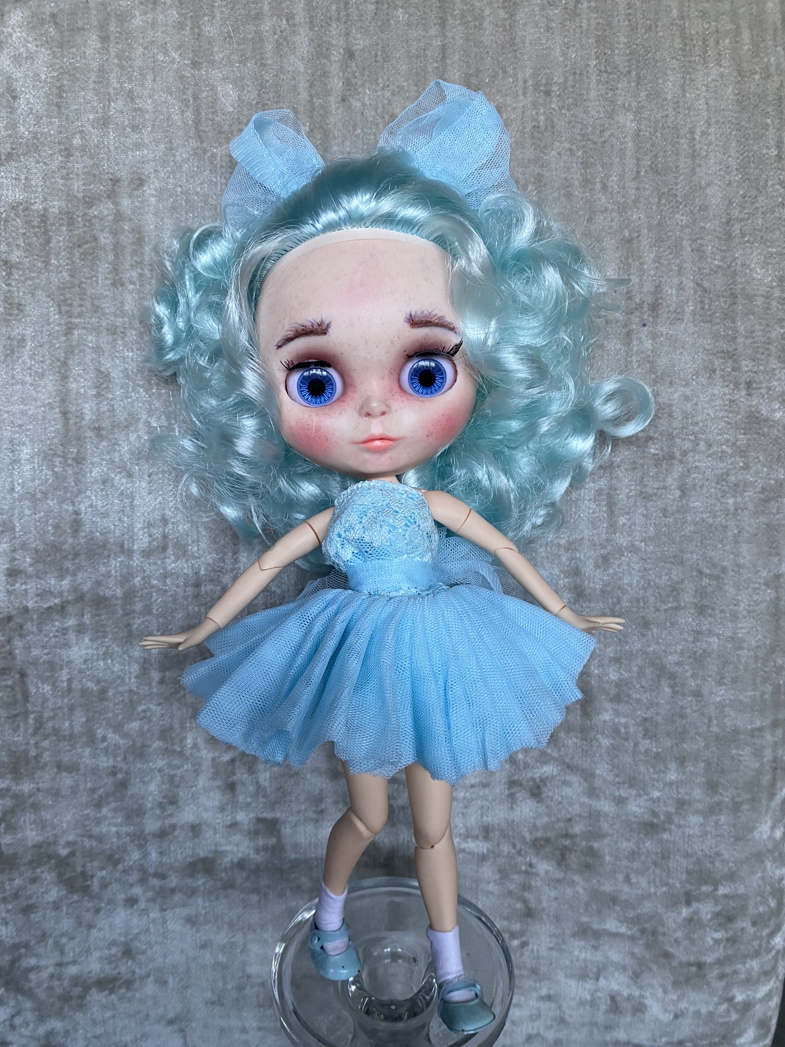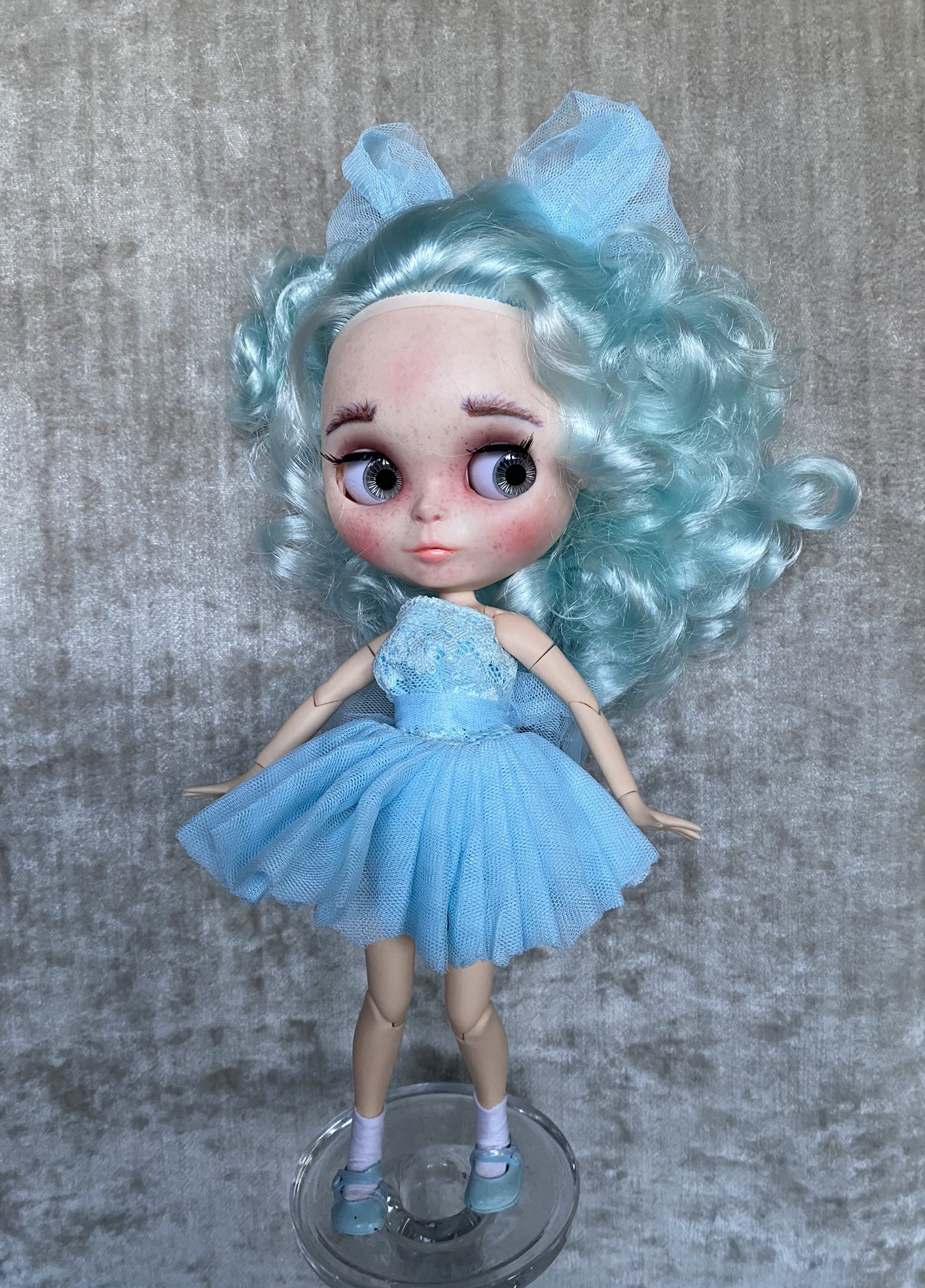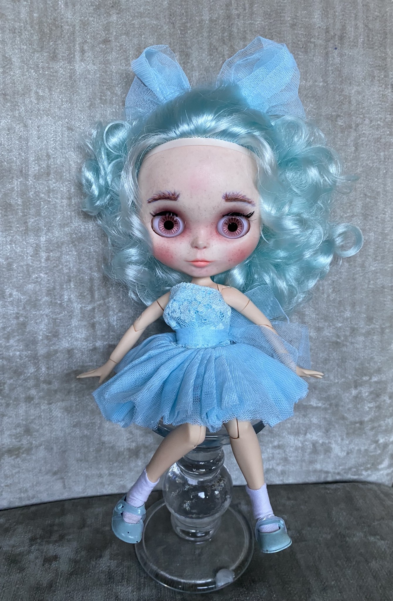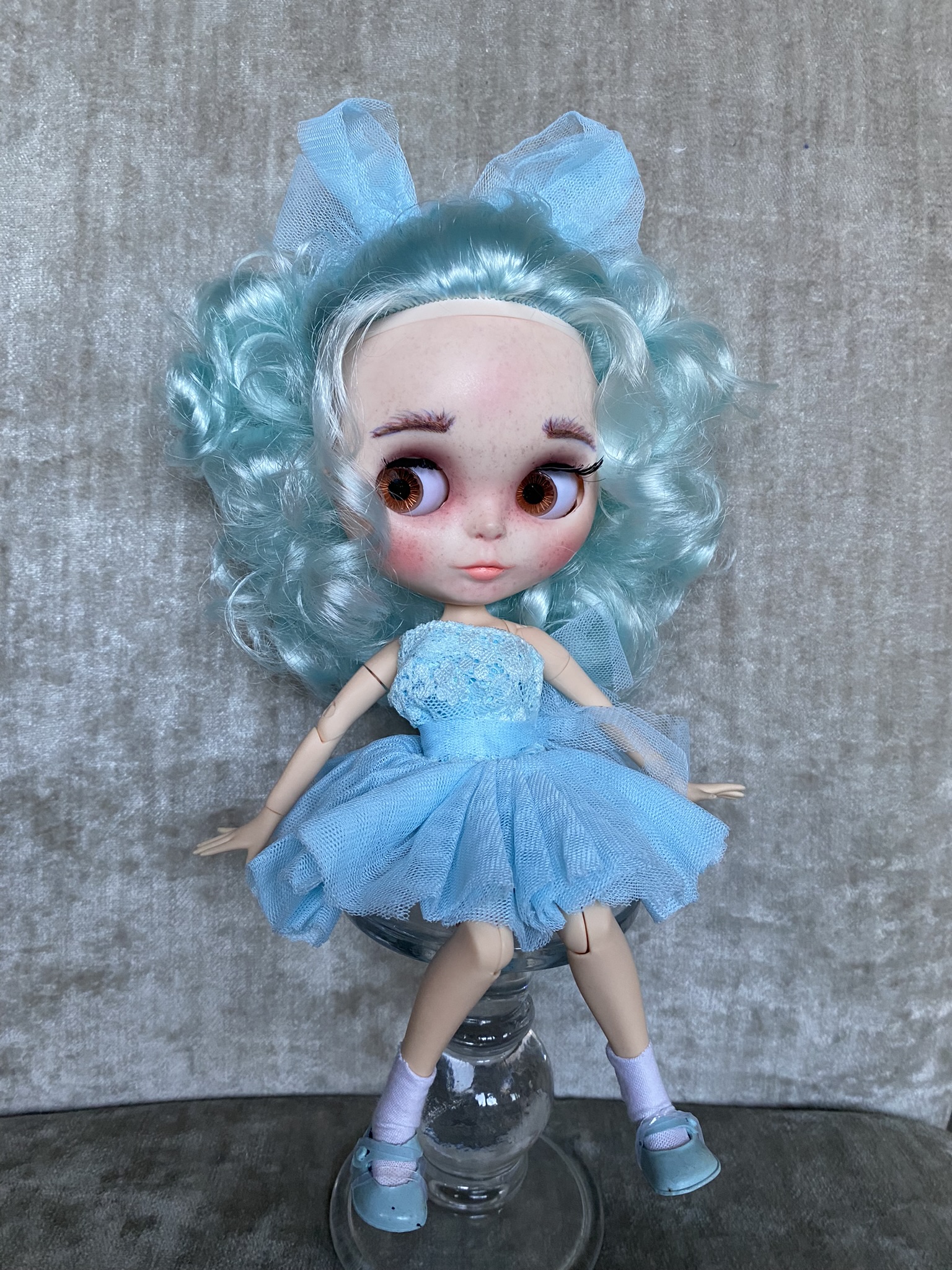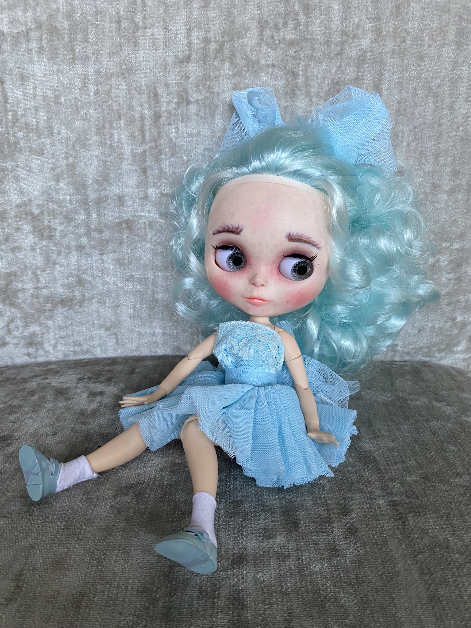 Here’s Sky, my Ooak custom “Little Girl Blue” factory Blythe doll with 4 random eye changes (operated via a pull string at the back of her head) and multi jointed posing body. Sky comes perfectly co-ordinated in her party dress, ribbons and shoes to compliment her stunning ocean blue hair!. I’ve given Sky a custom face-up using professional quality products and sealed each layer with MSC.