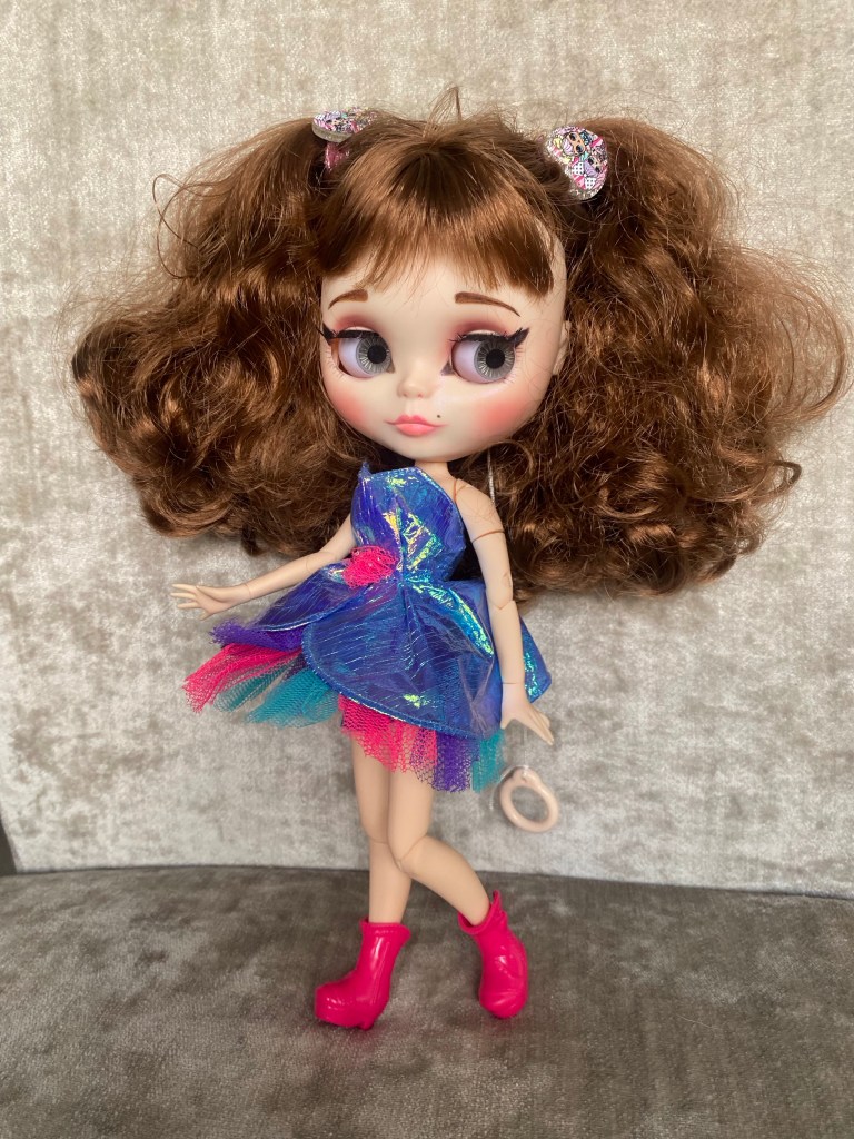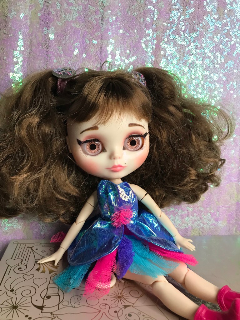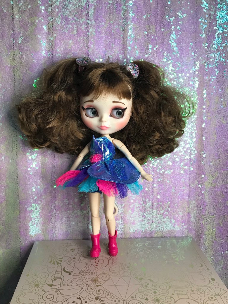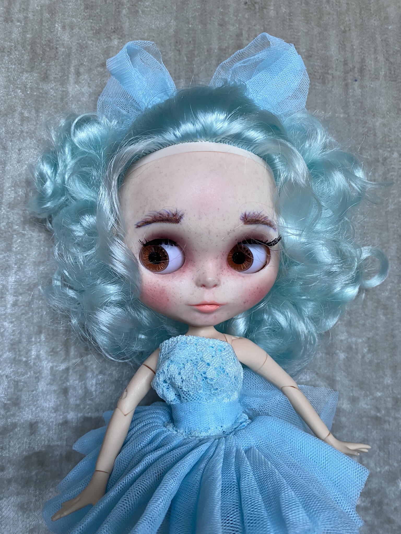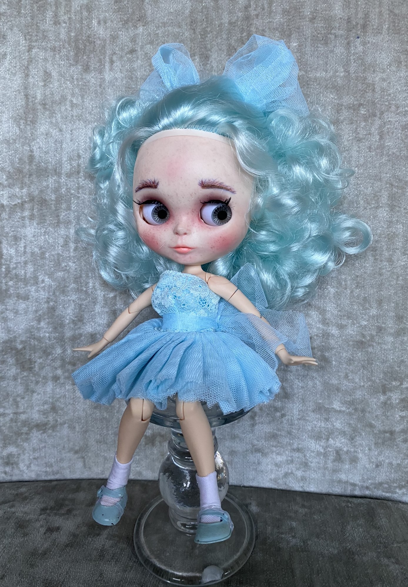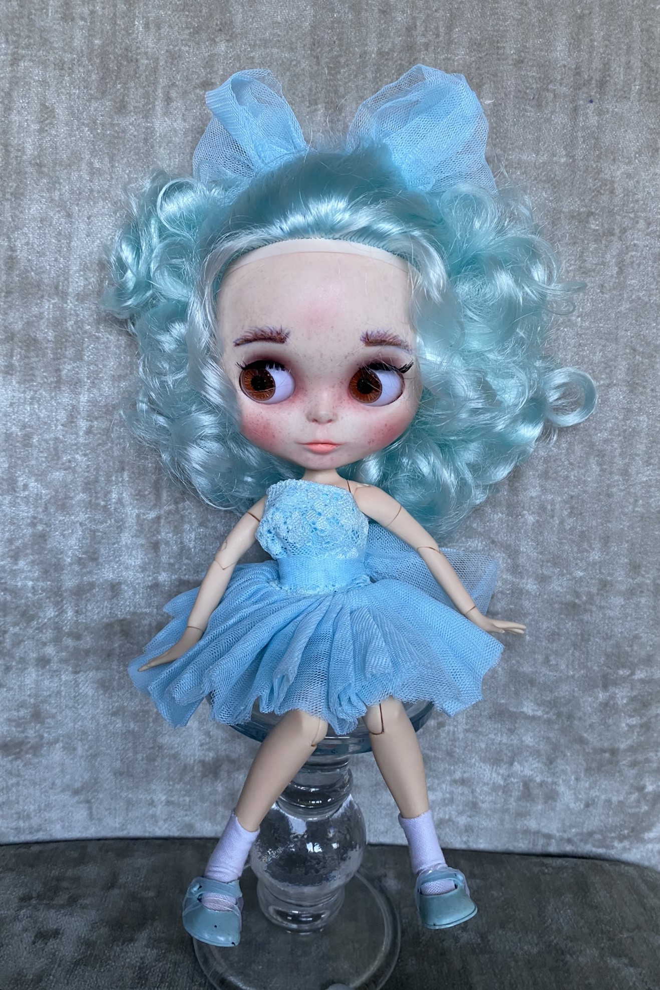 Here’s Sky, my Ooak custom “Little Girl Blue” factory Blythe doll with 4 random eye changes (operated via a pull string at the back of her head) and multi jointed posing body. Sky comes perfectly co-ordinated in her party dress, ribbons and shoes to compliment her stunning ocean blue hair!. I’ve given Sky a custom face-up using professional quality products and sealed each layer with MSC.