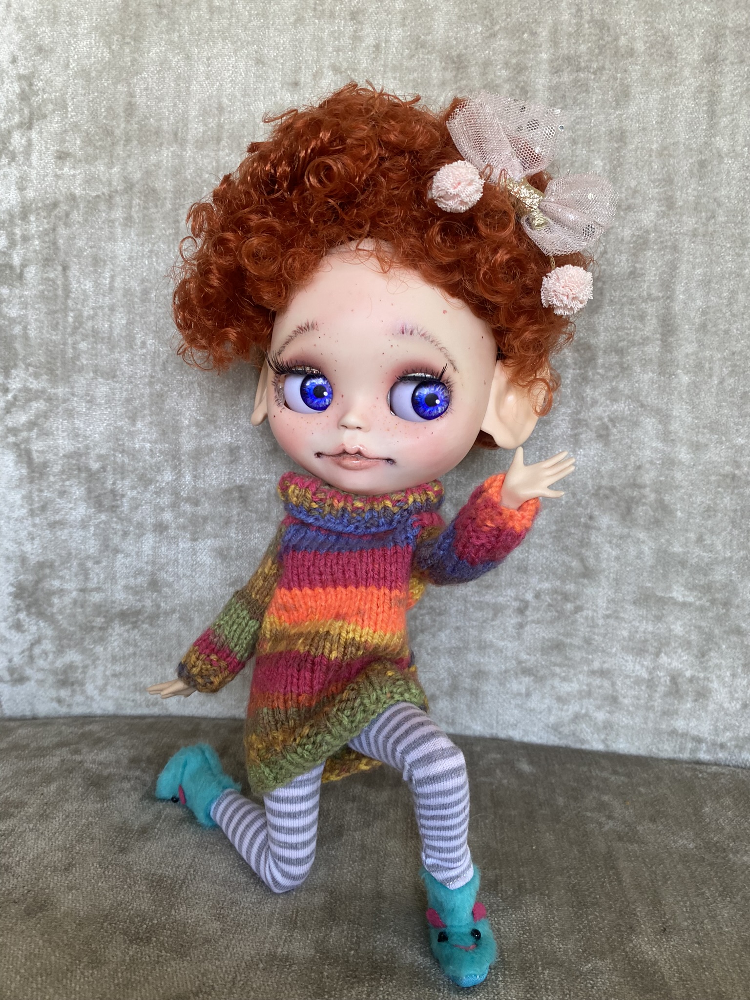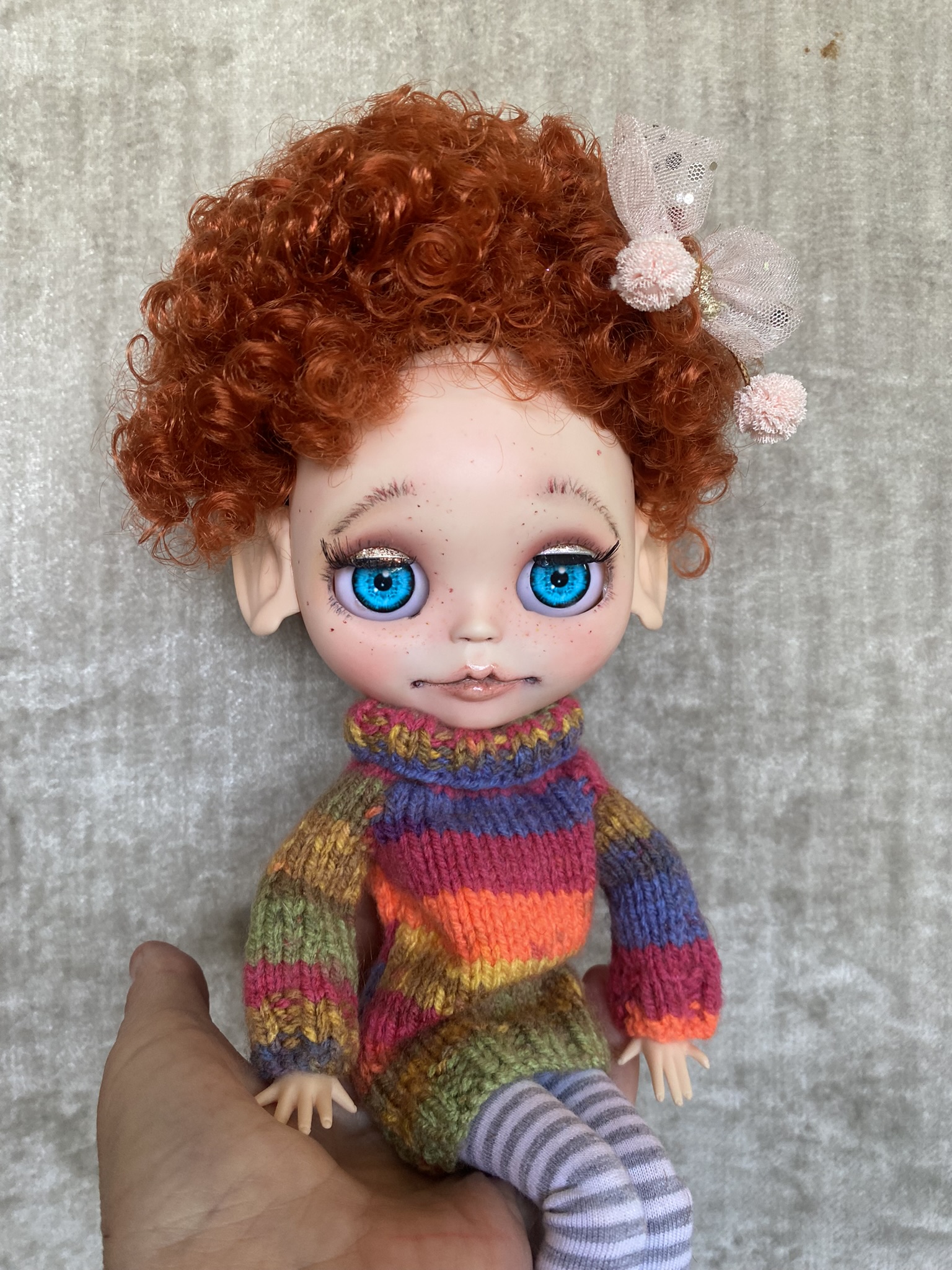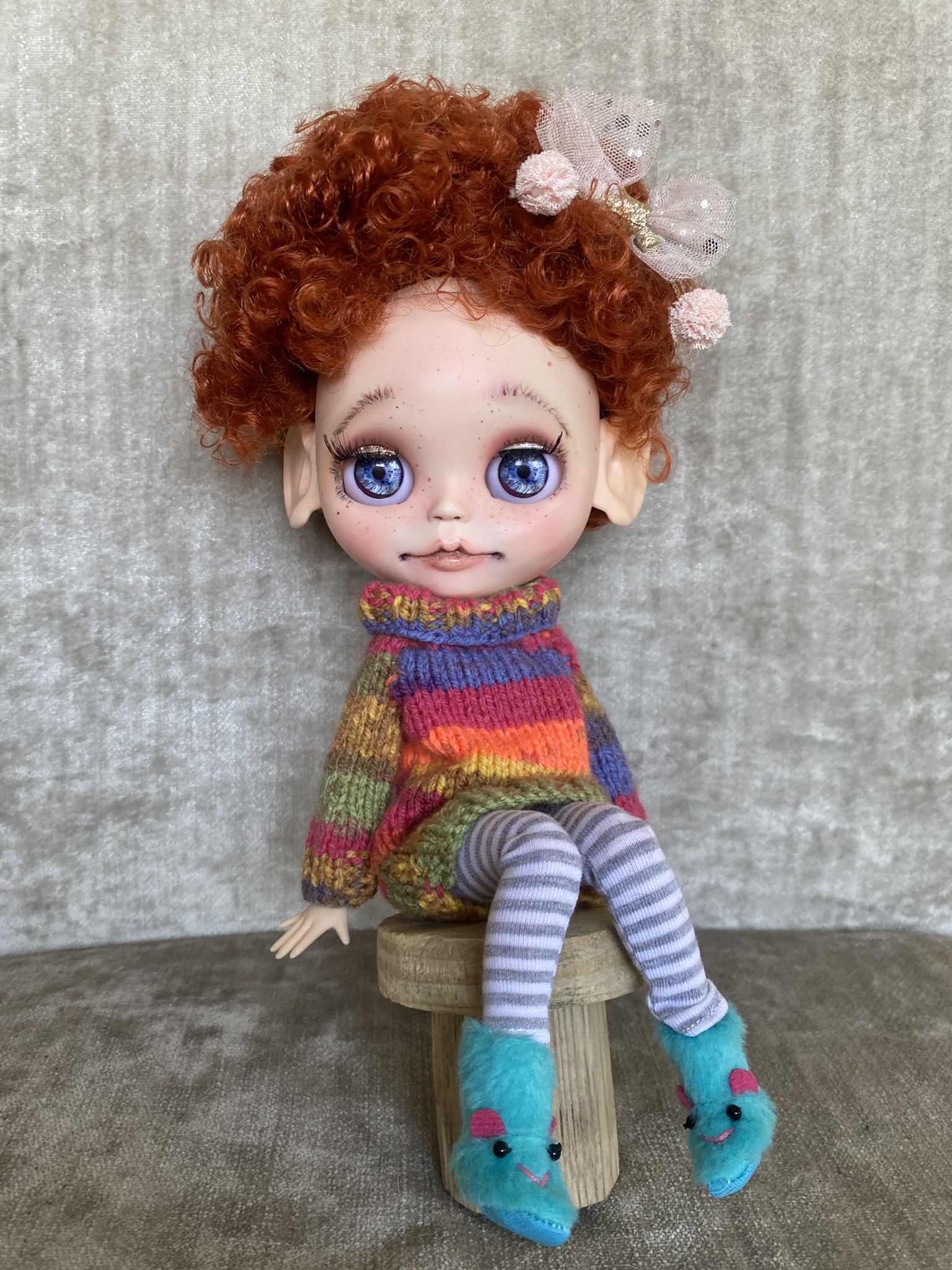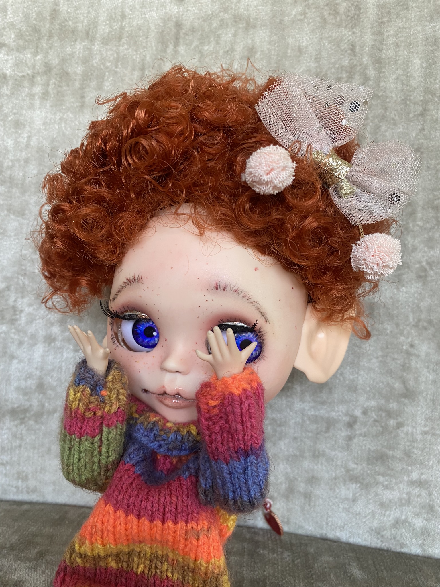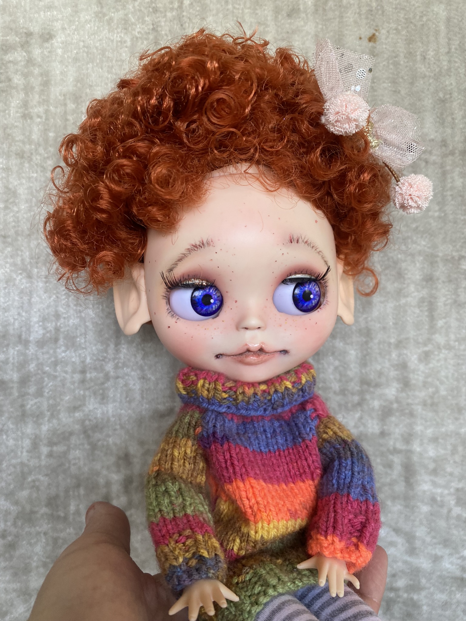 Woohoo she’s here!!.. Rusty is my Ooak custom factory Blythe Pixie doll hand customised by me the dollyfairy. I’ve hand carved Rusty’s nose, lips, chin, cheeks and philtrim, opened her nostrils, raised and corrected her gaze, fitted 4 new sets of detailed 3D eye chips, given her sleepy eyes (2 strings with charms), glittery rusty gold lids, cutest big ears and super thick mass of red corkscrew curls. “Rusty’s” totally unique face up has been created by me with professional quality products, each layer sealed with MSC. She comes just as pics in her hand knitted jumper, stripey leggings and adorable furry boots. There’s only one of Rusty in the world, she’s been eagely anticipated so don’t miss her!.