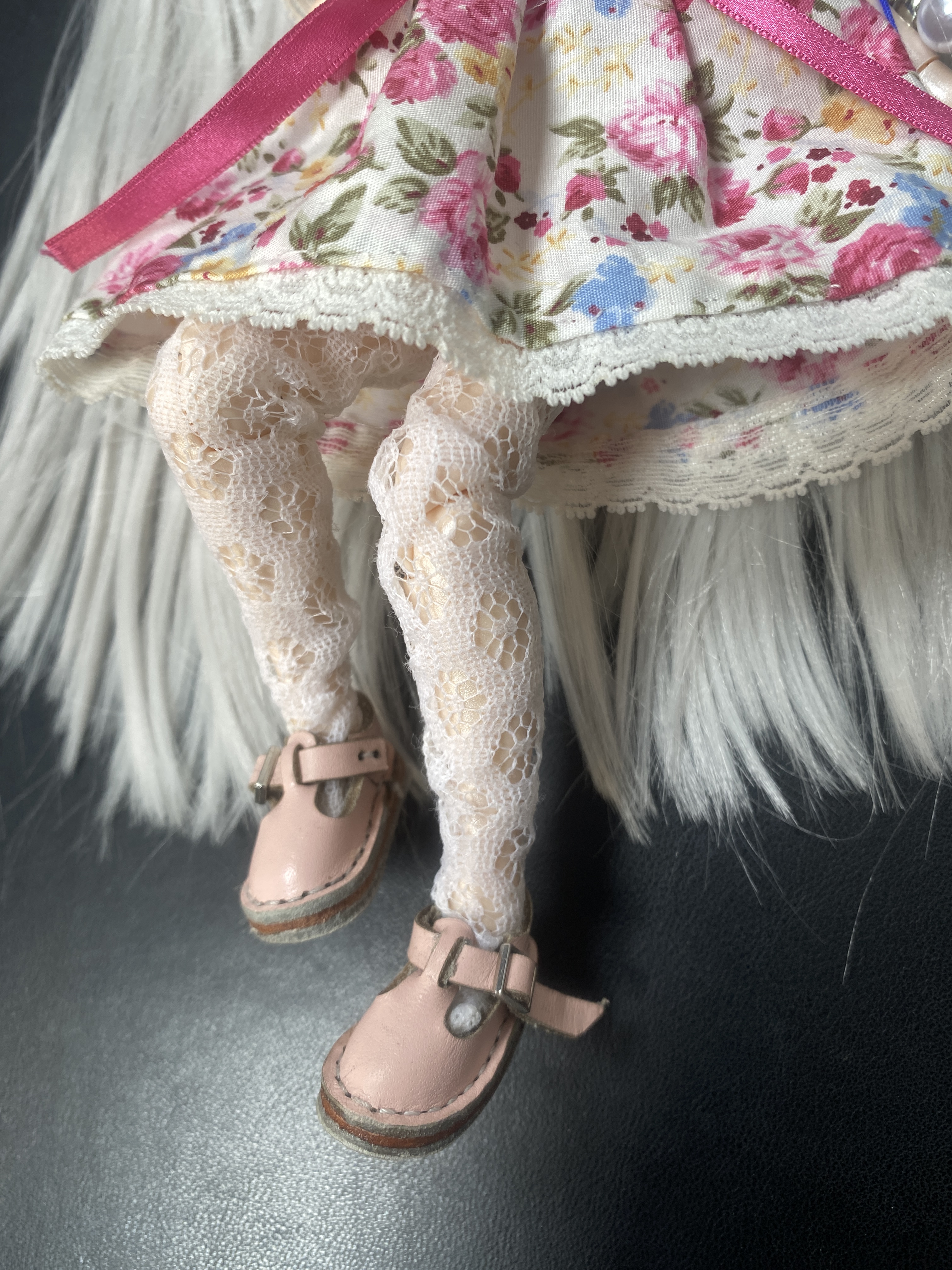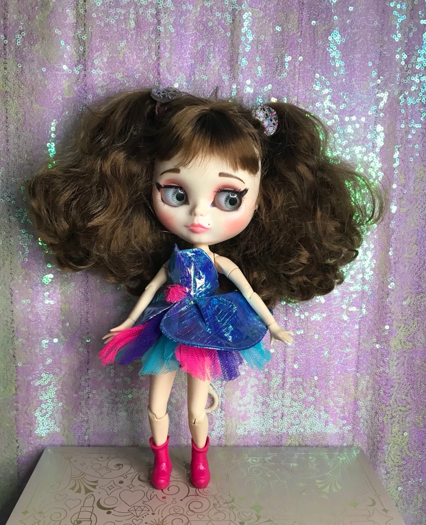 Here’s Mindi, my light custom factory Blythe doll, all ready to party in her vintage Barbie dress and matching bright pink heeled boots. I’ve given Mindi a light custom face-up using professional quality products and sealed each layer with MSC.
