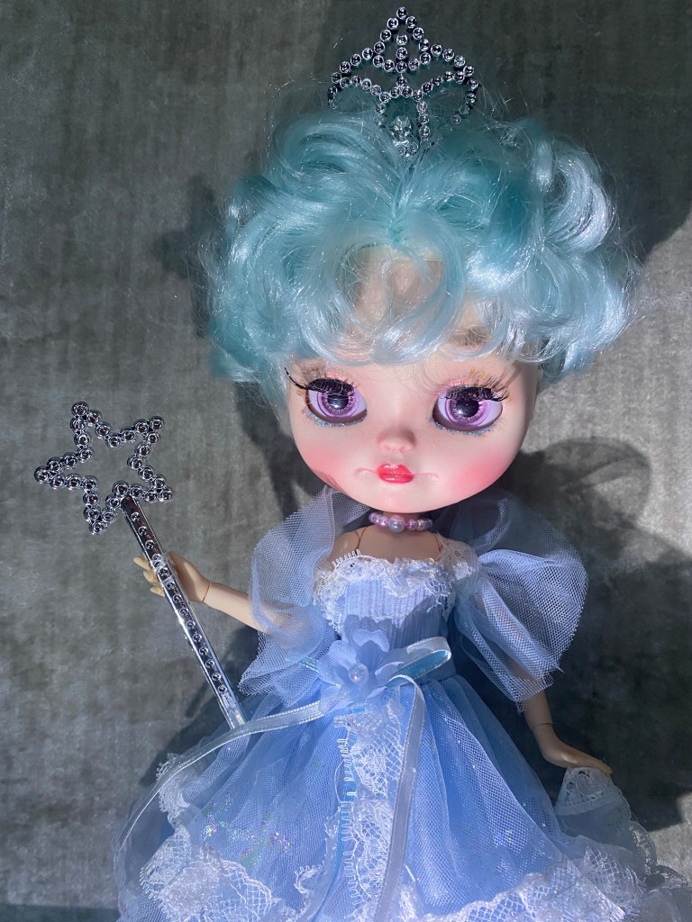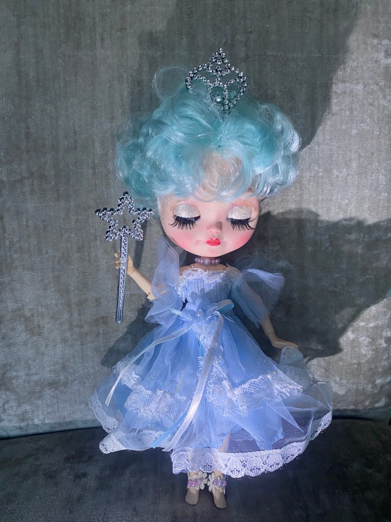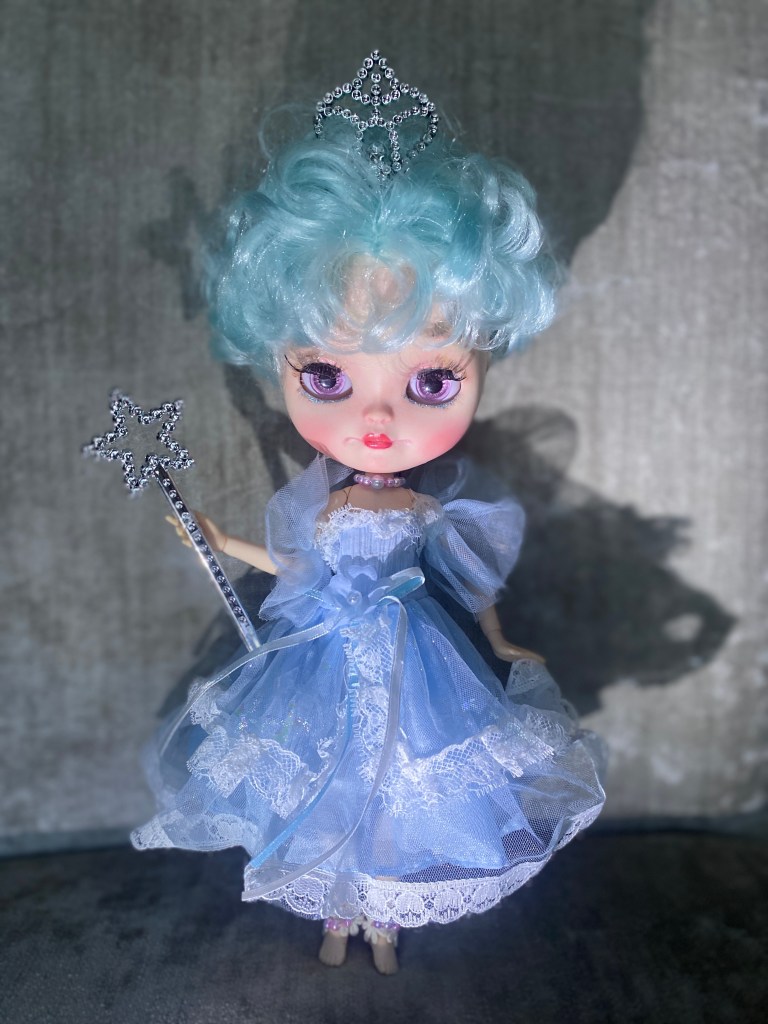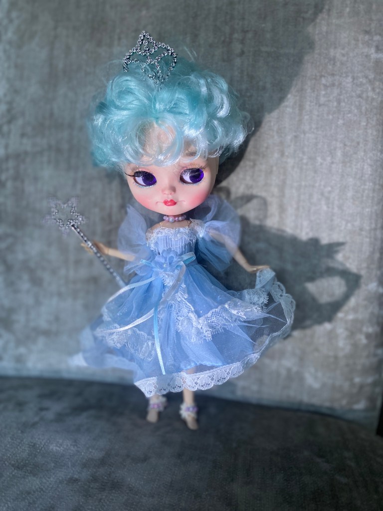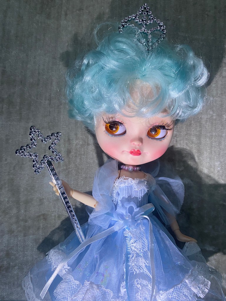 Fairy Lyra is my sparkly fairy girl ICY factory base Blythe doll complete with ooak custom face up done by me The Dolly Fairy. I’ve hand carved her mouth, nose, chin and philtrim, opened her nostrils, created rosebud lips, rosy pearlescent complexion, glittery lids and dainty sprinkling of fairy eye dust. I’ve given her sleepy eyes with 2 strings and pretty beads. Each layer of her artwork has been sealed with MSC UV flat along with semi gloss to finish. Fairy Lyra comes to you just as seen in her photos with elegant soft blue lace trimmed fairy dress, wand and tiarra hair bow. Fairy Lyra promises she’s not just for christmas she sprinkles her magic the whole year round!.