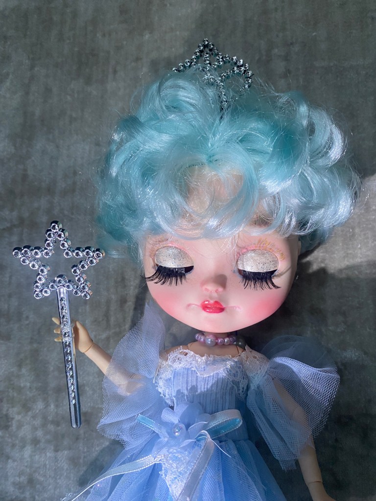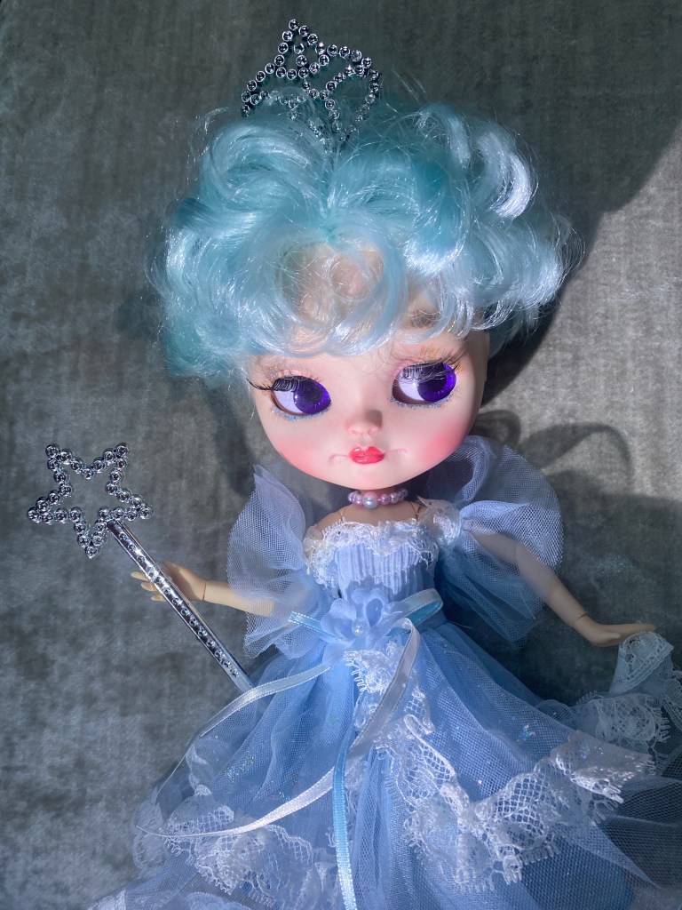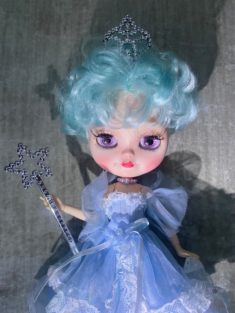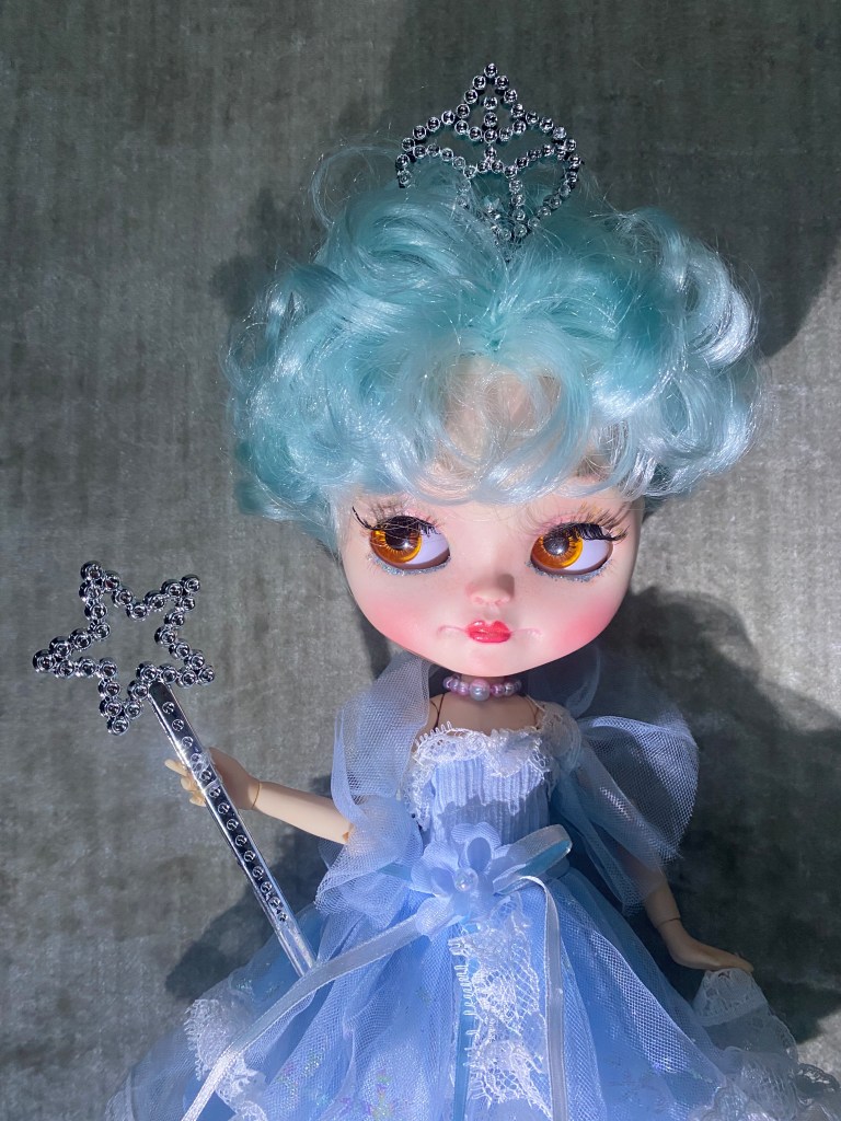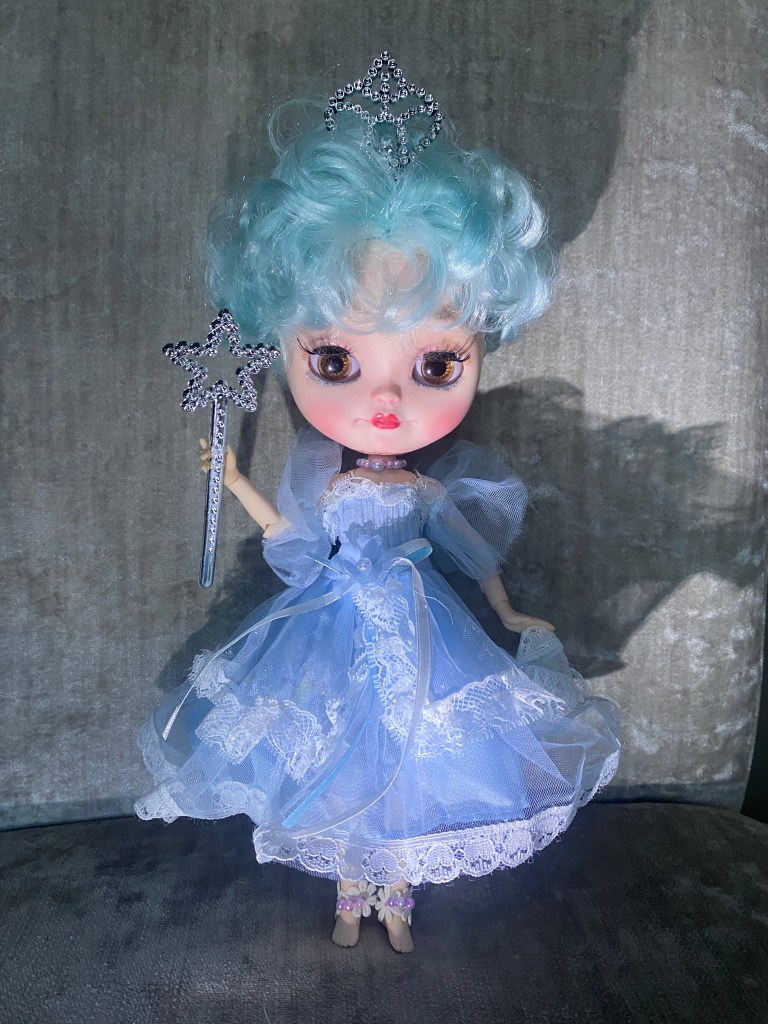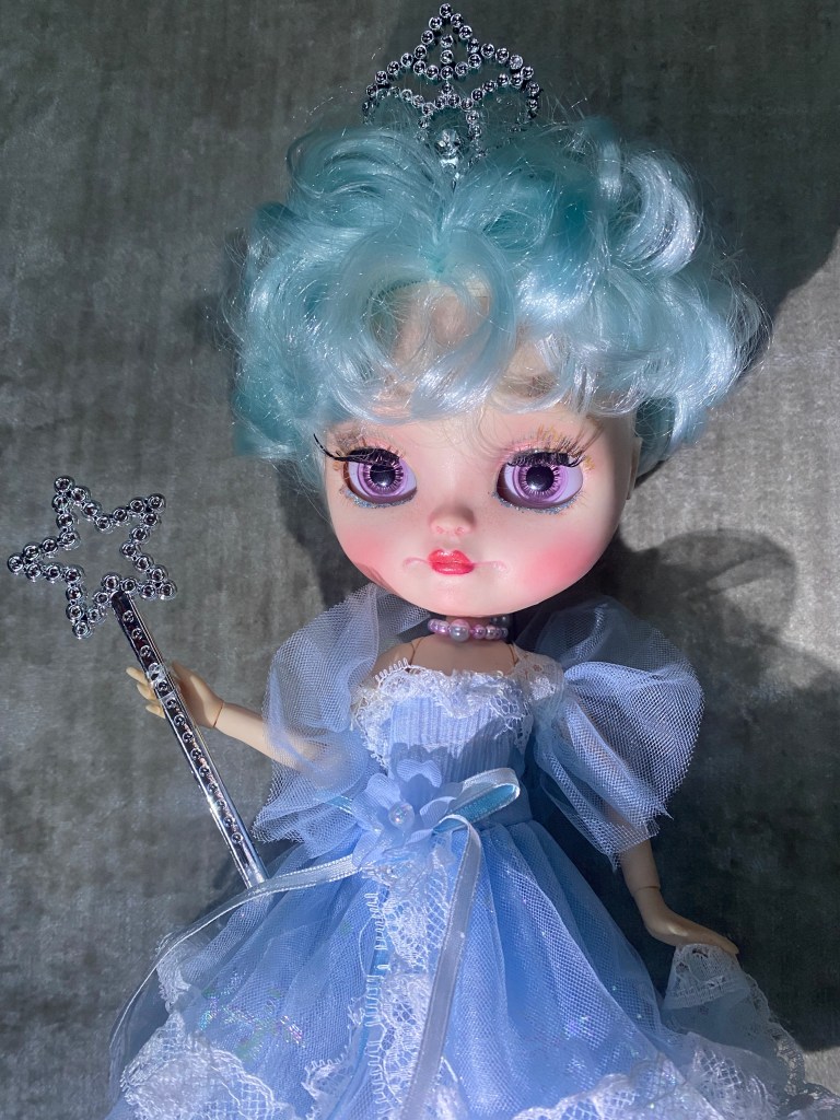 Fairy Lyra is my sparkly fairy girl ICY factory base Blythe doll complete with ooak custom face up done by me The Dolly Fairy. I’ve hand carved her mouth, nose, chin and philtrim, opened her nostrils, created rosebud lips, rosy pearlescent complexion, glittery lids and dainty sprinkling of fairy eye dust. I’ve given her sleepy eyes with 2 strings and pretty beads. Each layer of her artwork has been sealed with MSC UV flat along with semi gloss to finish. Fairy Lyra comes to you just as seen in her photos with elegant soft blue lace trimmed fairy dress, wand and tiarra hair bow. Fairy Lyra promises she’s not just for christmas she sprinkles her magic the whole year round!.