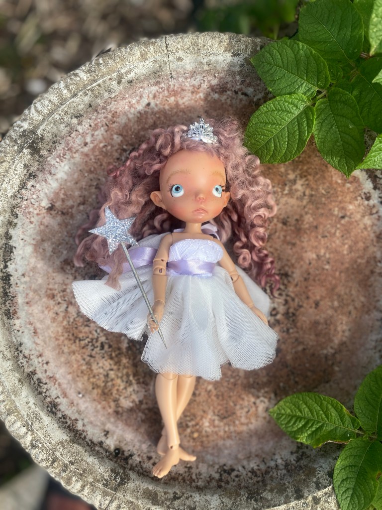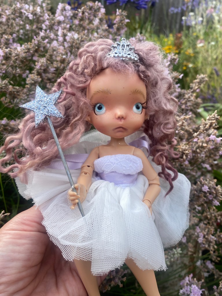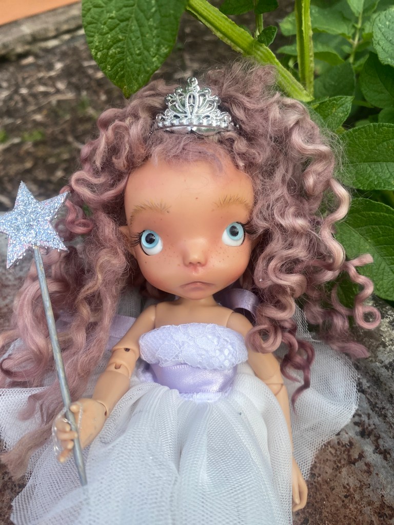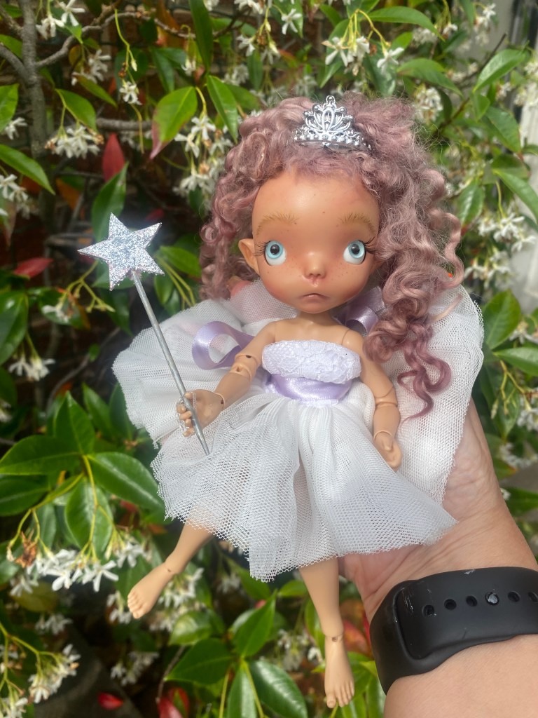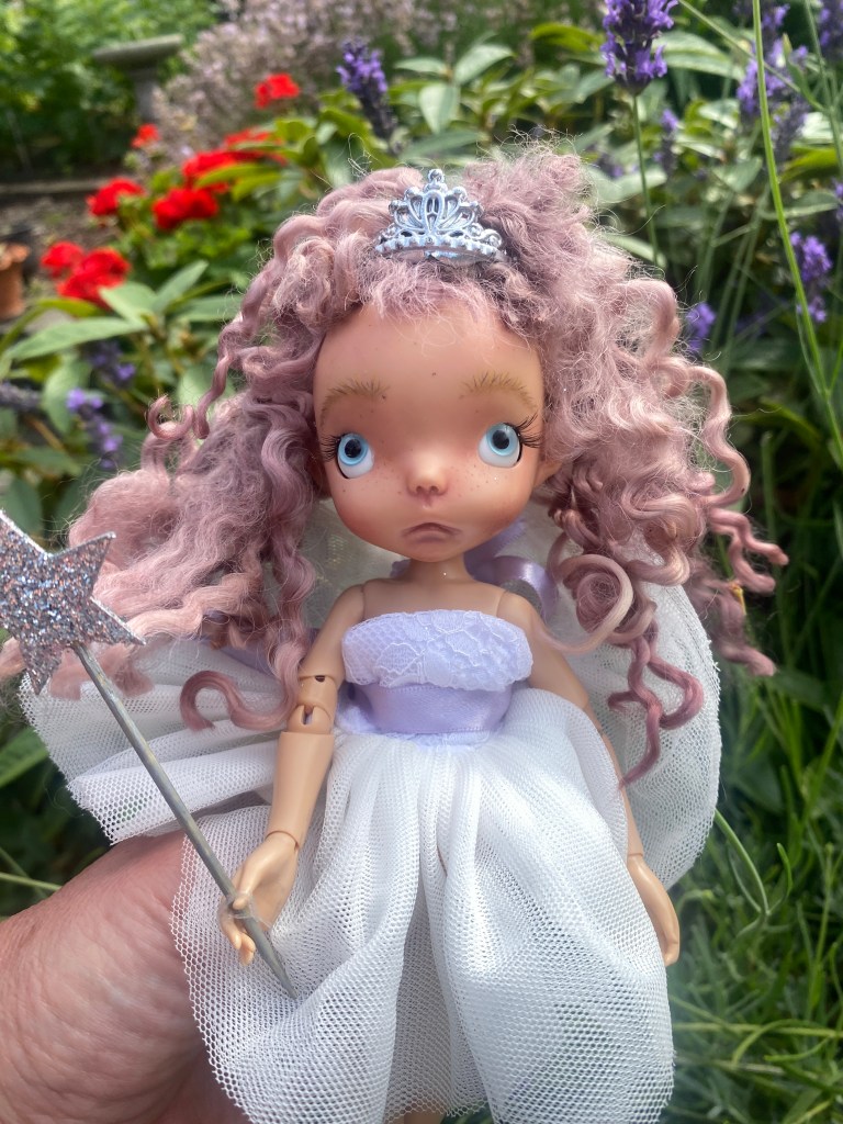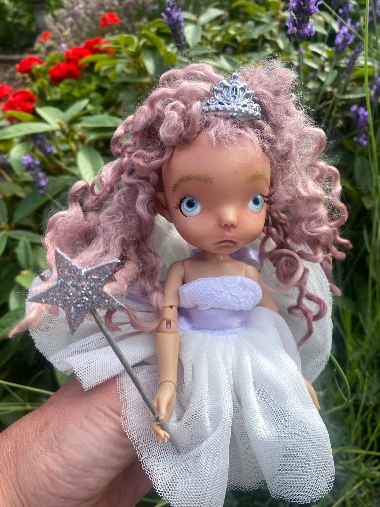 Fairy Lorrella is my ooak custom Bjd 1/6 scale doll fully hand customised by me “The Dolly Fairy”. Approx 26cm in height she’s a super quality all resin fully strung tan skin tone multi jointed BJD doll with super realistic posing ability. I created her face up using professional quality products (each layer sealed with MSC). I set Lorrella’s ocean blue glass eyes into a delightful upward glaze. I crafted her wig from pure Teeswater locks, sourced from a very loved and cared for small flock of sheep in Devon. She comes just as her photos in her fairy dress, wand and tiara crown to her hair.