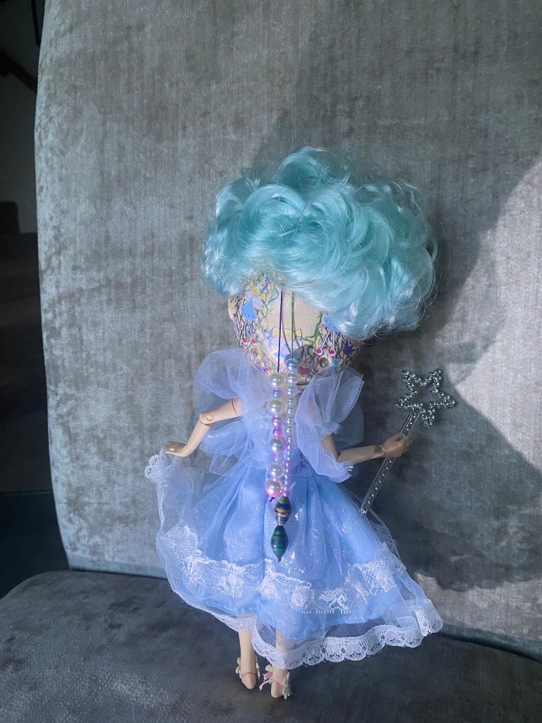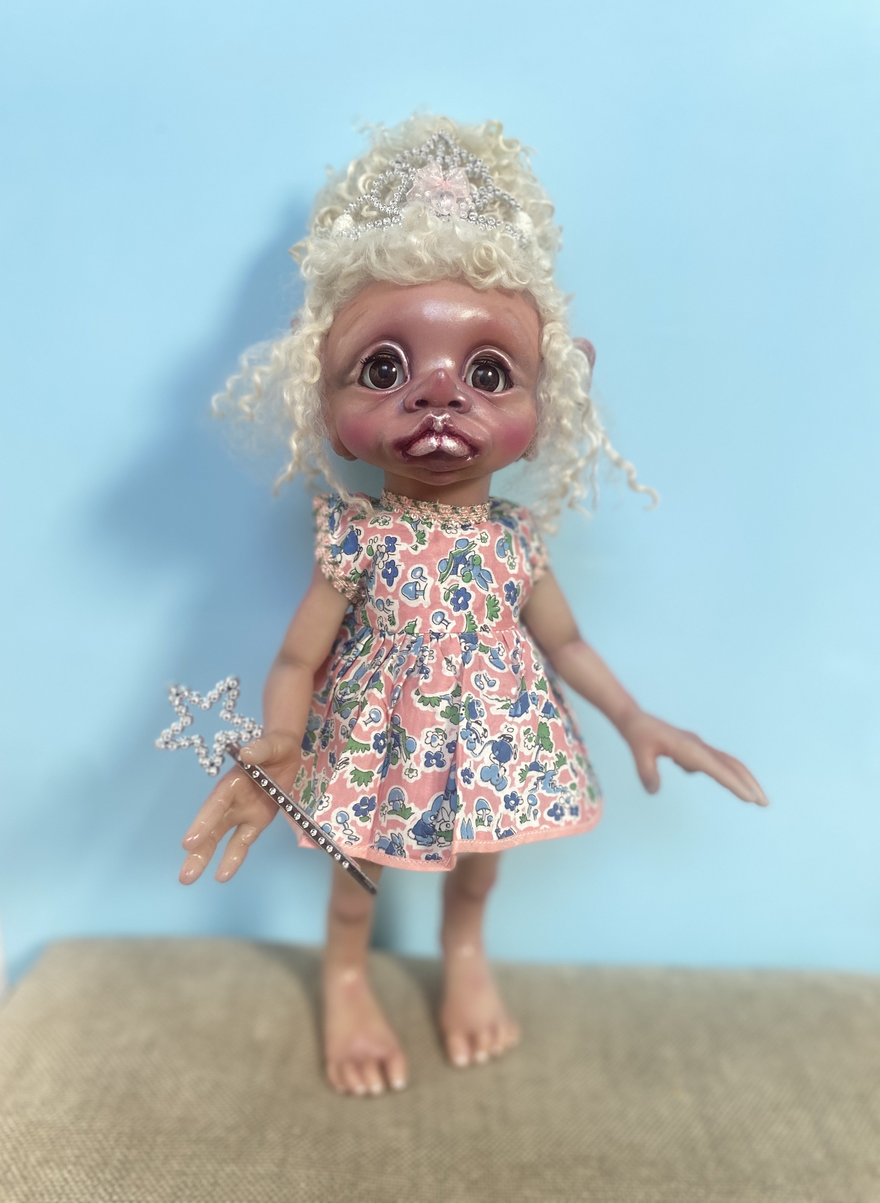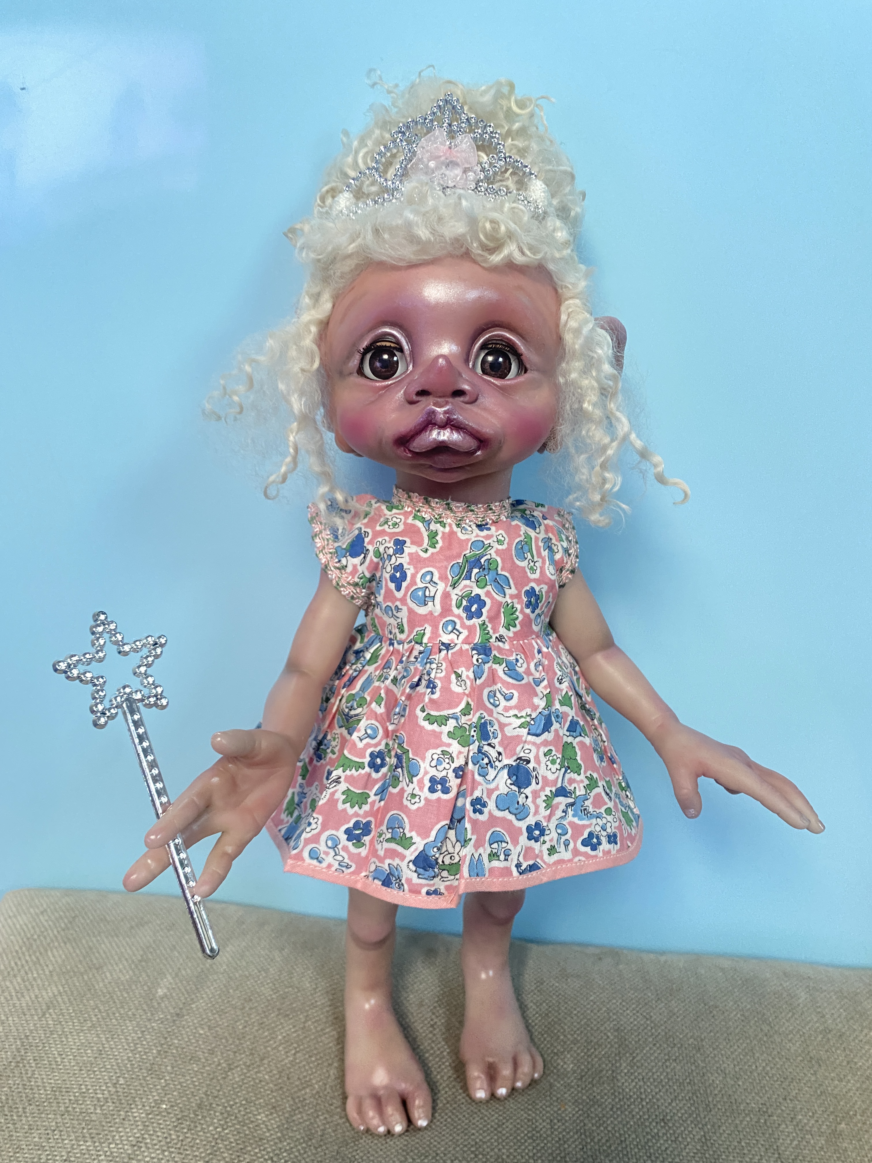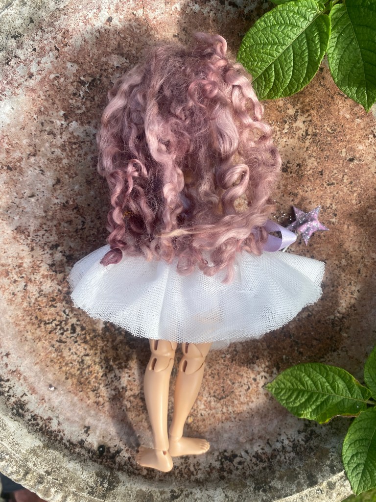 Fairy Lorrella is my ooak custom Bjd 1/6 scale doll fully hand customised by me “The Dolly Fairy”. Approx 26cm in height she’s a super quality all resin fully strung tan skin tone multi jointed BJD doll with super realistic posing ability. I created her face up using professional quality products (each layer sealed with MSC). I set Lorrella’s ocean blue glass eyes into a delightful upward glaze. I crafted her wig from pure Teeswater locks, sourced from a very loved and cared for small flock of sheep in Devon. She comes just as her photos in her fairy dress, wand and tiara crown to her hair.