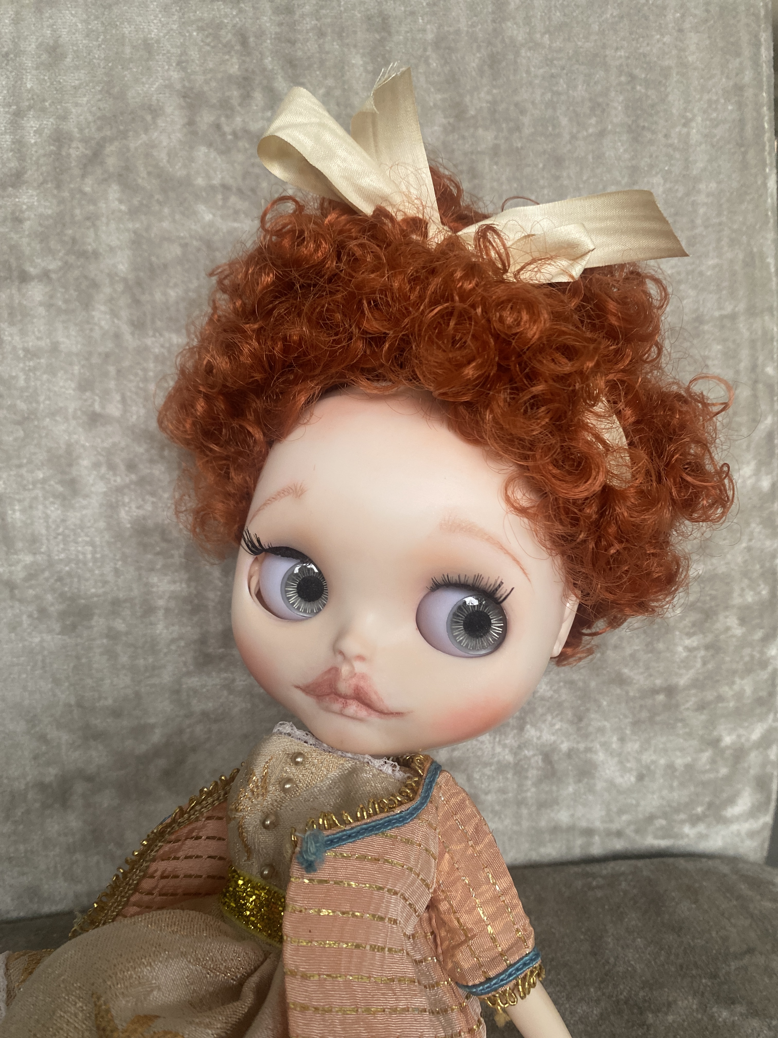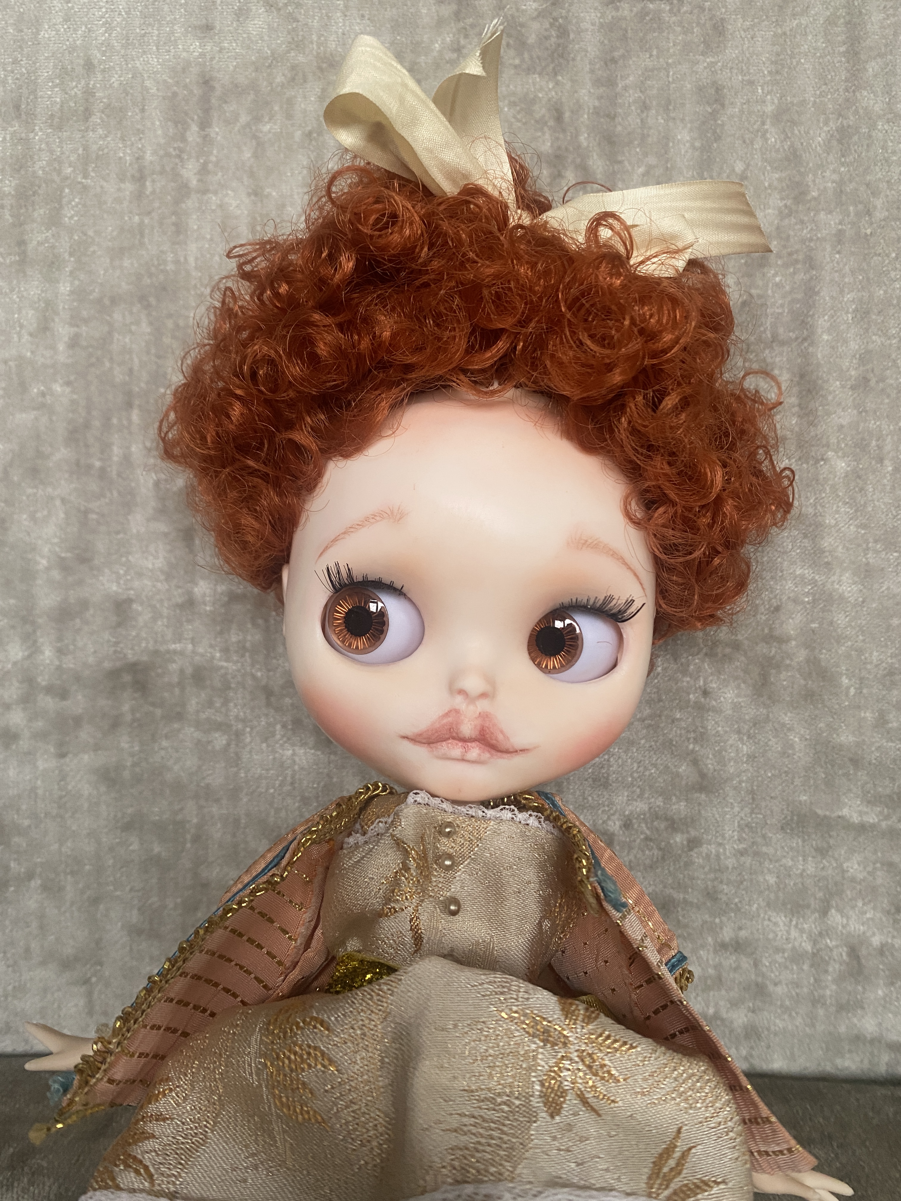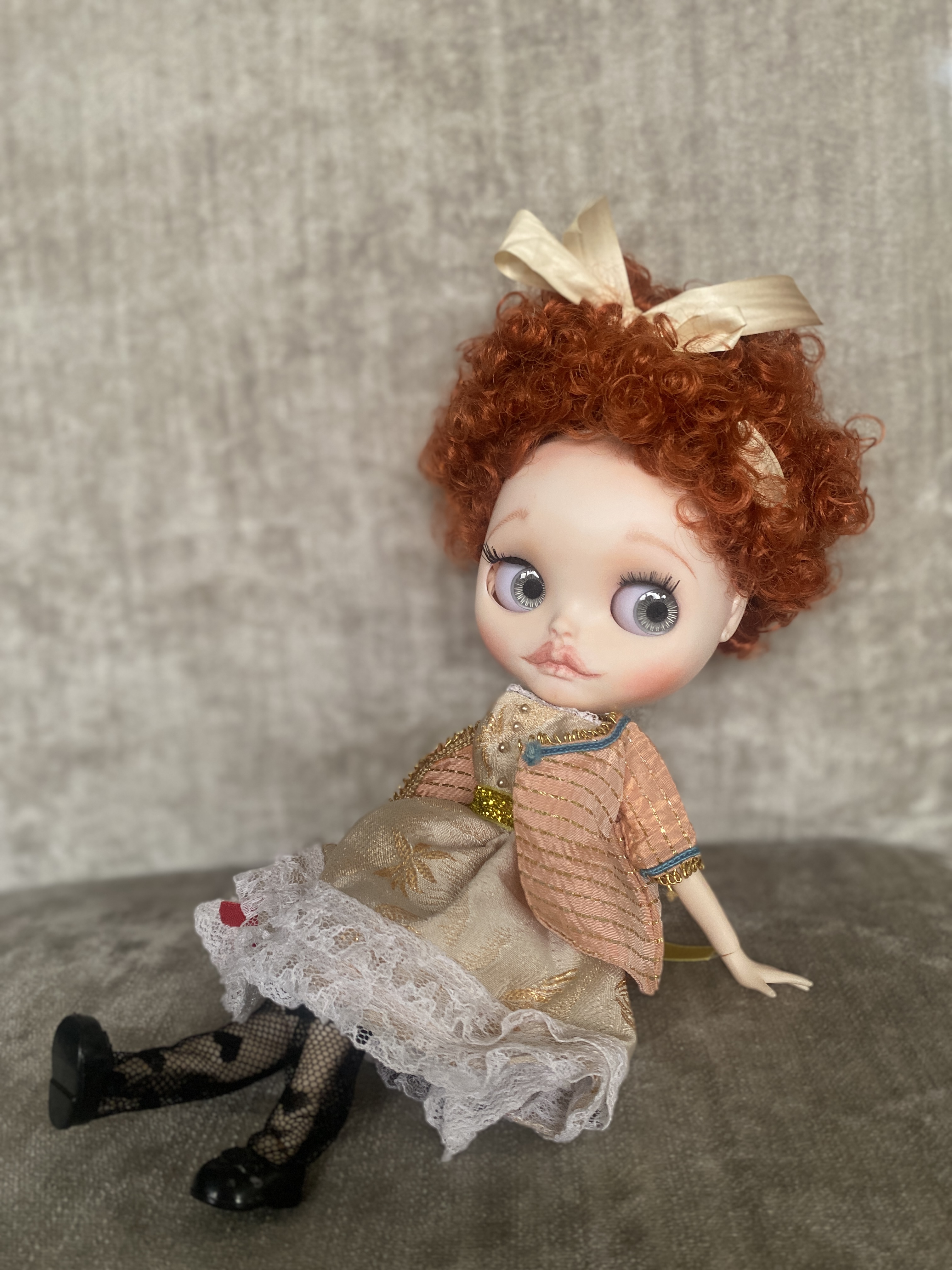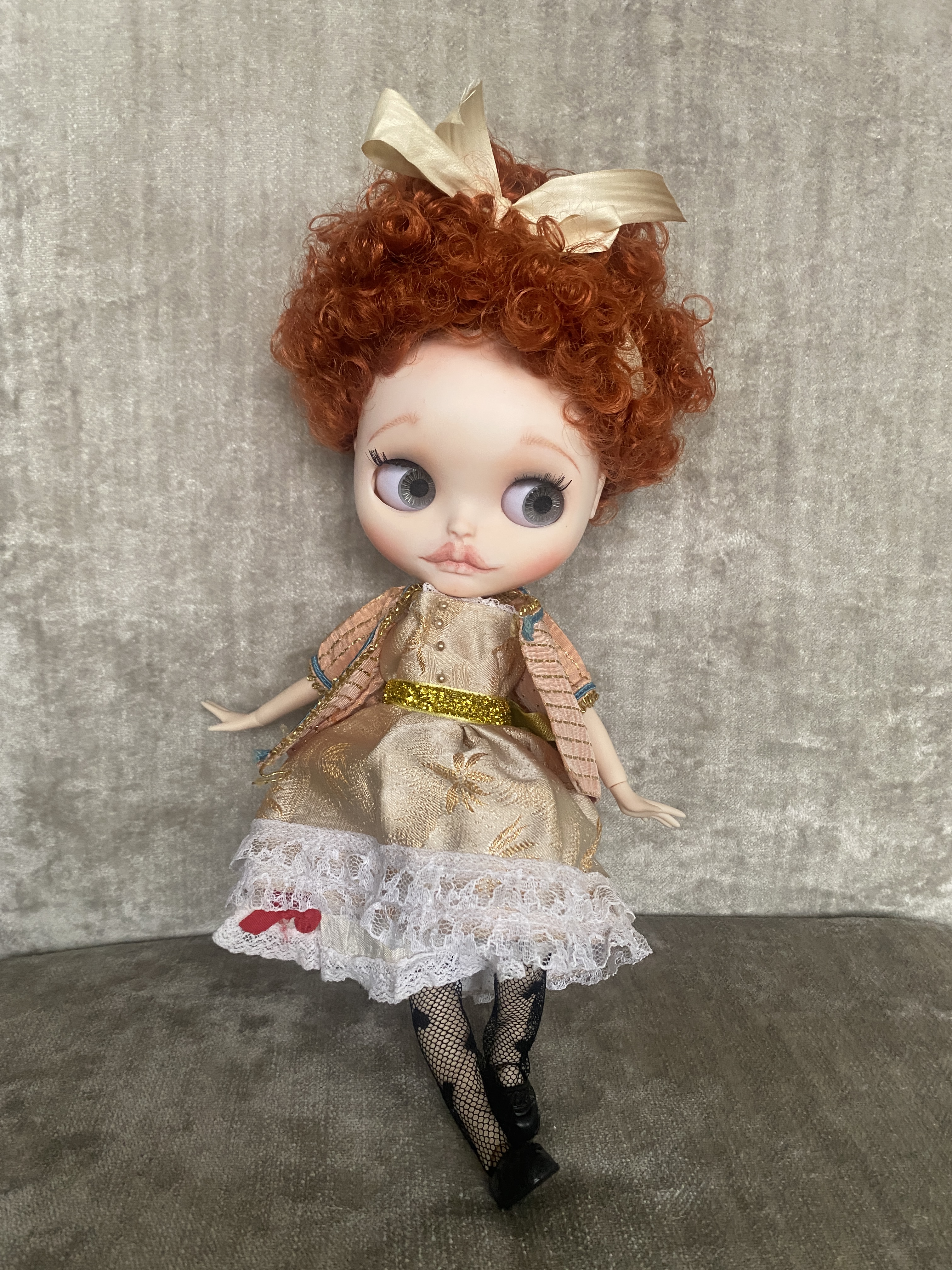 Oh la la meet Madame Renee!!.. she’s my one of a kind (Ooak) bespoke Blythe factory base doll hand customised by me the dollyfairy. I’ve hand carved Renee’s full pouty lips, philtrim and chin, raised her gaze, given her sleepy eyes (2 strings with beads and charms), added glittery gold lids and styled her super thick red corkscrew curls. Renee‘s unique face up has been created by me with professional quality products, each layer sealed with MSC. She comes just as her pics in her brocade dress, vintage jacket, lace waist slip (circa 1960’s) along with heart pattern seam stockings, vintage garter and black plastic loafers. Her hair ribbon is pure French silk from the 1920’s. There’s only one Madame Renee in the world don’t miss her!.