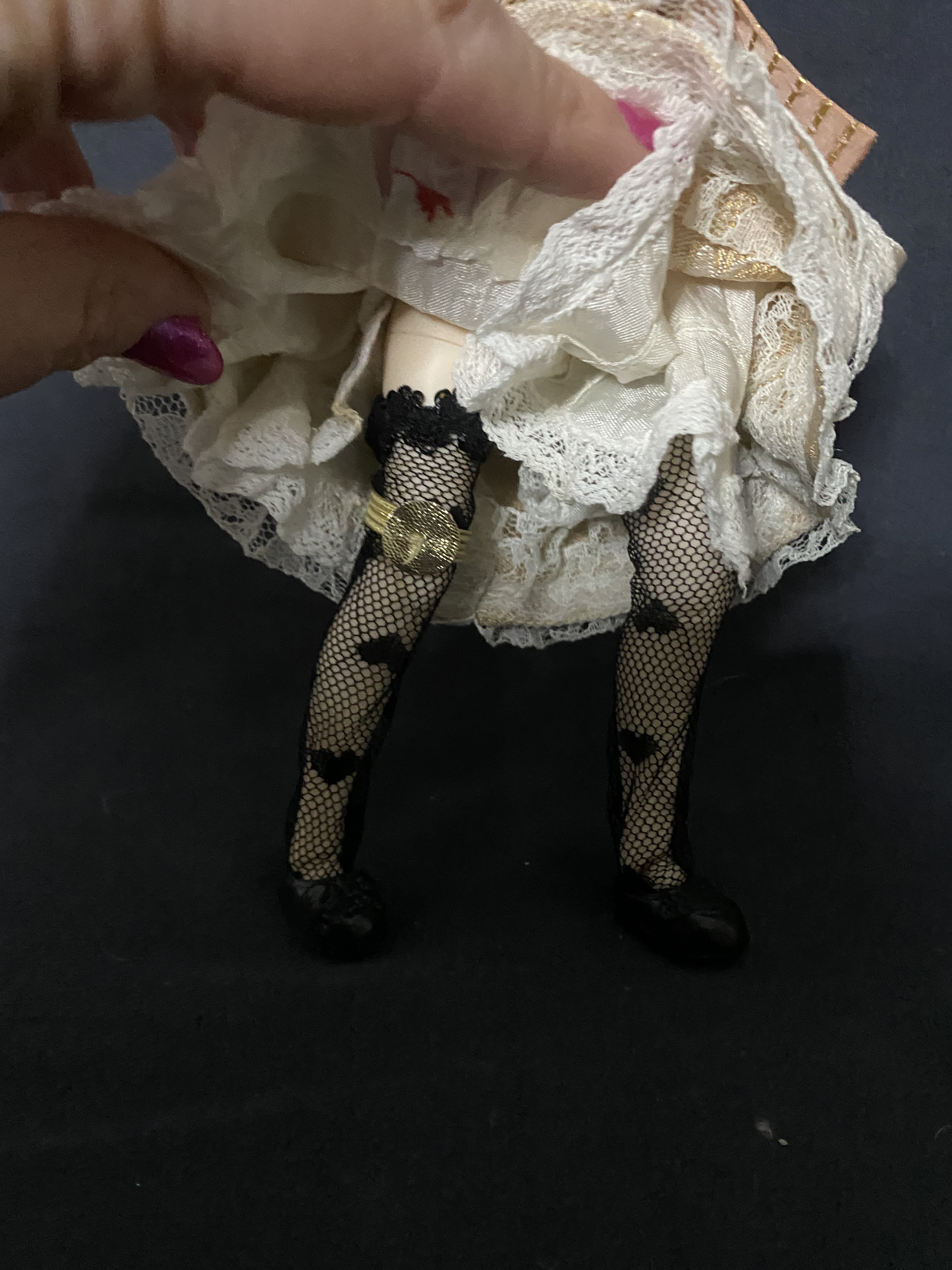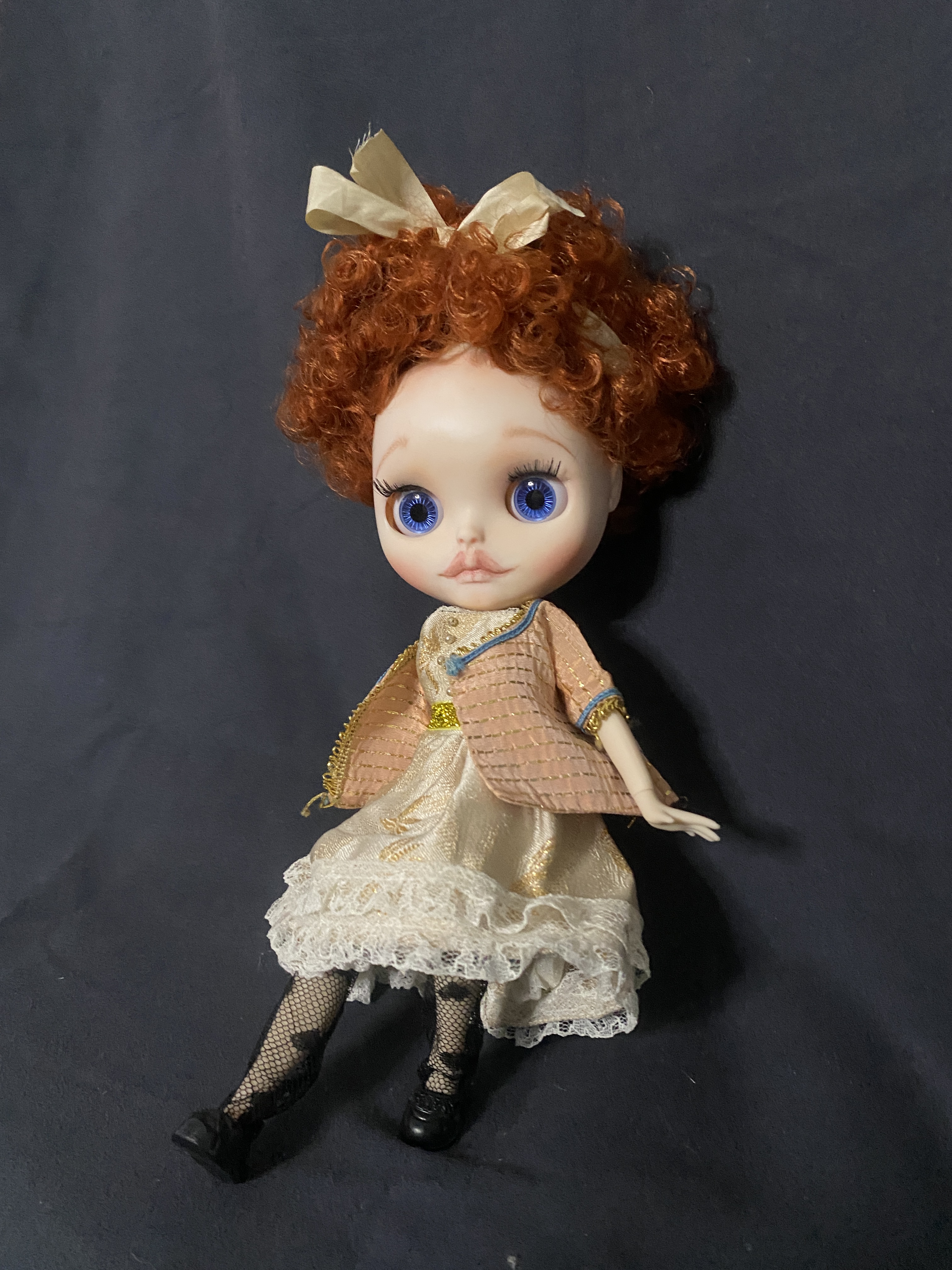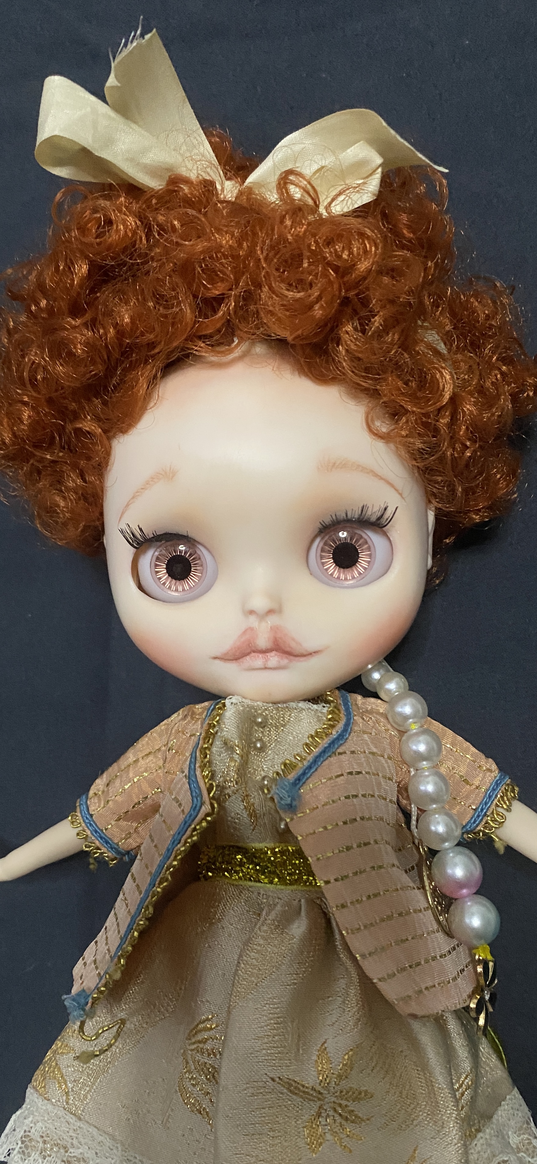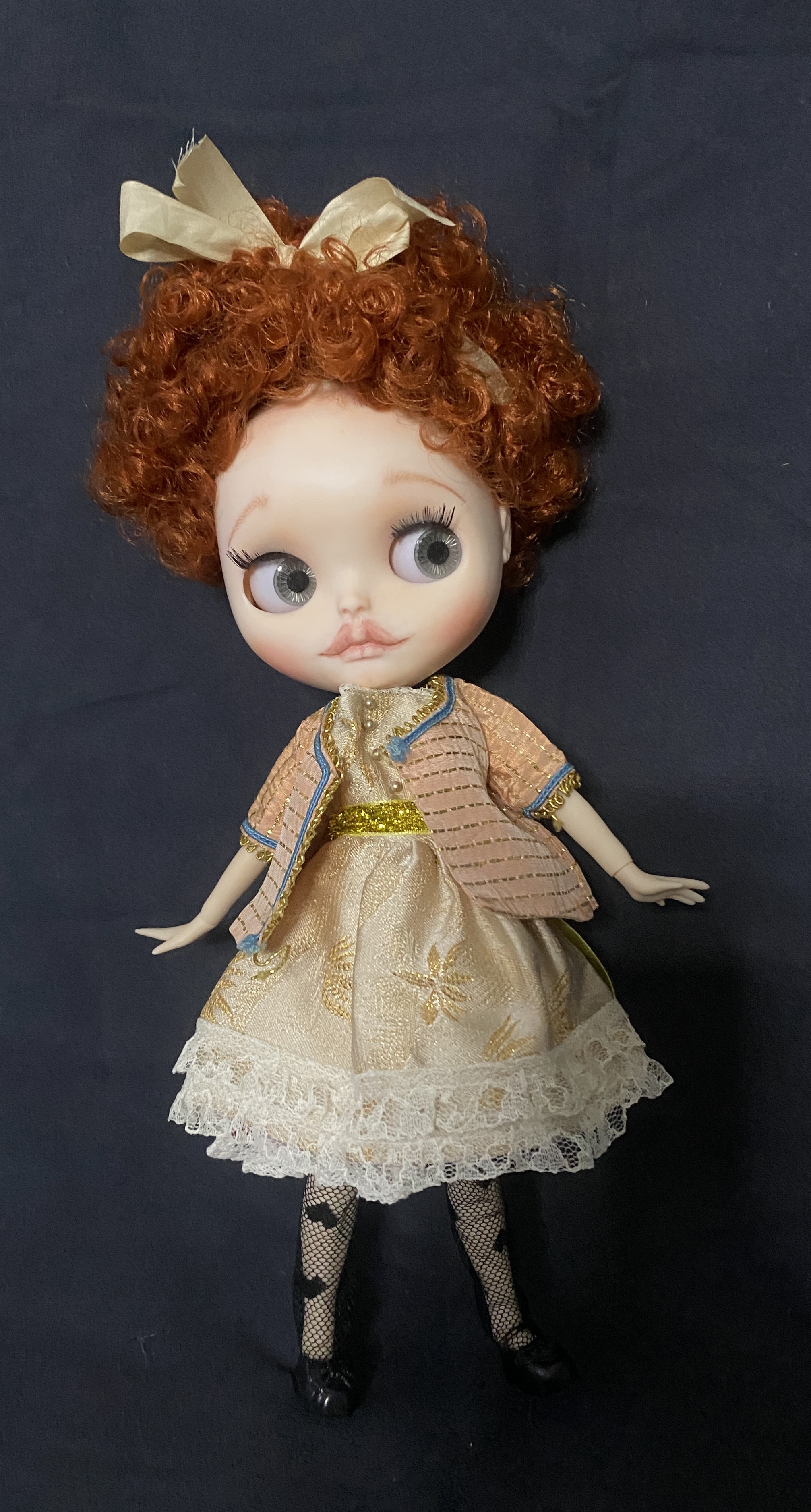 Oh la la meet Madame Renee!!.. she’s my one of a kind (Ooak) bespoke Blythe factory base doll hand customised by me the dollyfairy. I’ve hand carved Renee’s full pouty lips, philtrim and chin, raised her gaze, given her sleepy eyes (2 strings with beads and charms), added glittery gold lids and styled her super thick red corkscrew curls. Renee‘s unique face up has been created by me with professional quality products, each layer sealed with MSC. She comes just as her pics in her brocade dress, vintage jacket, lace waist slip (circa 1960’s) along with heart pattern seam stockings, vintage garter and black plastic loafers. Her hair ribbon is pure French silk from the 1920’s. There’s only one Madame Renee in the world don’t miss her!.