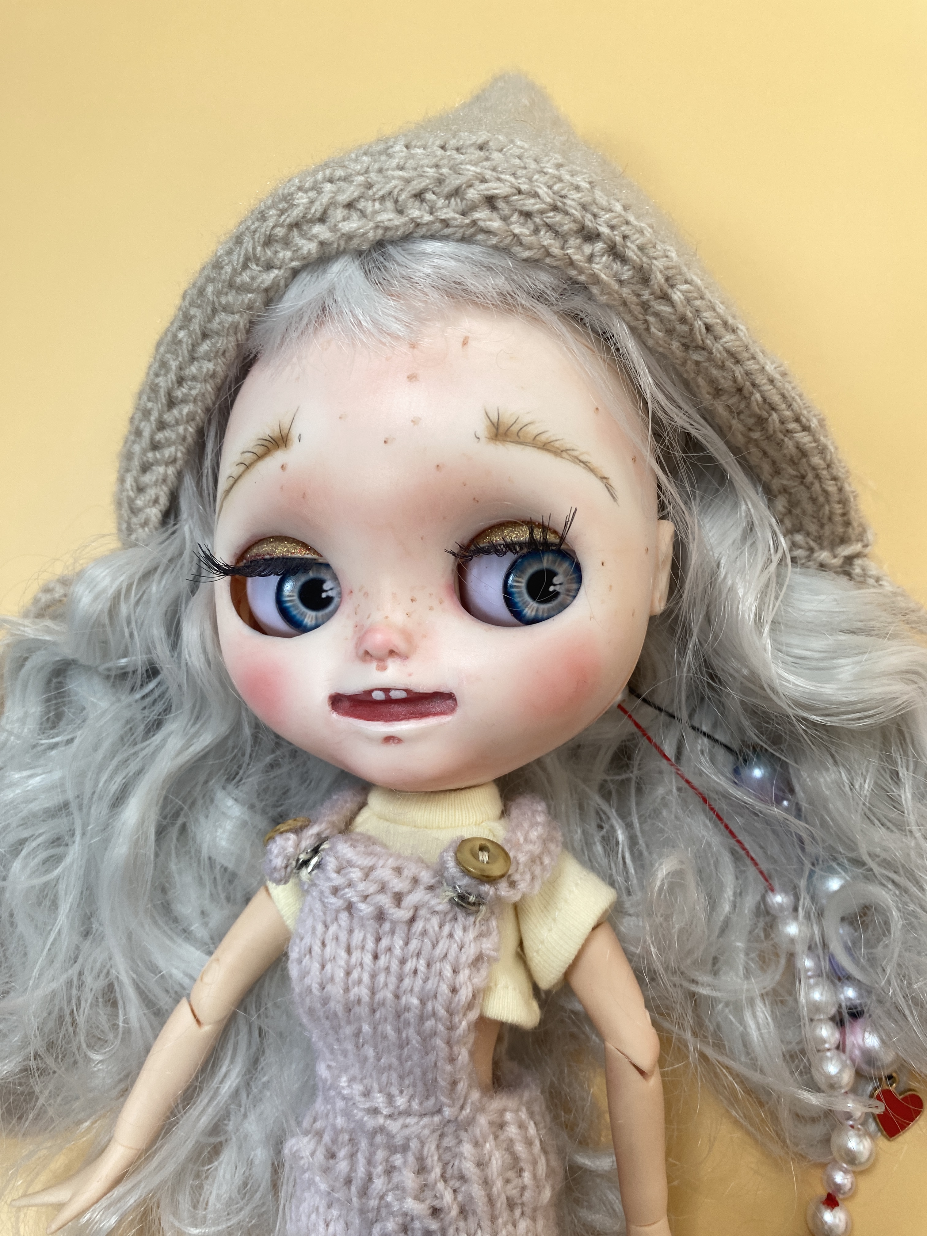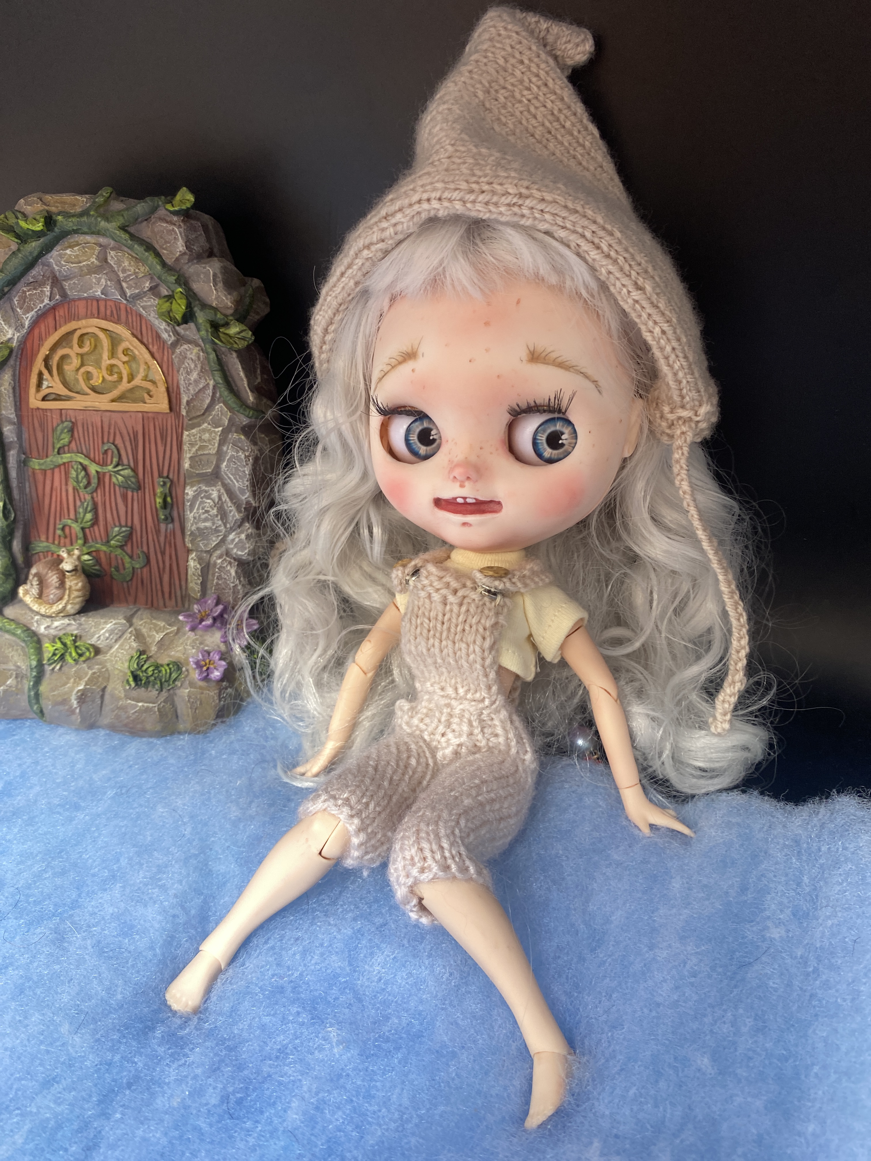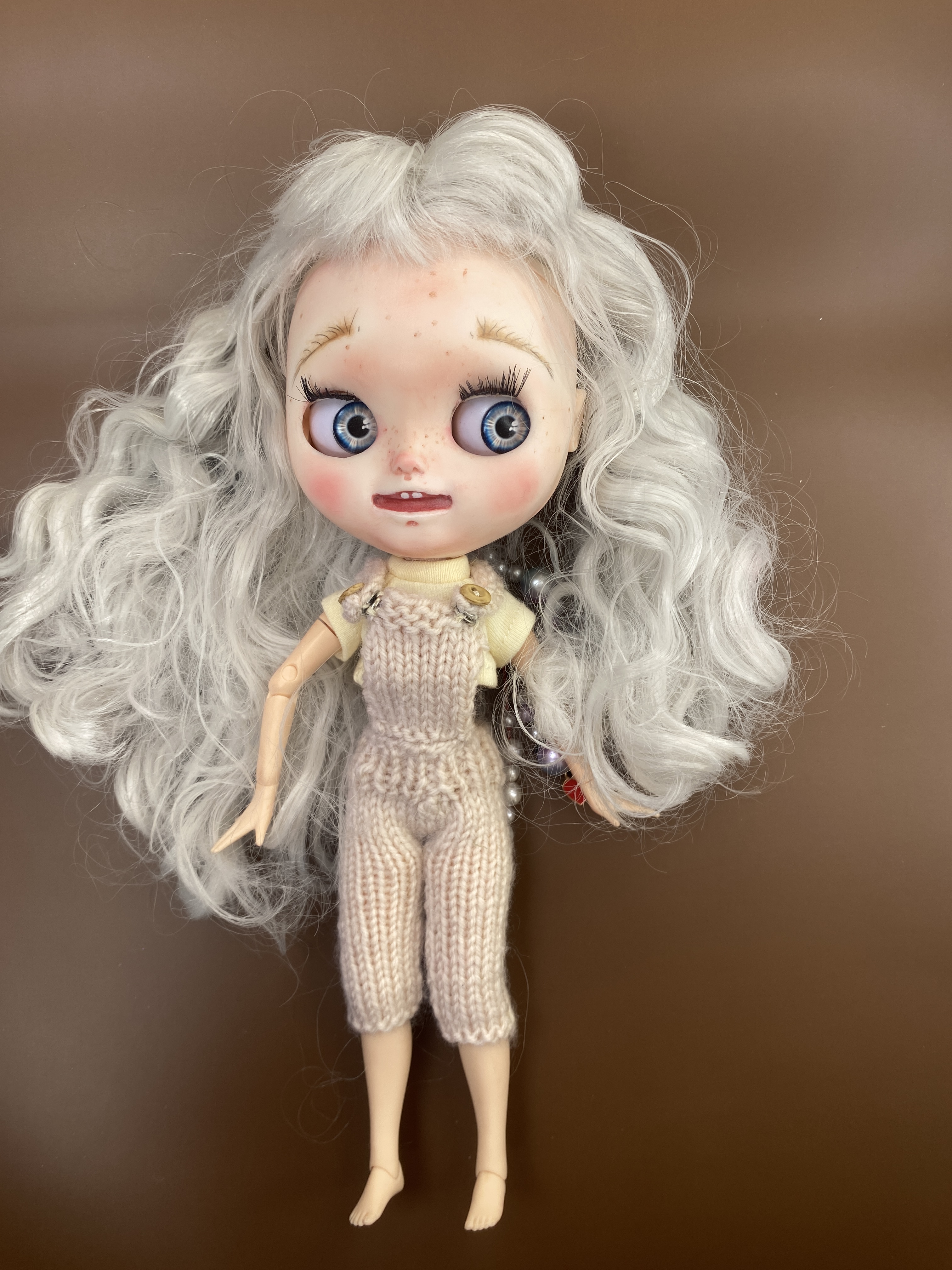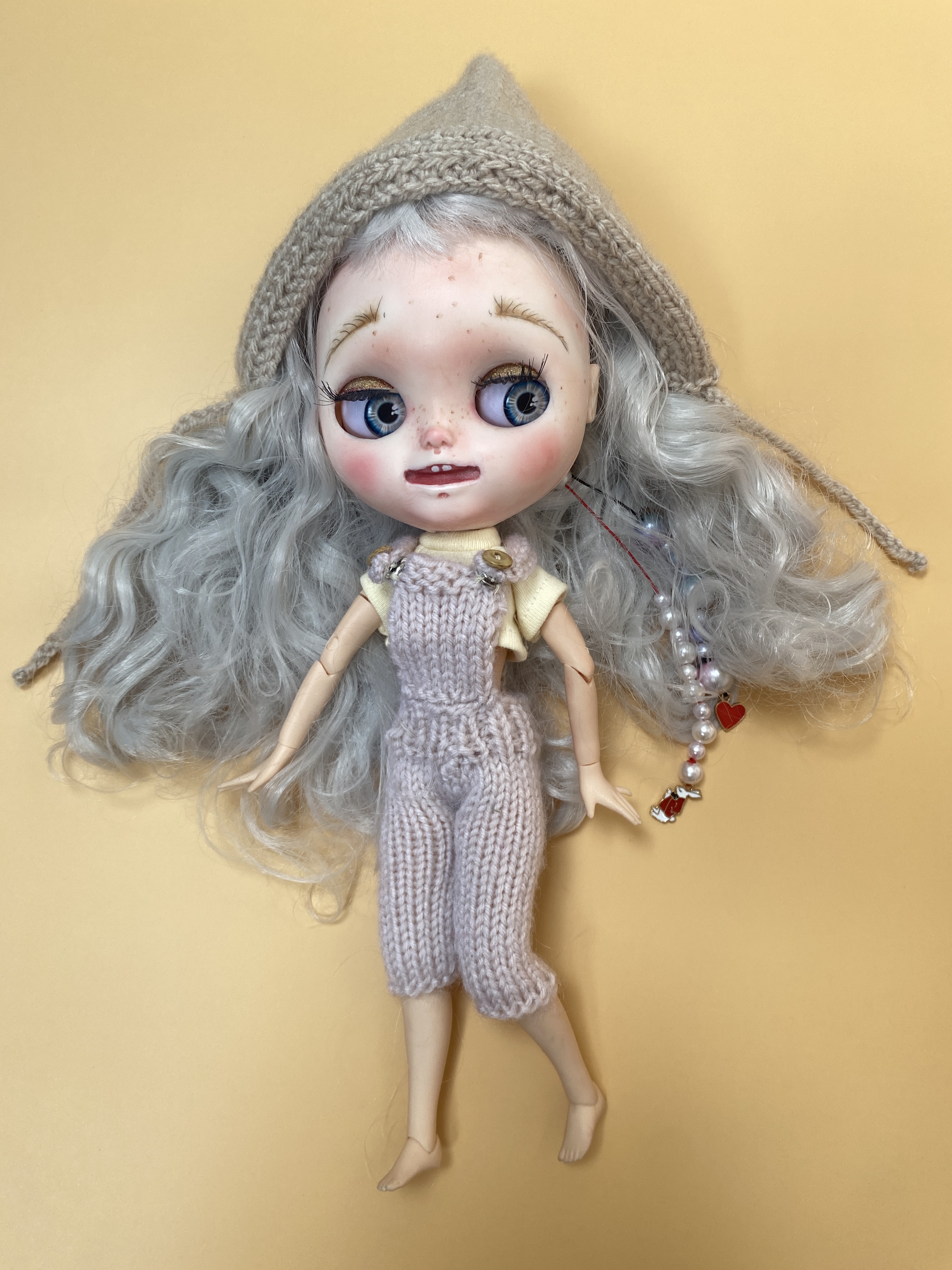 Lily-Ann is my one of a kind factory base Blythe doll hand customised by me the dollyfairy. I’ve sculptered Lily-Ann’s open mouth, tongue and chin, raised her head stance and gaze, fitted 4 new sets of 3D eye chips, given her sleepy eyes (2 strings with beads and charms), glittery gold lids and super thick long platinum curls. Lily-Ann’s totally unique face up has been created by me with professional quality products, each layer sealed with MSC. She comes just as her pics in adorable knitted outfit (especially knitted for her by my mum) with a matching cropped t-shirt underneath..