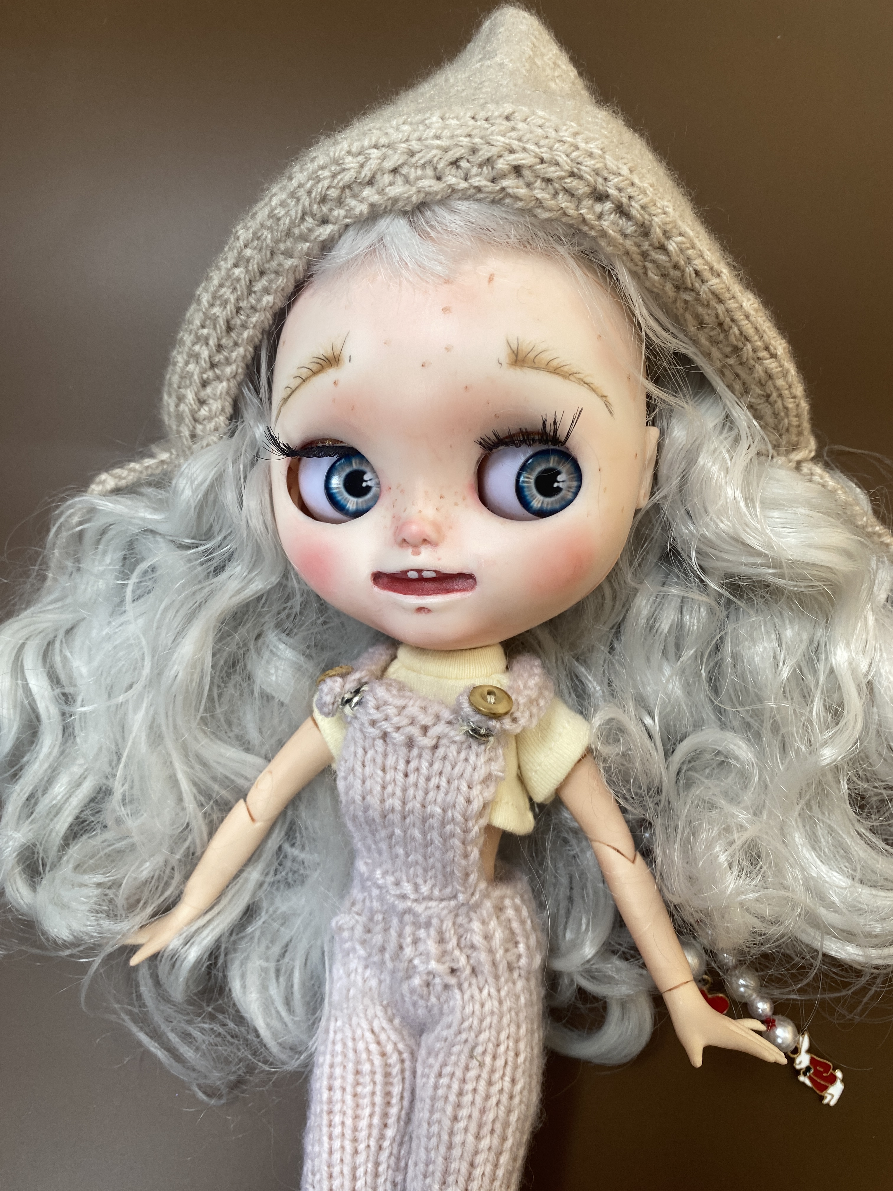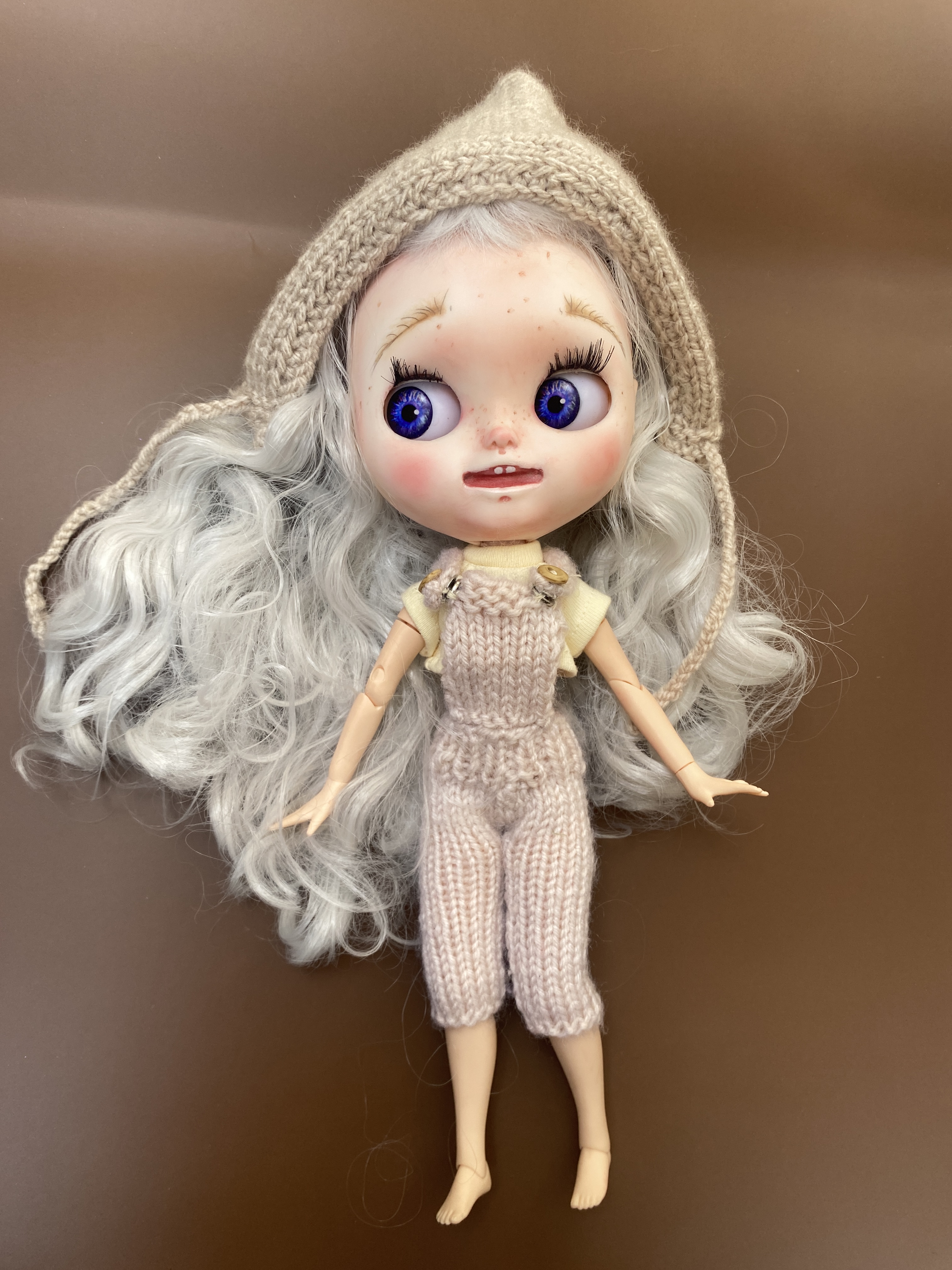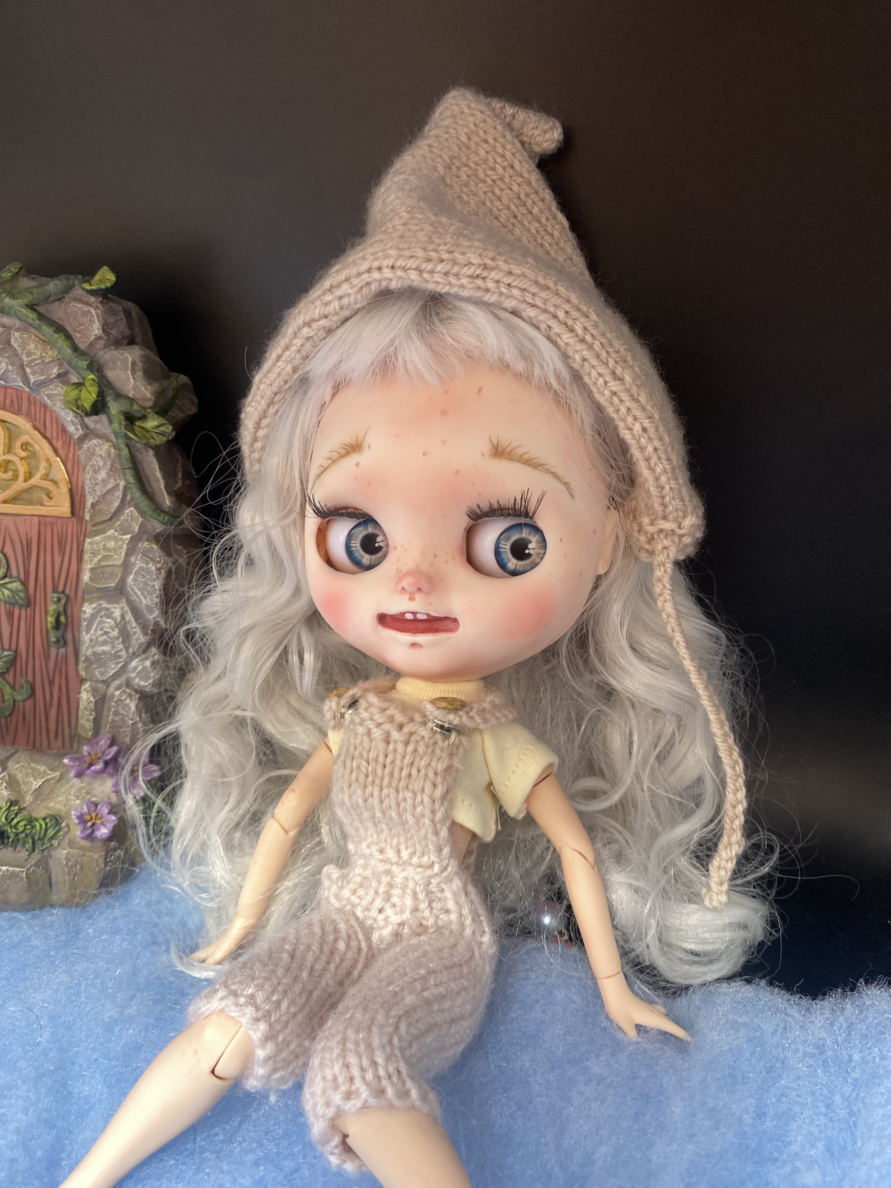 Lily-Ann is my one of a kind factory base Blythe doll hand customised by me the dollyfairy. I’ve sculptered Lily-Ann’s open mouth, tongue and chin, raised her head stance and gaze, fitted 4 new sets of 3D eye chips, given her sleepy eyes (2 strings with beads and charms), glittery gold lids and super thick long platinum curls. Lily-Ann’s totally unique face up has been created by me with professional quality products, each layer sealed with MSC. She comes just as her pics in adorable knitted outfit (especially knitted for her by my mum) with a matching cropped t-shirt underneath..