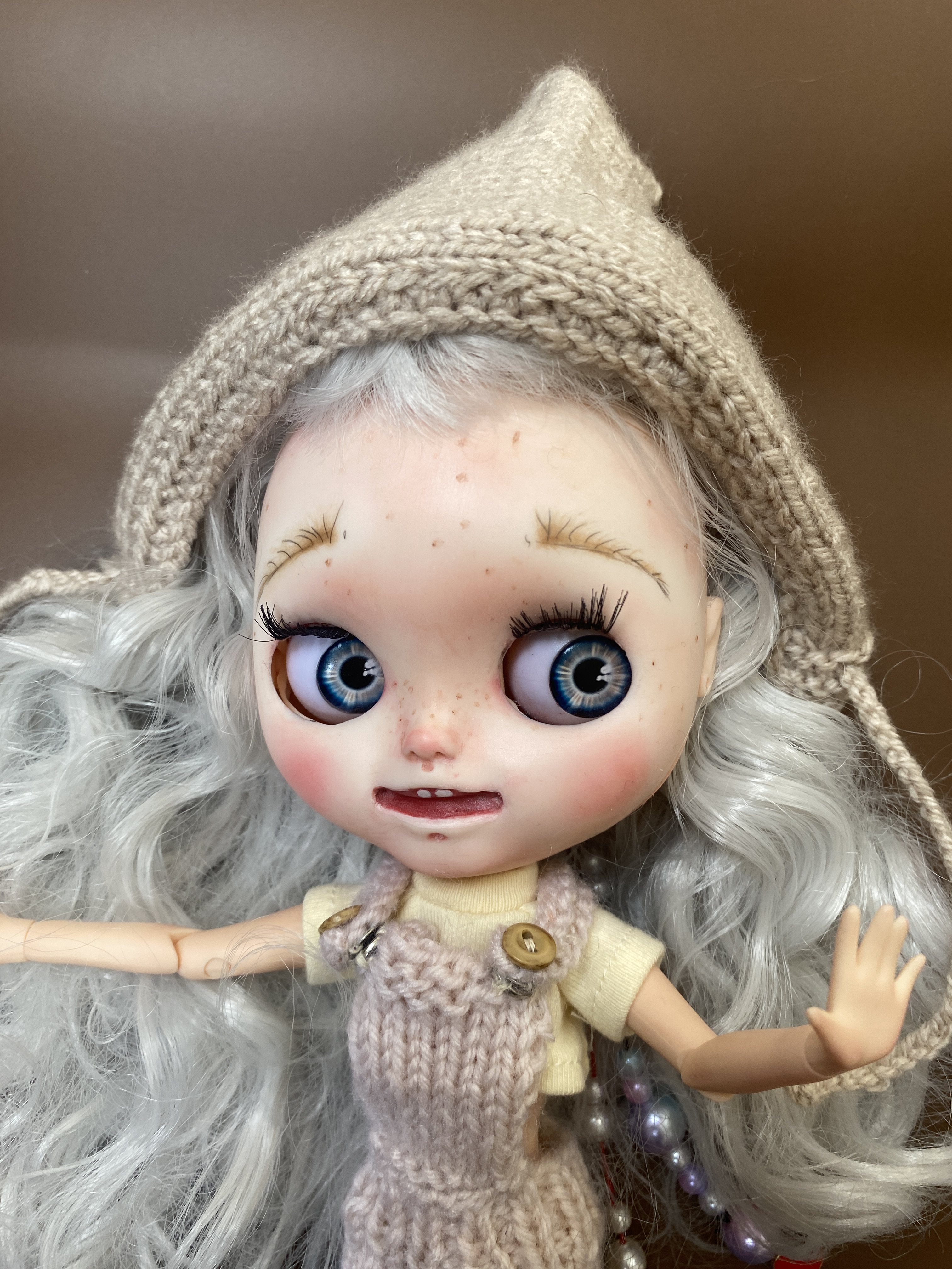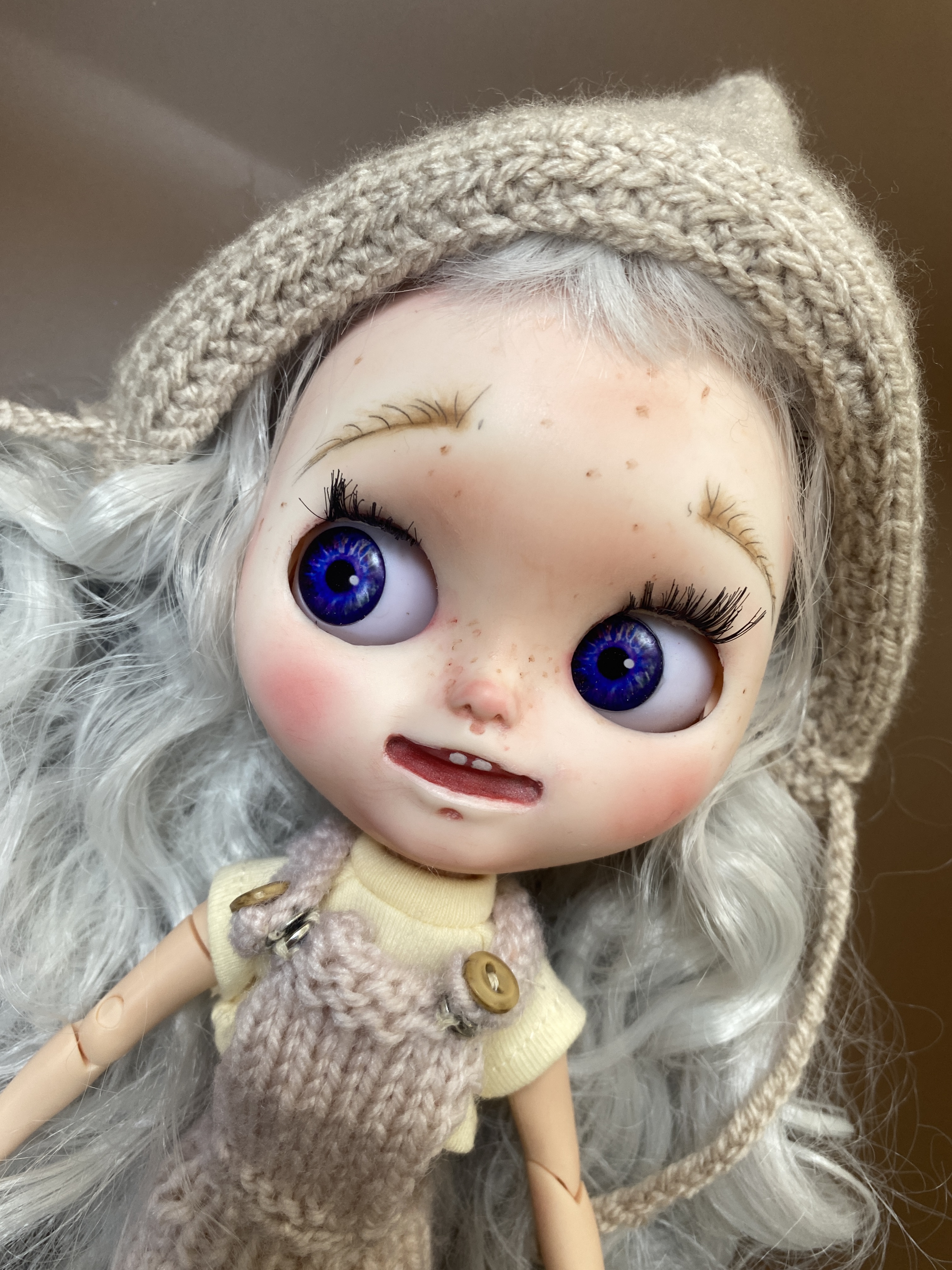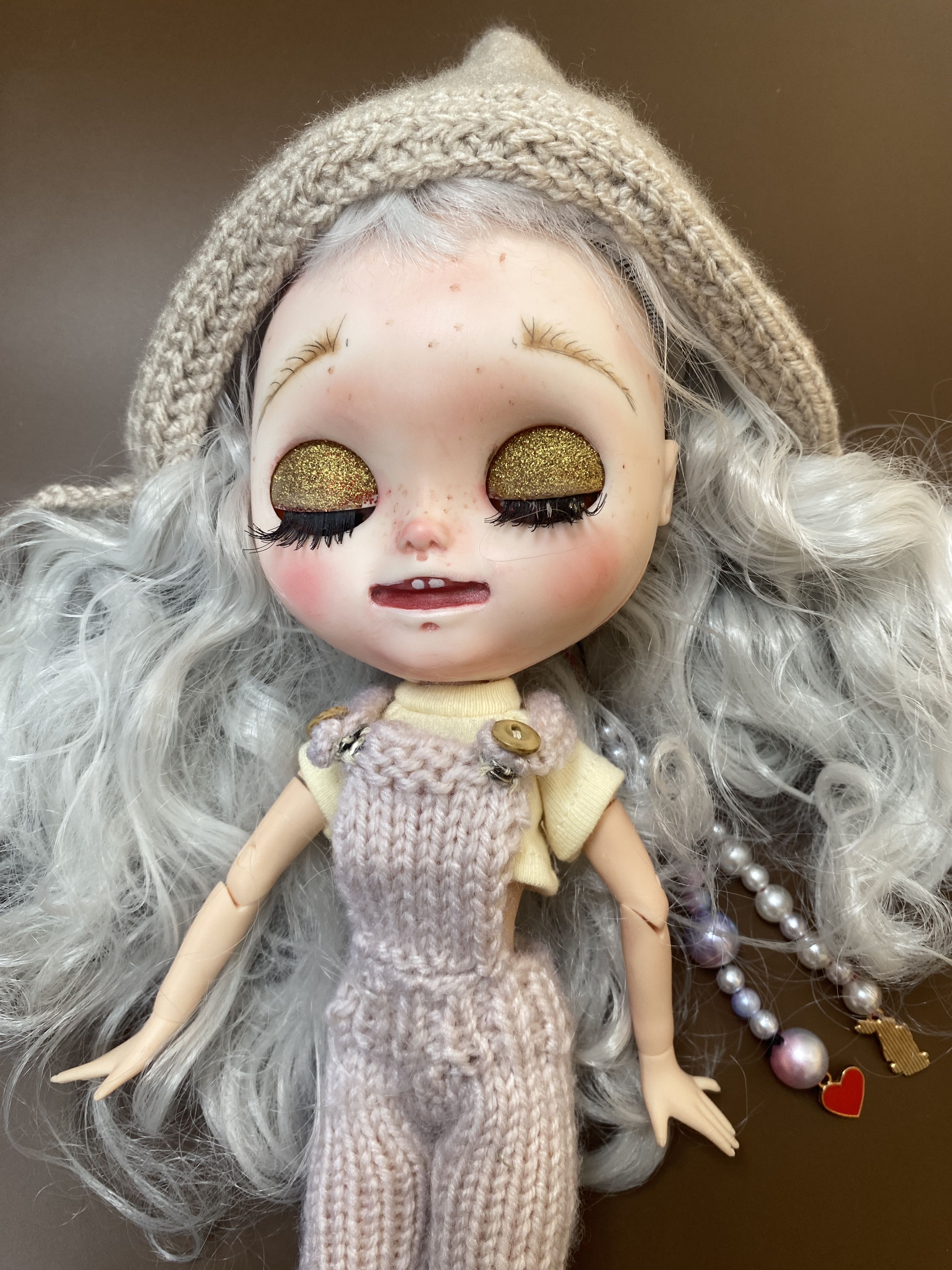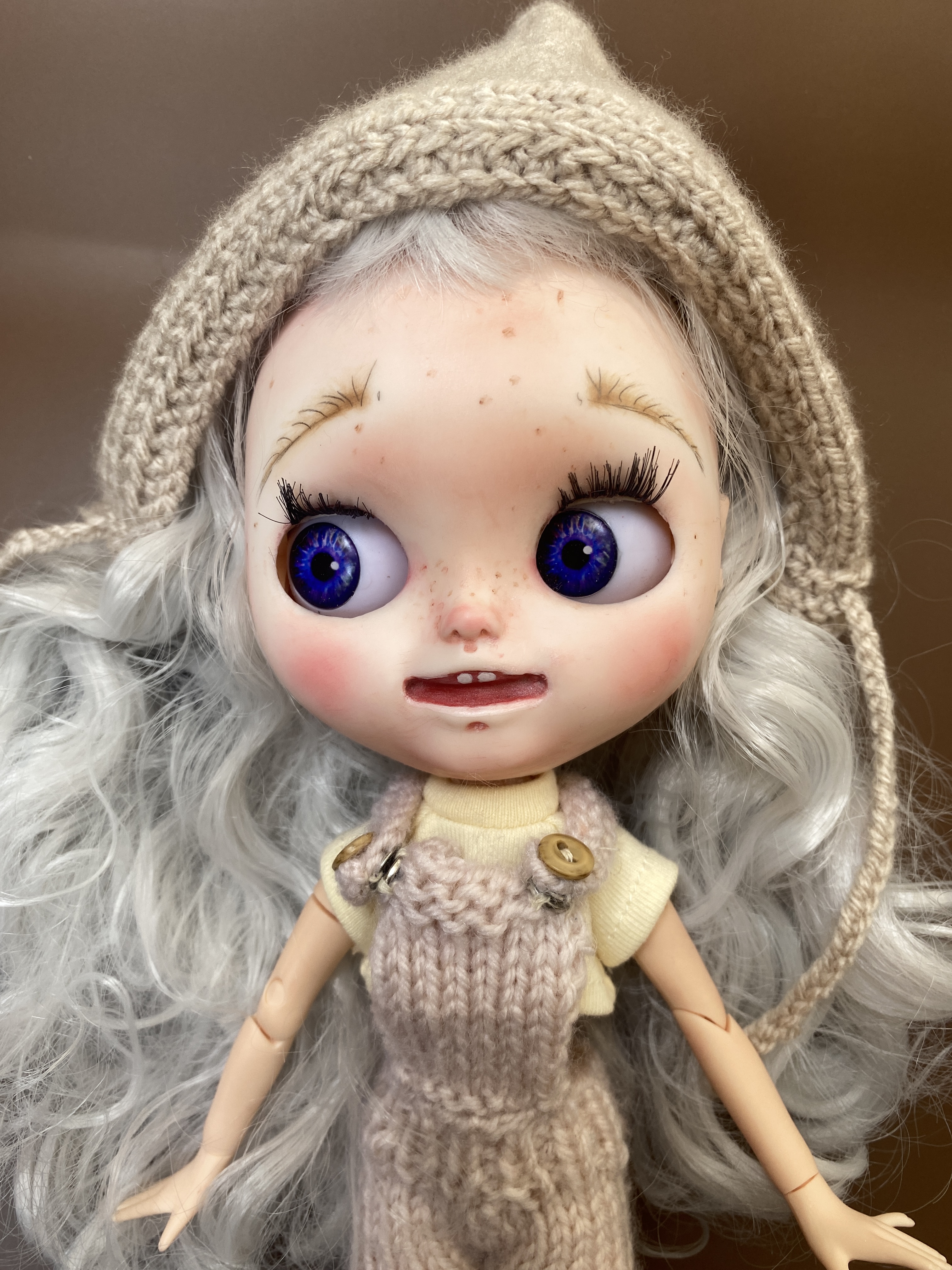 Lily-Ann is my one of a kind factory base Blythe doll hand customised by me the dollyfairy. I’ve sculptered Lily-Ann’s open mouth, tongue and chin, raised her head stance and gaze, fitted 4 new sets of 3D eye chips, given her sleepy eyes (2 strings with beads and charms), glittery gold lids and super thick long platinum curls. Lily-Ann’s totally unique face up has been created by me with professional quality products, each layer sealed with MSC. She comes just as her pics in adorable knitted outfit (especially knitted for her by my mum) with a matching cropped t-shirt underneath..