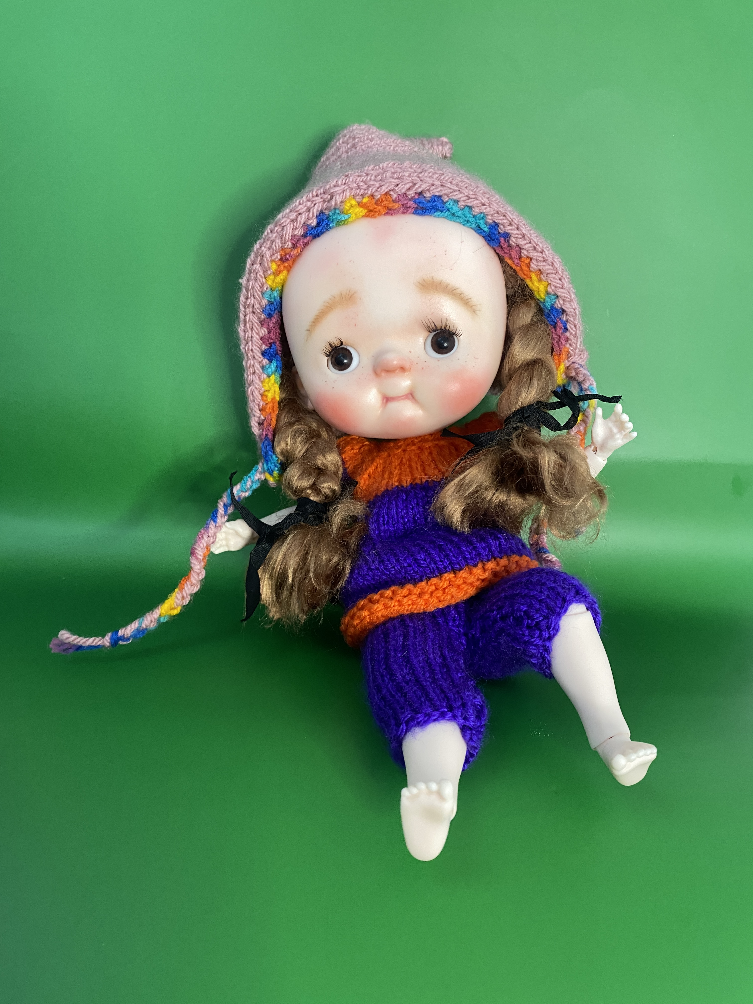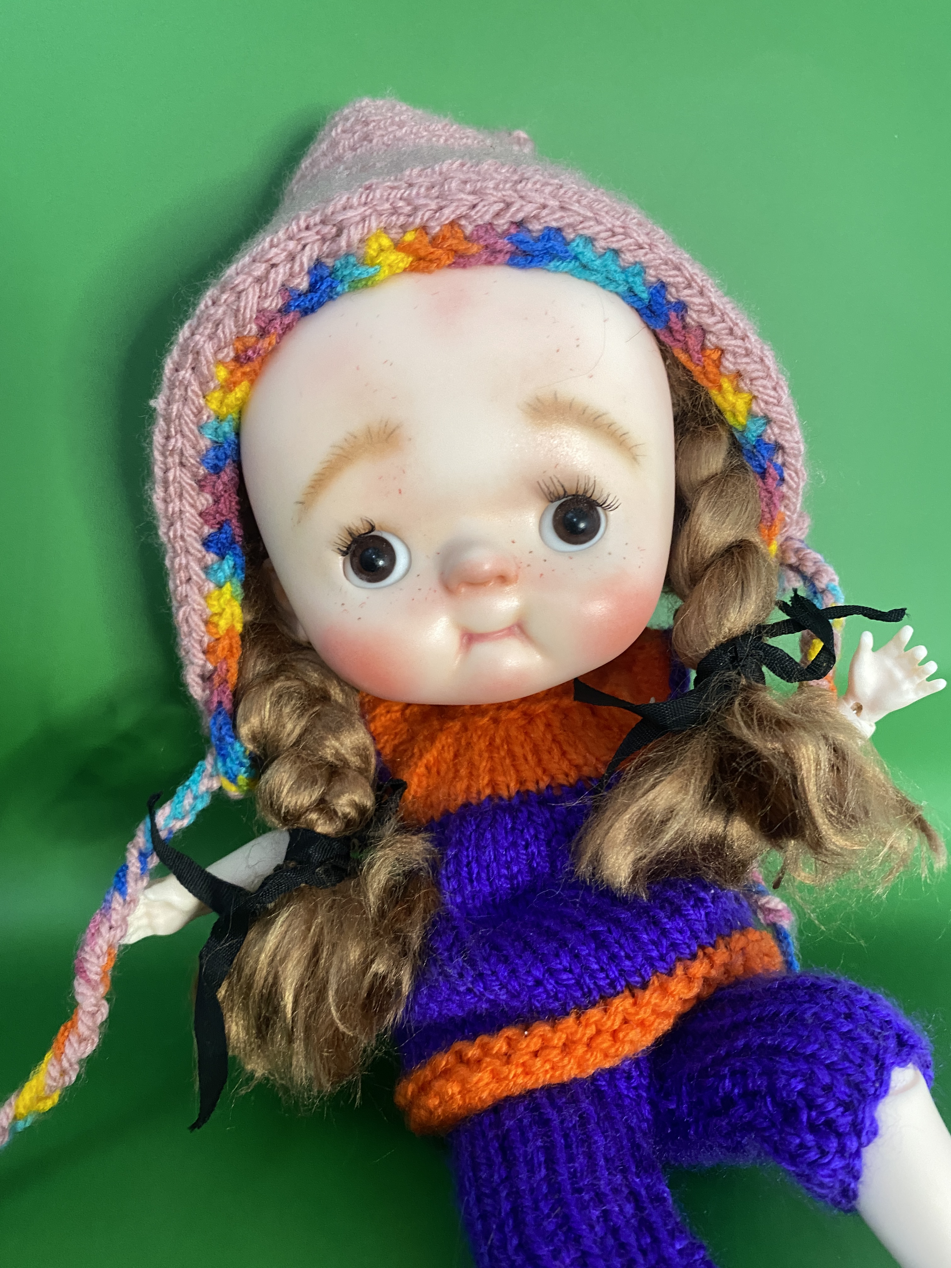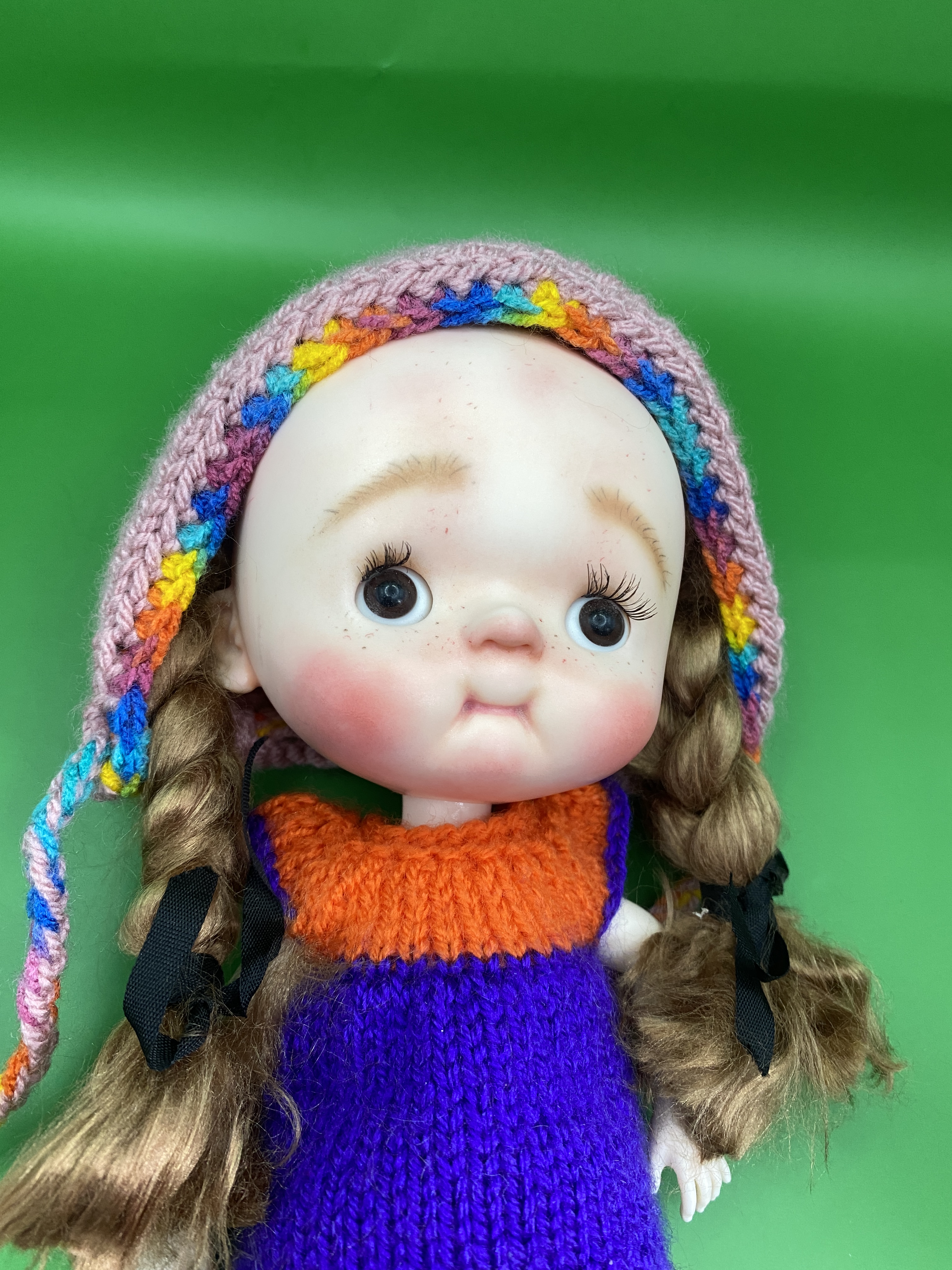 Emily is my ooak custom Q baby doll fully hand customised by me “The Dolly Fairy”. Approx 26cm in height she’s a 1:6 scale BJD recast doll who comes just as shown in her adorable knitted outfit (expertly made by my very talented mum). Emily is a fully strung BJD doll giving her fabulous posing ability. Her multi jointed body is lovely quality and much chunkier than Blythes etc. I created her complete face up using professional quality products (each layer sealed with MSC). I fixed her deep brown glass eyes into a delightful upward glaze and added fluffy lashes. I made her braided wig using vintage hair fibre from my dolly hospital supplies (not restyleable).
