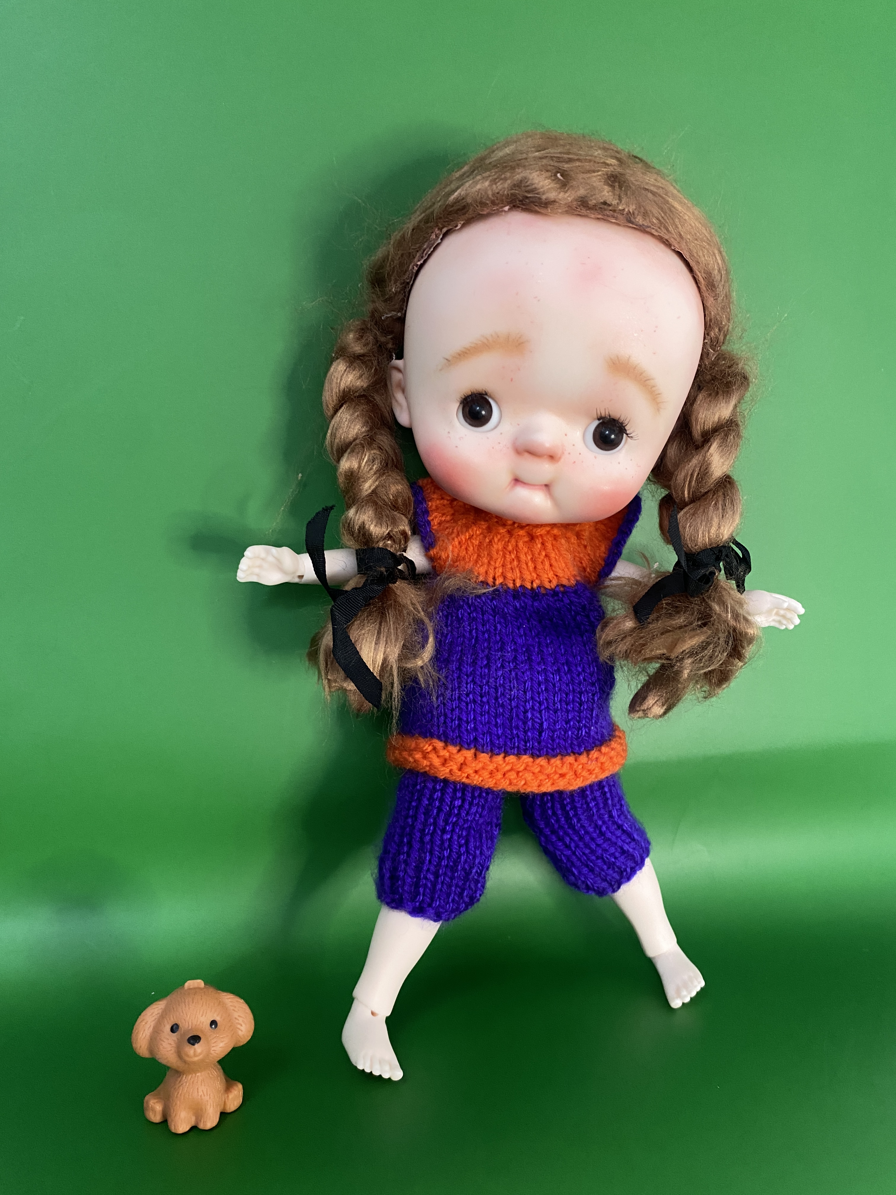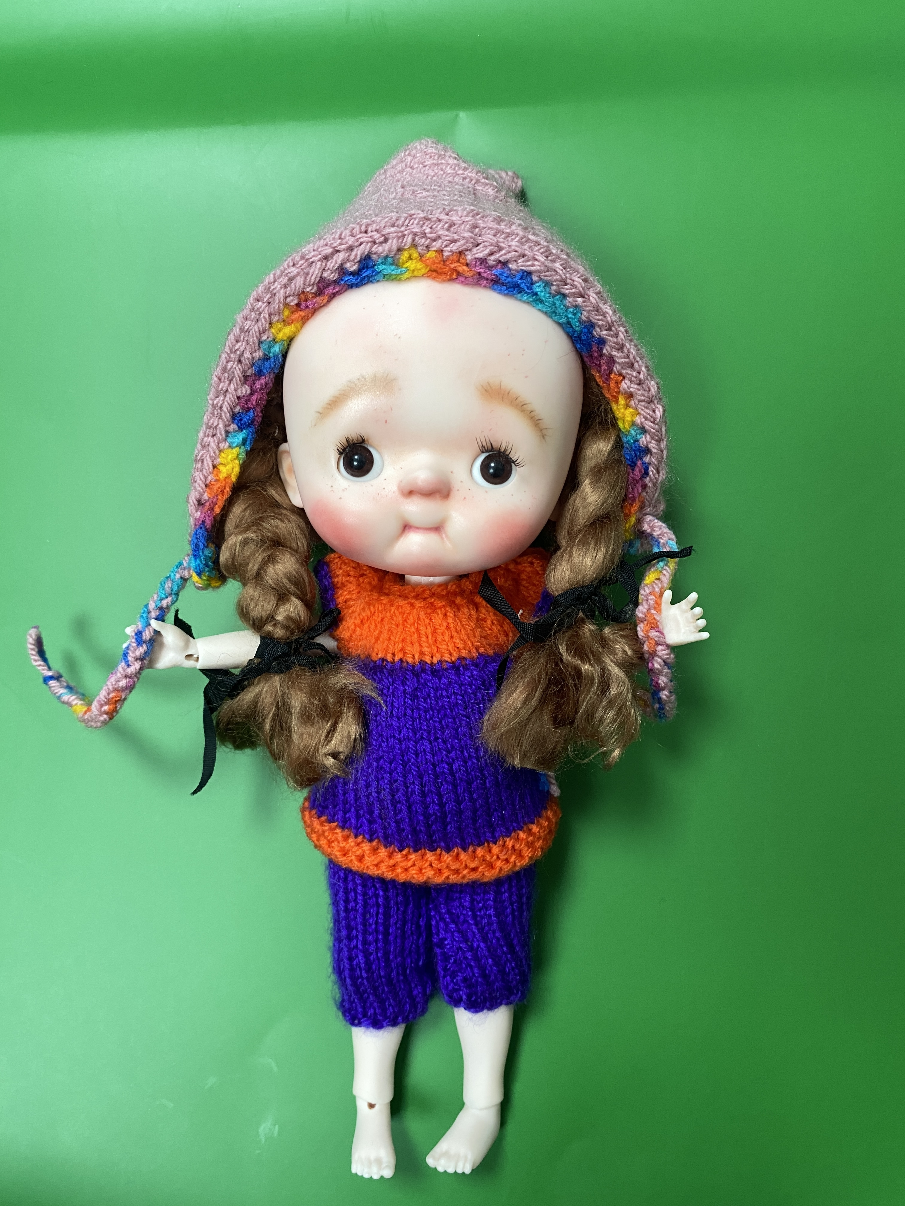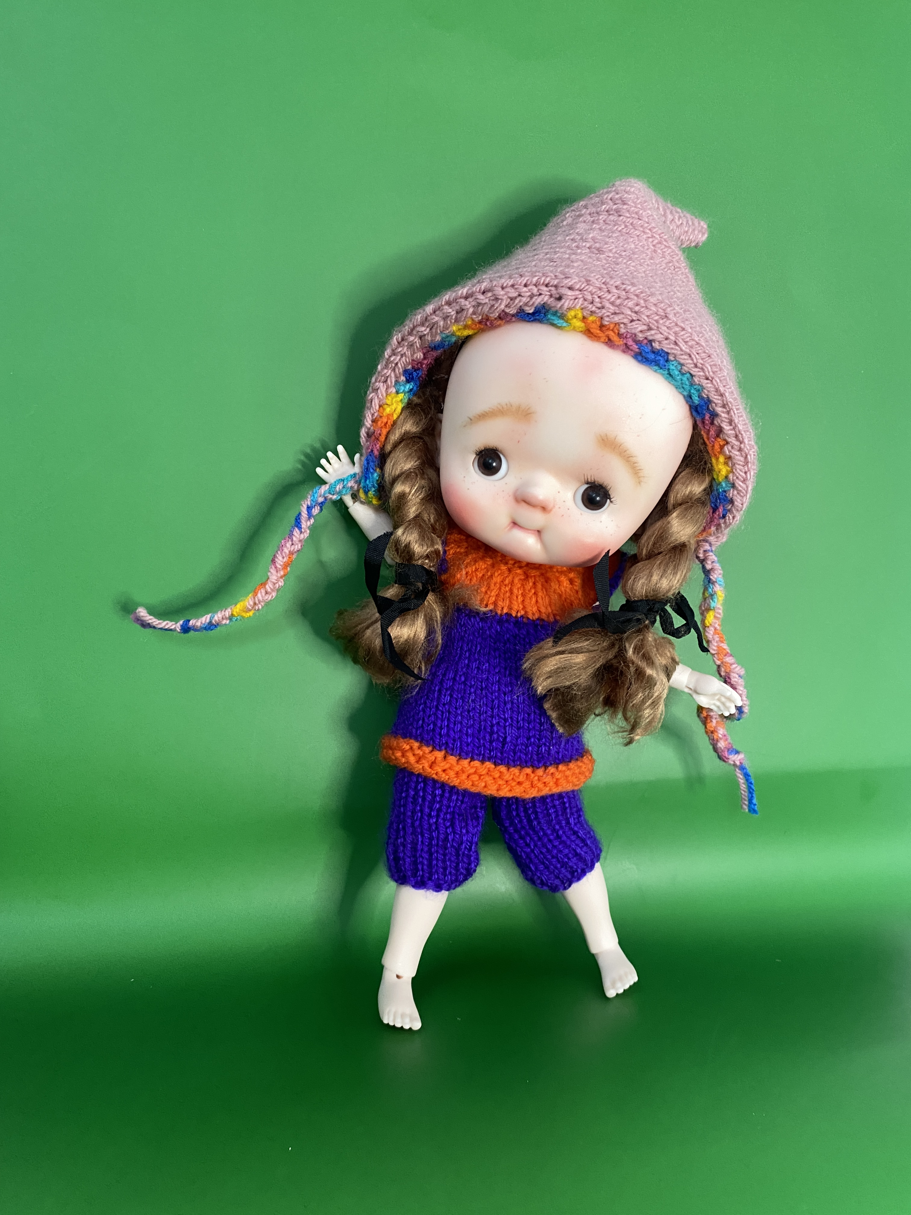 Emily is my ooak custom Q baby doll fully hand customised by me “The Dolly Fairy”. Approx 26cm in height she’s a 1:6 scale BJD recast doll who comes just as shown in her adorable knitted outfit (expertly made by my very talented mum). Emily is a fully strung BJD doll giving her fabulous posing ability. Her multi jointed body is lovely quality and much chunkier than Blythes etc. I created her complete face up using professional quality products (each layer sealed with MSC). I fixed her deep brown glass eyes into a delightful upward glaze and added fluffy lashes. I made her braided wig using vintage hair fibre from my dolly hospital supplies (not restyleable).