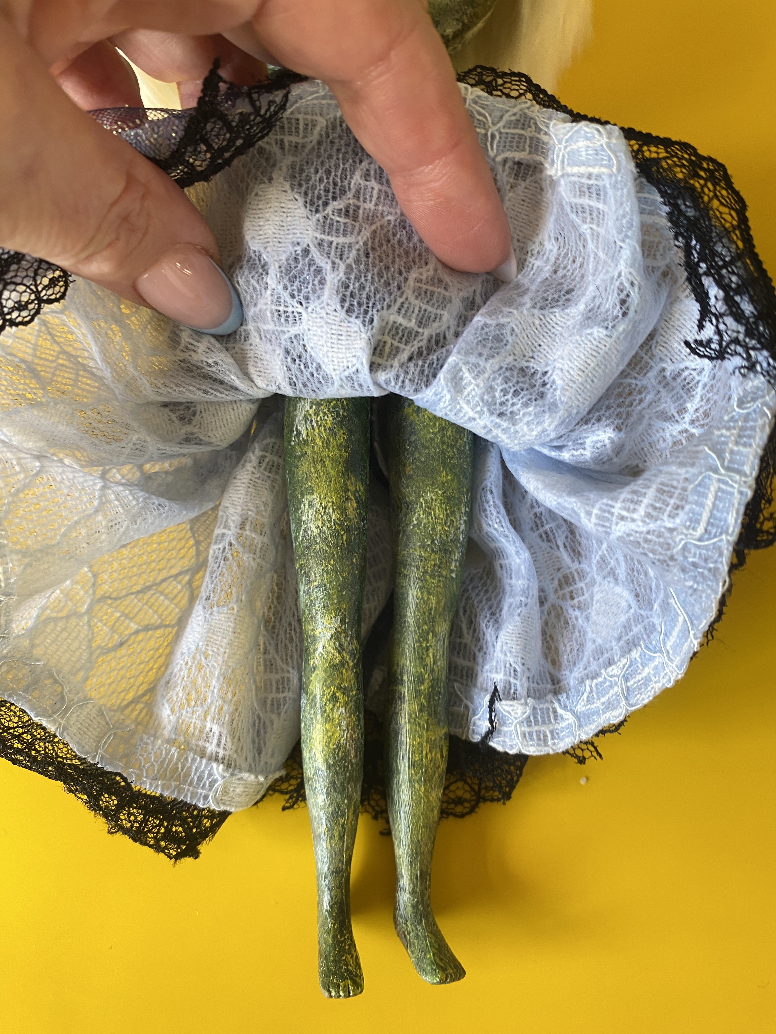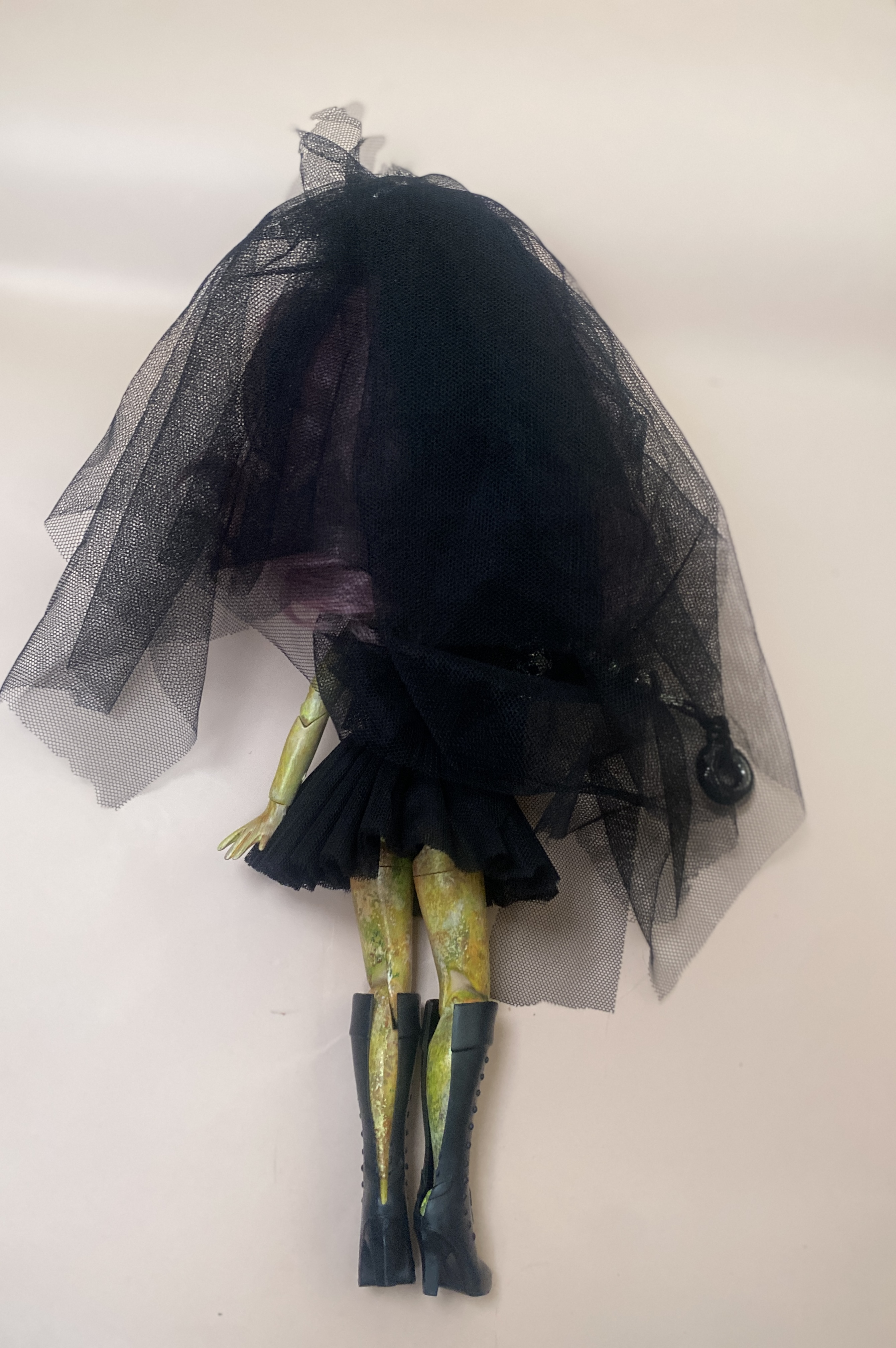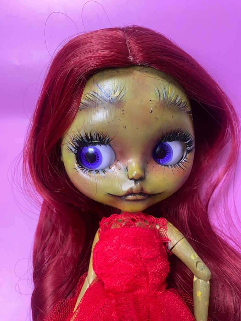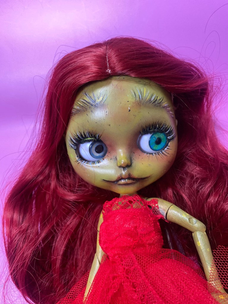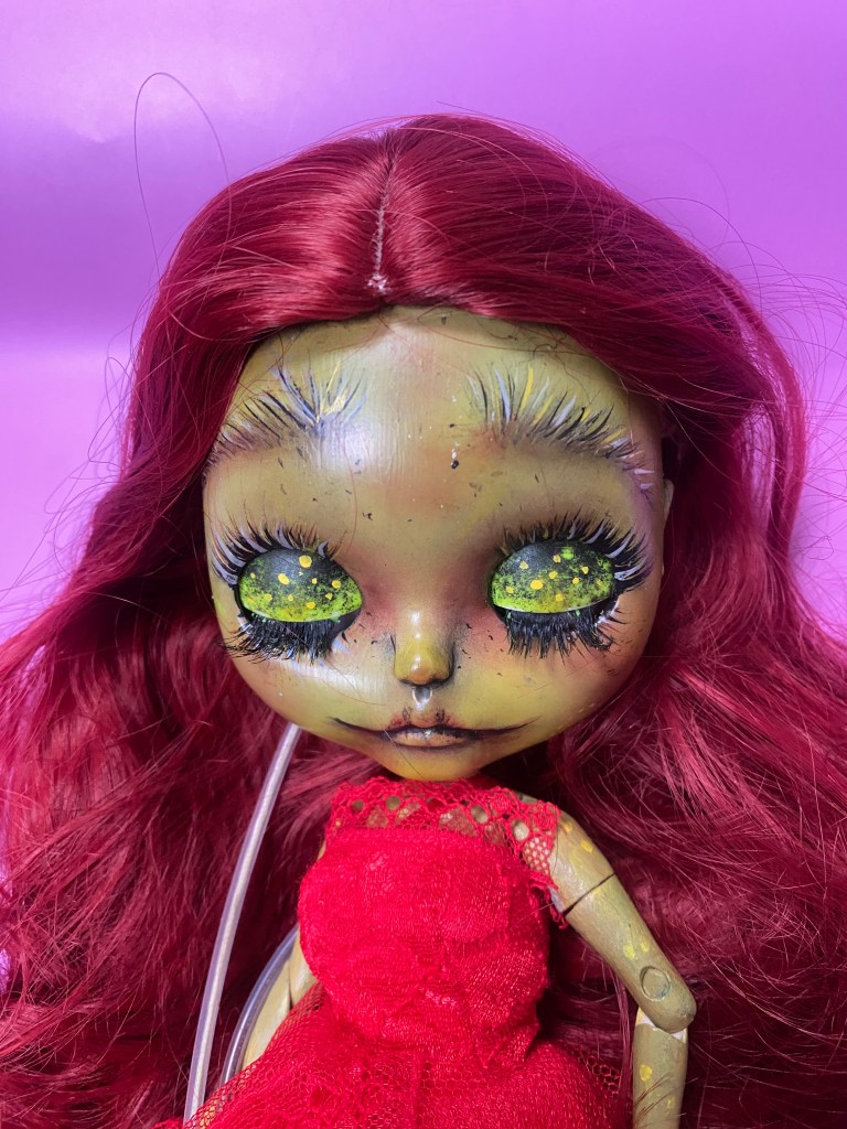 Meet Ivy (aka Poison Ivy). she’s my one of a kind Blythe scary Halloween artist doll, fully hand customised by me “The Dolly Fairy”. Her base is a DBL ICY Blythe factory doll who I’ve hand carved and given her a unique skintone created with many micro fine layers of high pigment colour, each layer sealed with MSC UV flat and gloss to finish. I’ve changed out her eye chips to super detailed 3D ones and converted the mech into sleepy eyes (care always needs to be taken as these can be a bit stiff on the changes). 2 strings which I’ve cased with silicone tubing (to help with hair tangles) and added 2 vintage gothic beads/charms to each. I painted the eyelids and fitted a bright ruby red wig which is styleable but not removeable. As you can see, her body is fully painted to match her skintone and compliment her eye lid painting. My delightful green monster Ivy comes with her hand distressed outfit as shown in her photos. There’s only one of my Ivy in the world, I never repeat my pieces don’t miss her! x
