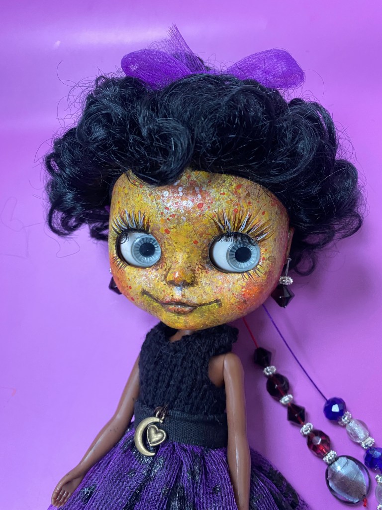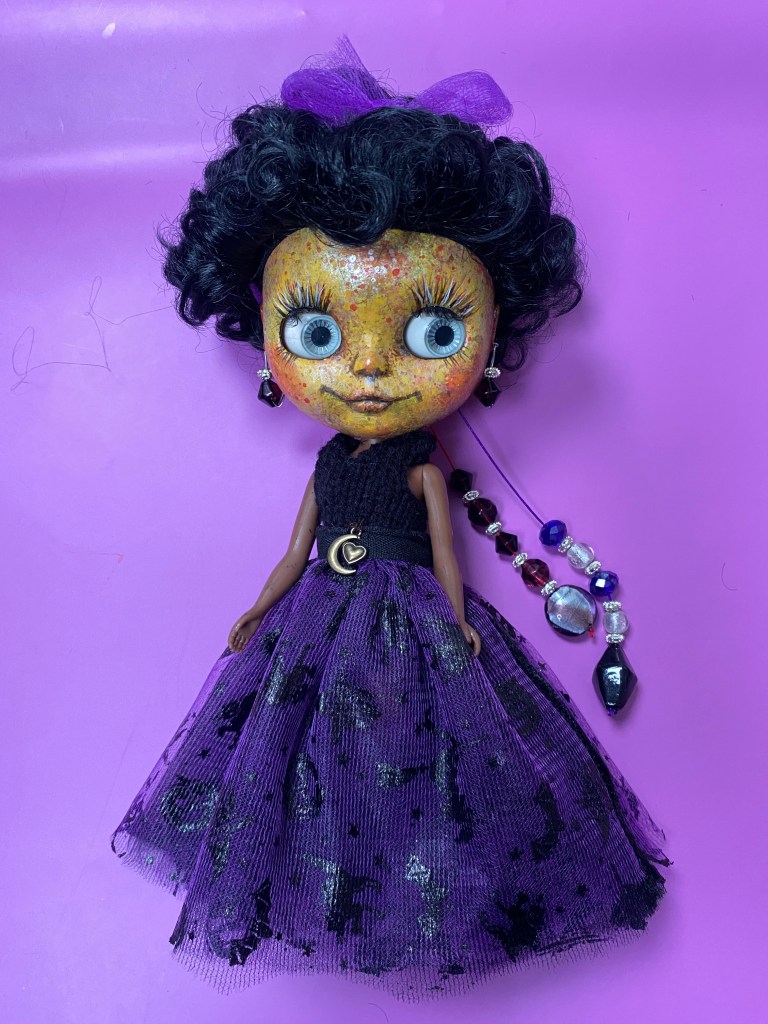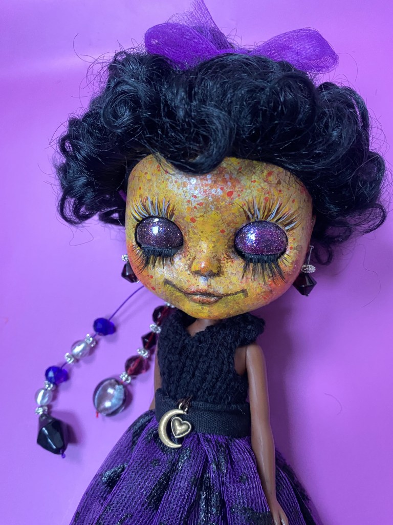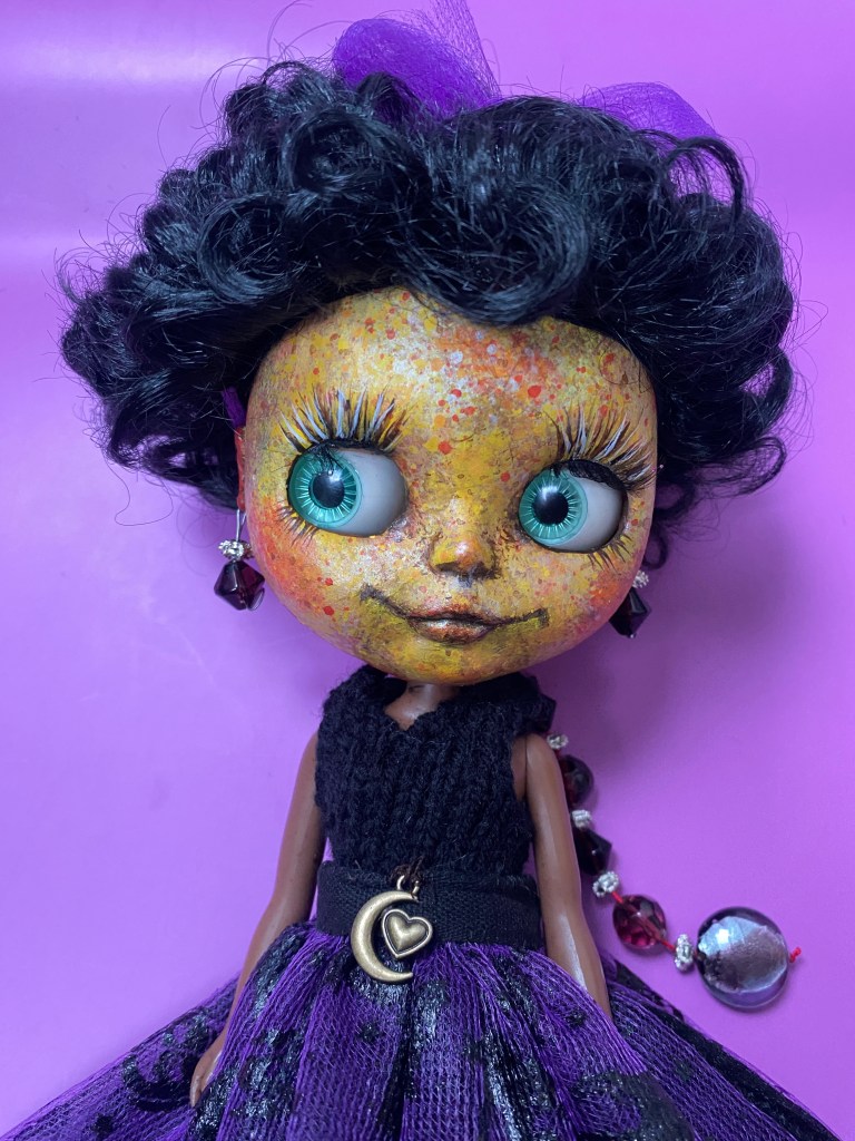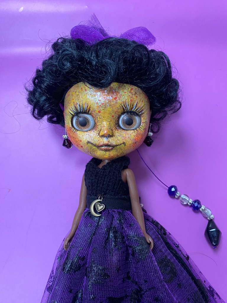 Meet “Raven” she’s my totally unique Ooak Blythe mystic artist doll, hand customised by me “The Dolly Fairy”. Her base is a dark skin factory Blythe straight leg doll.I’ve given Raven a one of a kind (ooak) custom face up with hand carving and unique skintone created with many micro fine layers of high pigment colour, each layer sealed with MSC UV flat and gloss to finish. I kept her factory eyes, they are so magical and the perfect colours for her character. I converted the mech into sleepy eyes 2 strings with genuine vintage gothic beads and handmade matching earrings. Painted the eyelids, changed her lashes into more fluffy ones and fitted her raven black curly wig (not removeable). My mystical Raven comes with her magical outfit just as shown in her photos. There’s only one of my Raven in the world, I never repeat my pieces don’t miss her! x