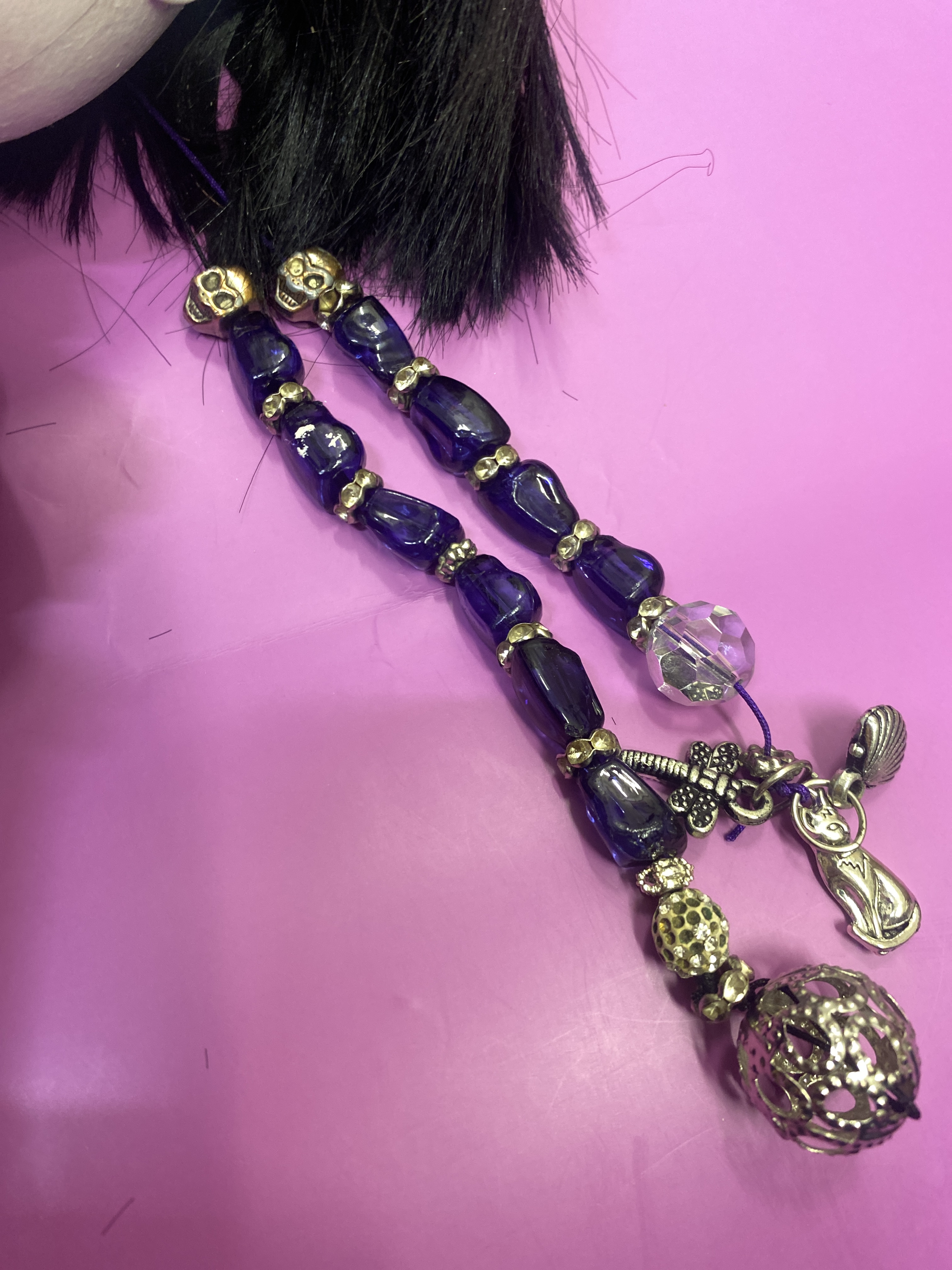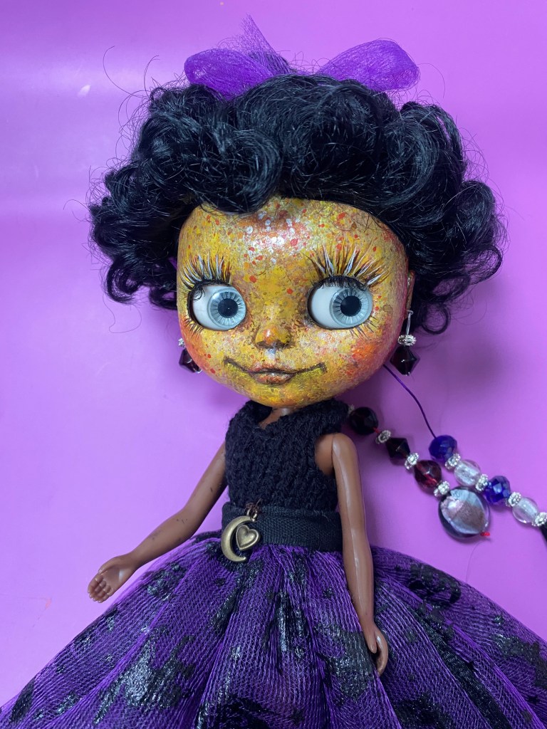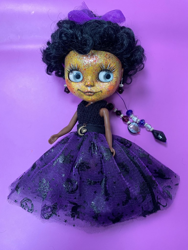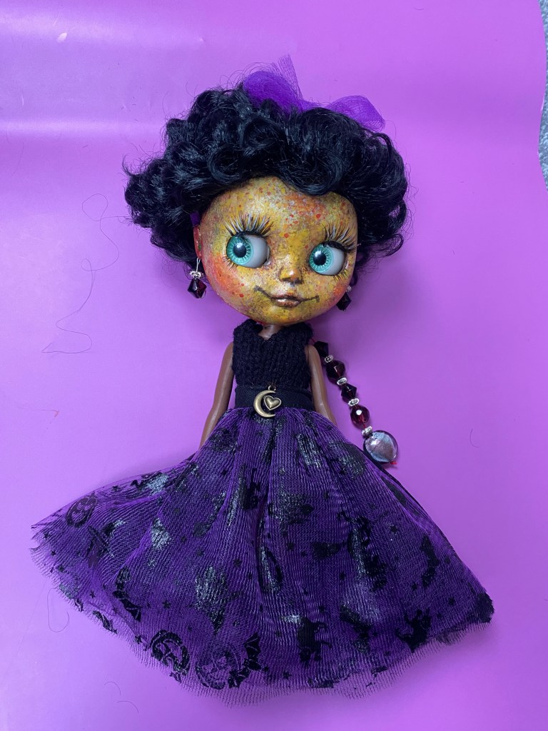 Meet “Raven” she’s my totally unique Ooak Blythe mystic artist doll, hand customised by me “The Dolly Fairy”. Her base is a dark skin factory Blythe straight leg doll.I’ve given Raven a one of a kind (ooak) custom face up with hand carving and unique skintone created with many micro fine layers of high pigment colour, each layer sealed with MSC UV flat and gloss to finish. I kept her factory eyes, they are so magical and the perfect colours for her character. I converted the mech into sleepy eyes 2 strings with genuine vintage gothic beads and handmade matching earrings. Painted the eyelids, changed her lashes into more fluffy ones and fitted her raven black curly wig (not removeable). My mystical Raven comes with her magical outfit just as shown in her photos. There’s only one of my Raven in the world, I never repeat my pieces don’t miss her! x