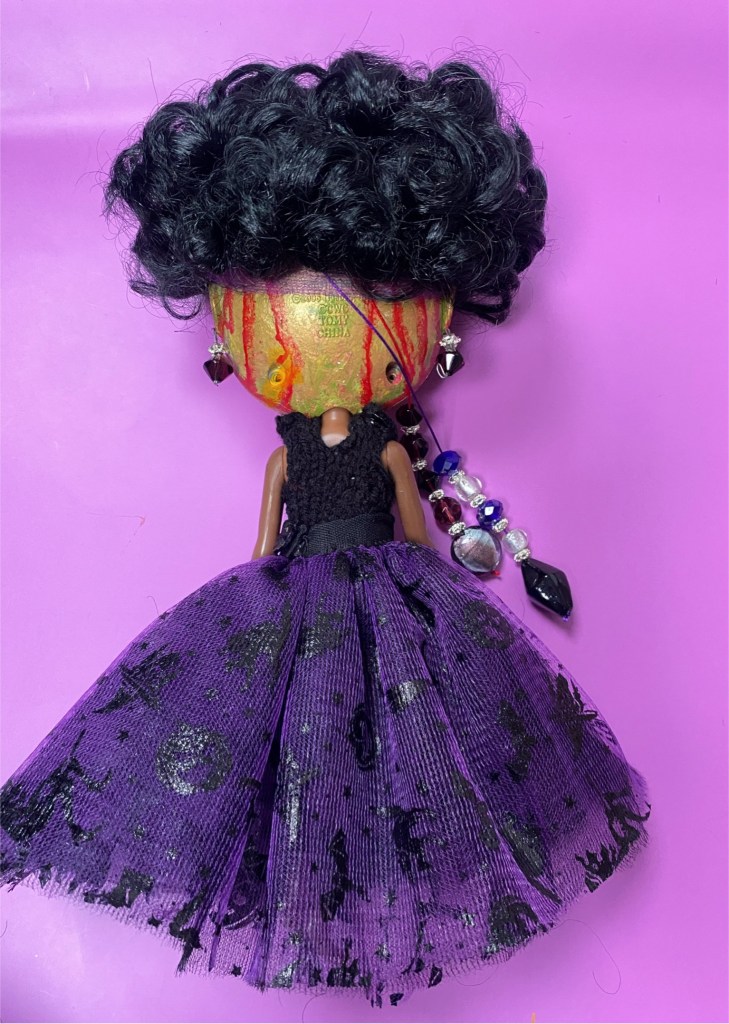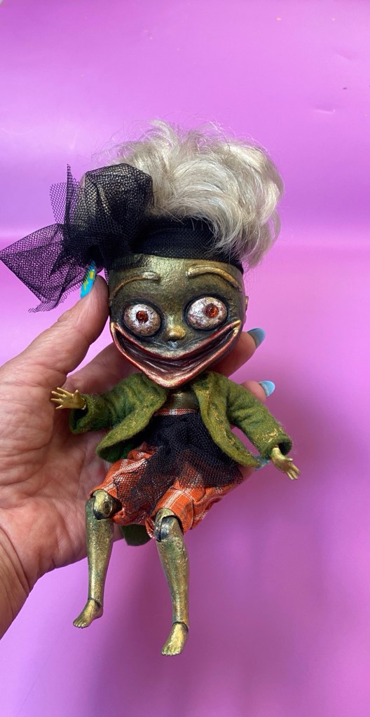 Meet scary monster “Estelle” she’s my totally unique Ooak Blythe creepy Halloween artist doll, customised by me “The Dolly Fairy”. Her base is a dark skin factory straight leg Takara style factory Blythe doll. I’ve given Estelle a one of a kind (ooak) custom face up with hand carving and unique skintone created with many micro fine layers of high pigment colour, each layer sealed with MSC UV flat and gloss to finish. I kept her factory eyes, they are so stunning and the perfect colours for her character.I converted the mech into sleepy eyes (care always needs to be taken as these can be a bit stiff on the changes). 2 strings with vintage gothic beads/charms. Painted the eyelids and fitted a bright platinum wig which I’ve styled into a bob. Pics are also shown before I fitted the wig into place (wig now not removeable). As you can see, her body is fully painted to match her skintone. My delightful scary little monster Estelle comes with her gothy outfit just as shown in her photos. There’s only one of my Estelle in the world, I never repeat my pieces don’t miss her! x
