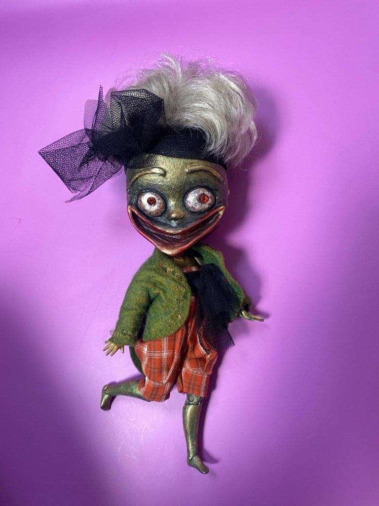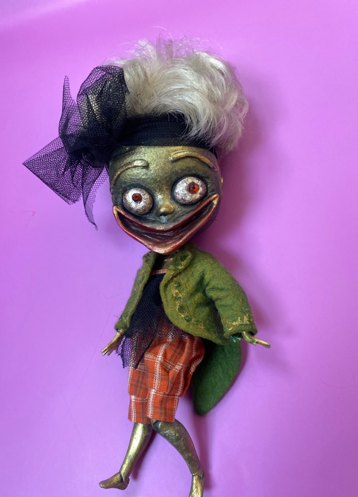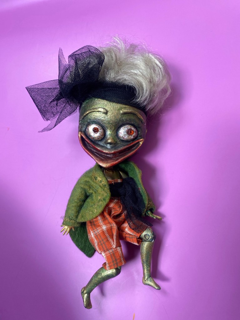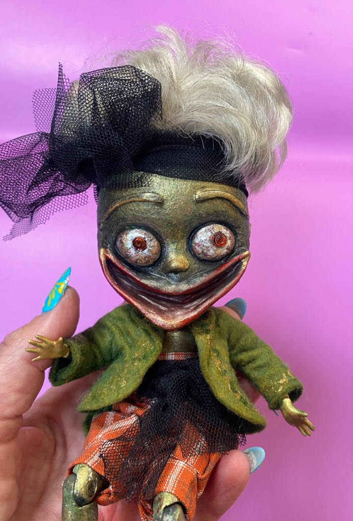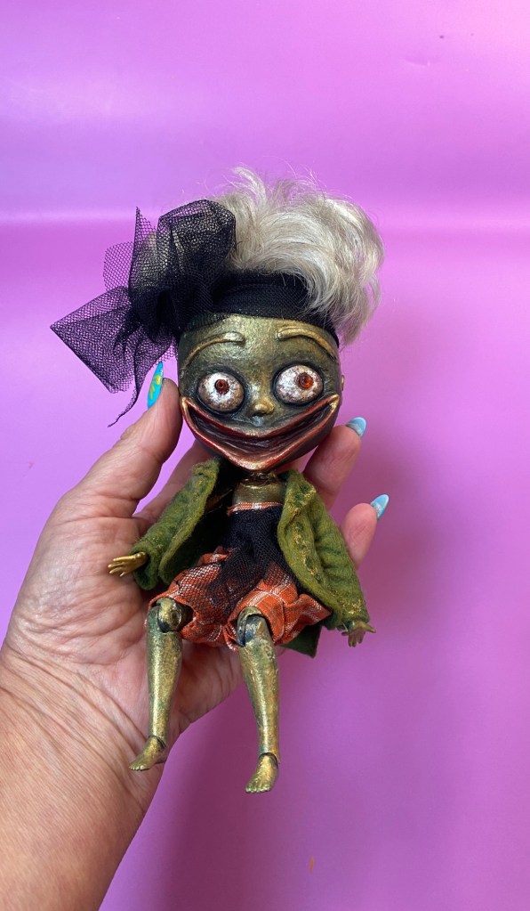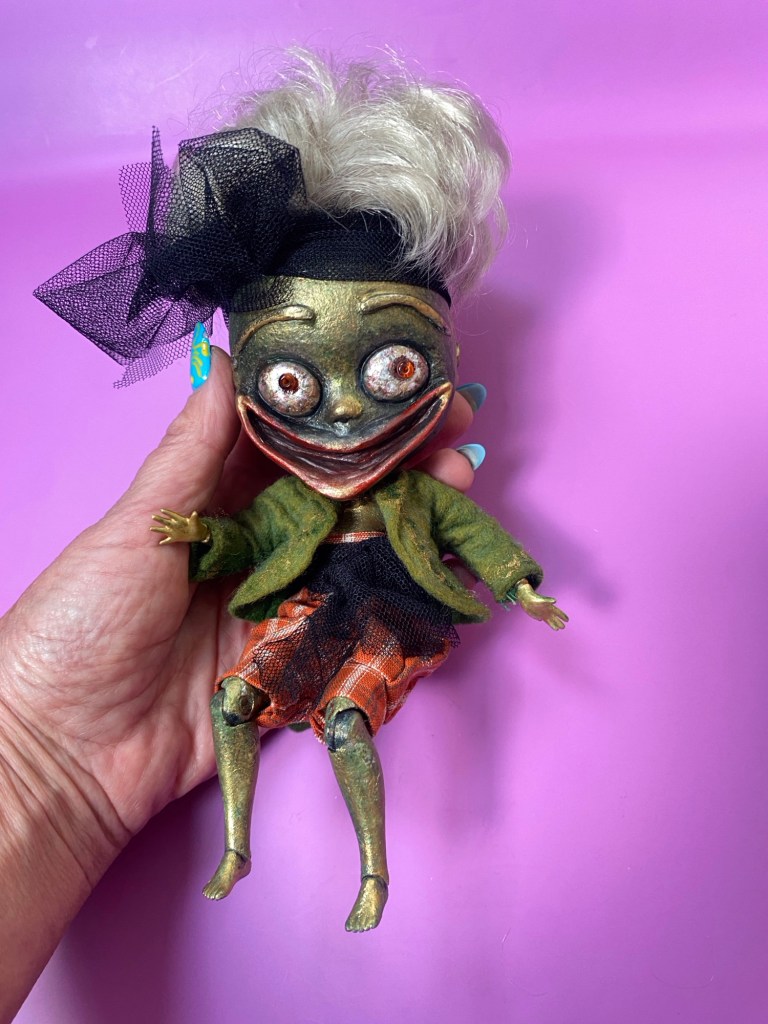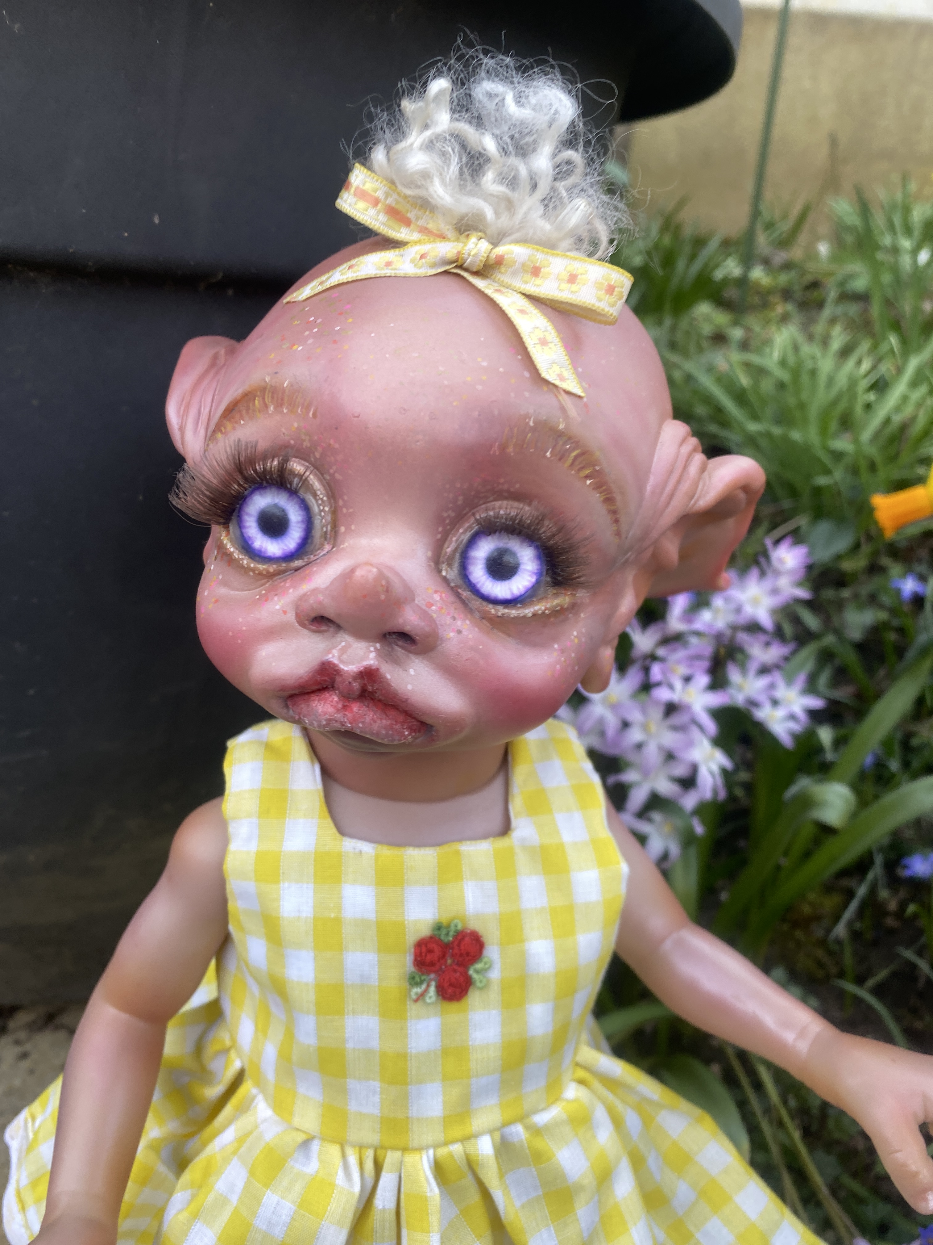 Meet Myrtle!.. she’s my fully customised hand sculptured Middie factory base Blythe doll from my “Happy Monster” series. Created by me “The Dolly Fairy” from a factory base Blythe Middie doll. I hand crafted Myrtle’s features with much love, carving and sculpturing giving her a wide open smiling mouth, moulded brows and googly eyes made by hand with beaded centres (eyes are fixed/non moveable). Her face painting was created with many layers of professional products to give depth, definition and character, each stage fully sealed with MSC flat and gloss to finish. Myrtle is 20 cm in height (1/8 scale). Please note my hand customised art dolls are designed for serious collectors and are not suitable for children to play with. She comes with outfit as shown.