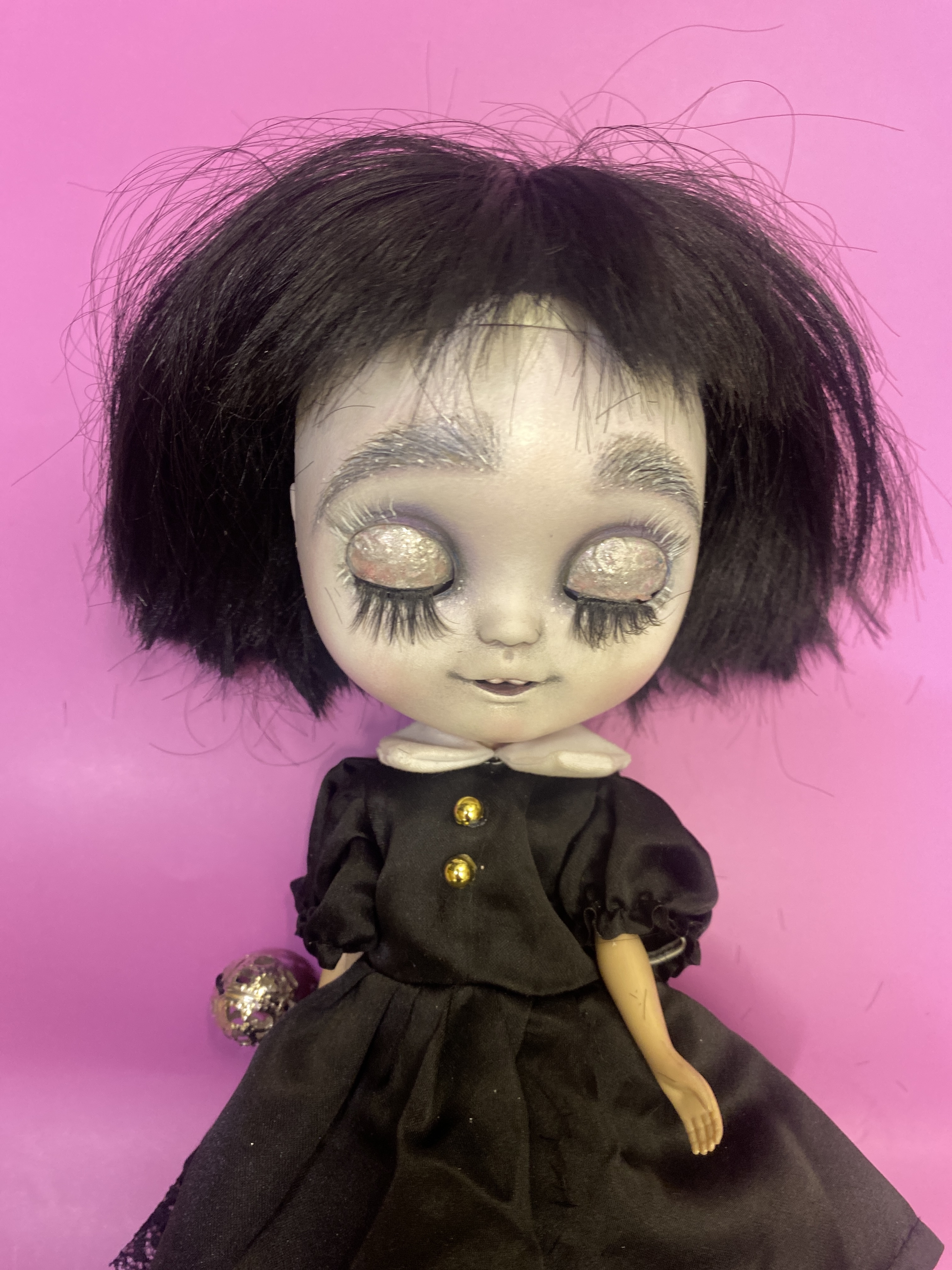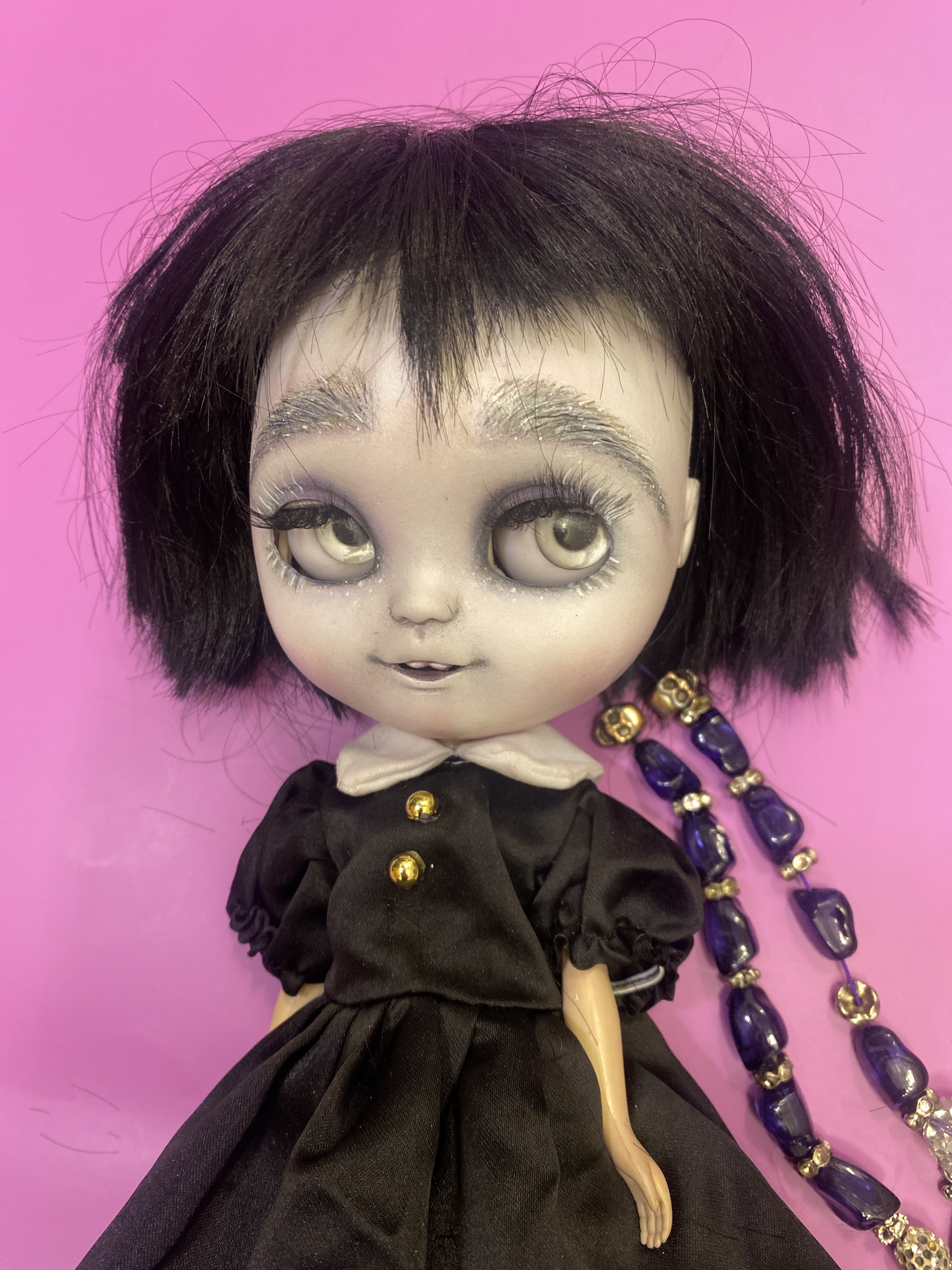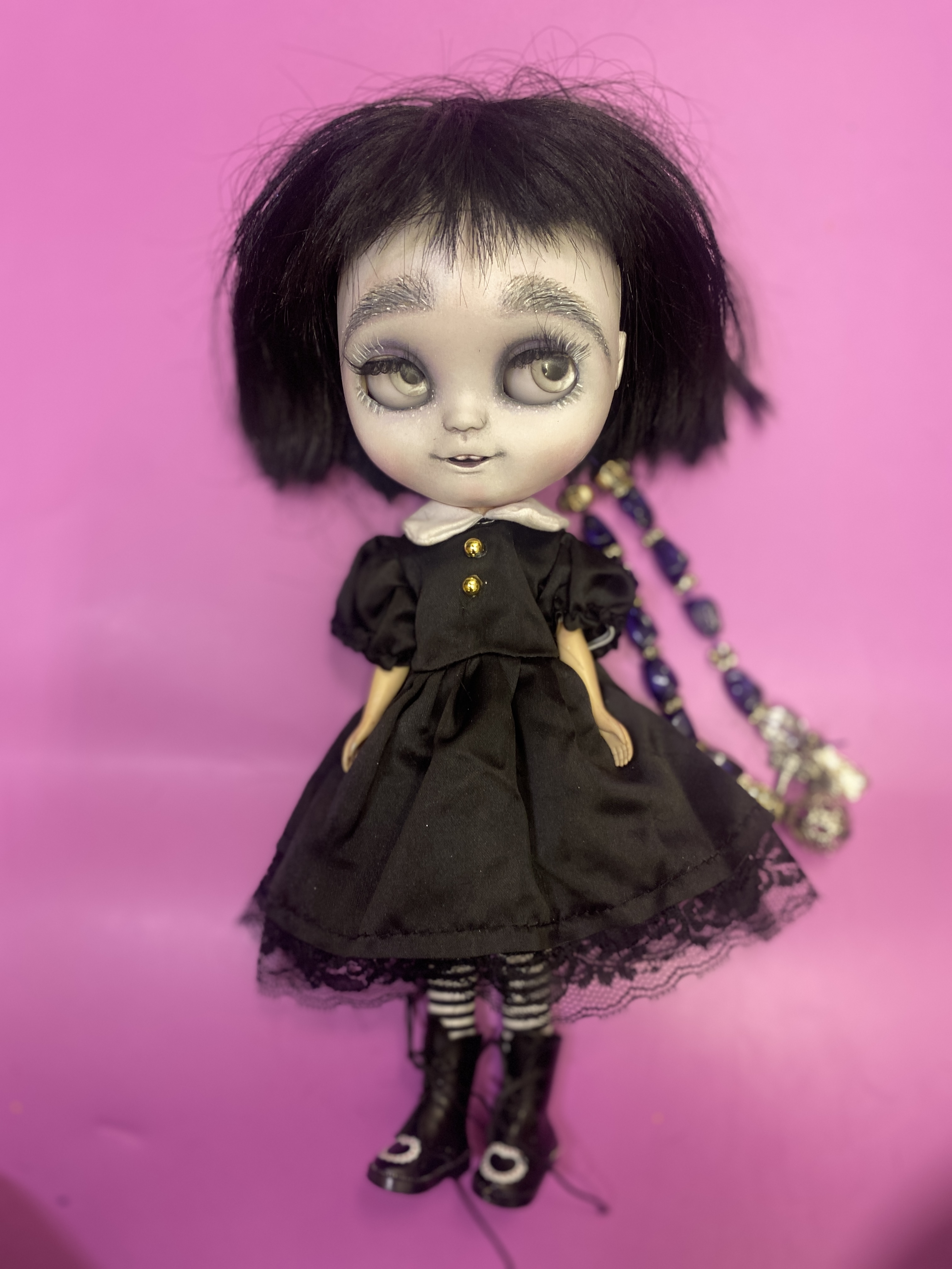 Introducing “Eve”.. my totally unique one of a kind (Ooak) Blythe doll fully hand customised by me UK doll artist “The Dolly Fairy”. Her base was an ICY factory Blythe Takara style (Licca) straight leg doll. I’ve given Eve four new sets of super spooky 3D eye chips and converted the mech into sleepy eyes, 2 strings with amazing vintage gothic beads/charms and new thick fluffy lashes. I hand carved Eve’s features, created her facial art work using professional art products, each layer sealed by many layers of MSC. I then cut and styled her hair into an adorable crazy bob. Eve comes just as shown in her Wednesday Adams/goth inspired outfit just as shown in her photos. There’s only one of my Eve in the whole wide world (by me), I never repeat my pieces don’t miss her! x