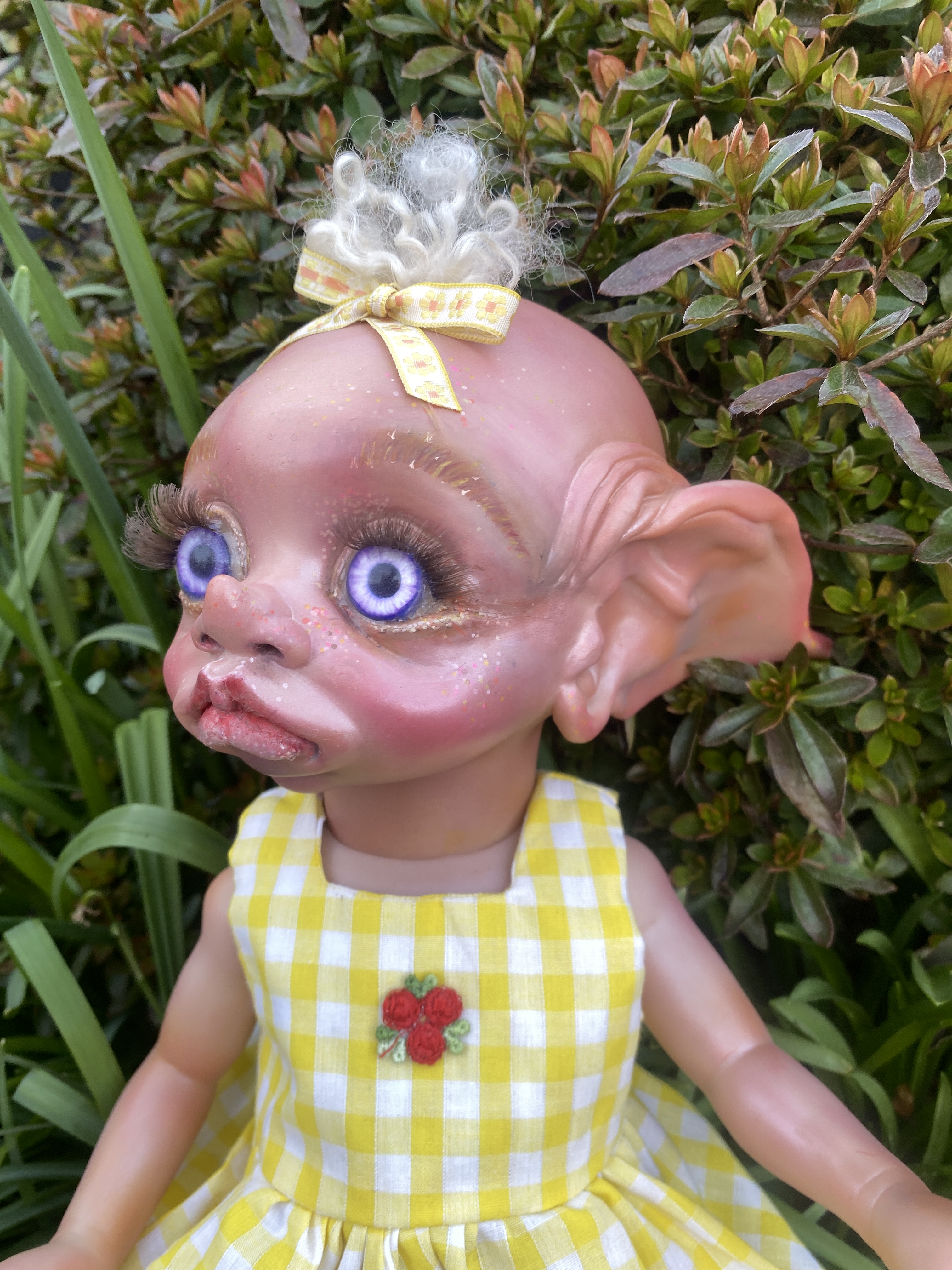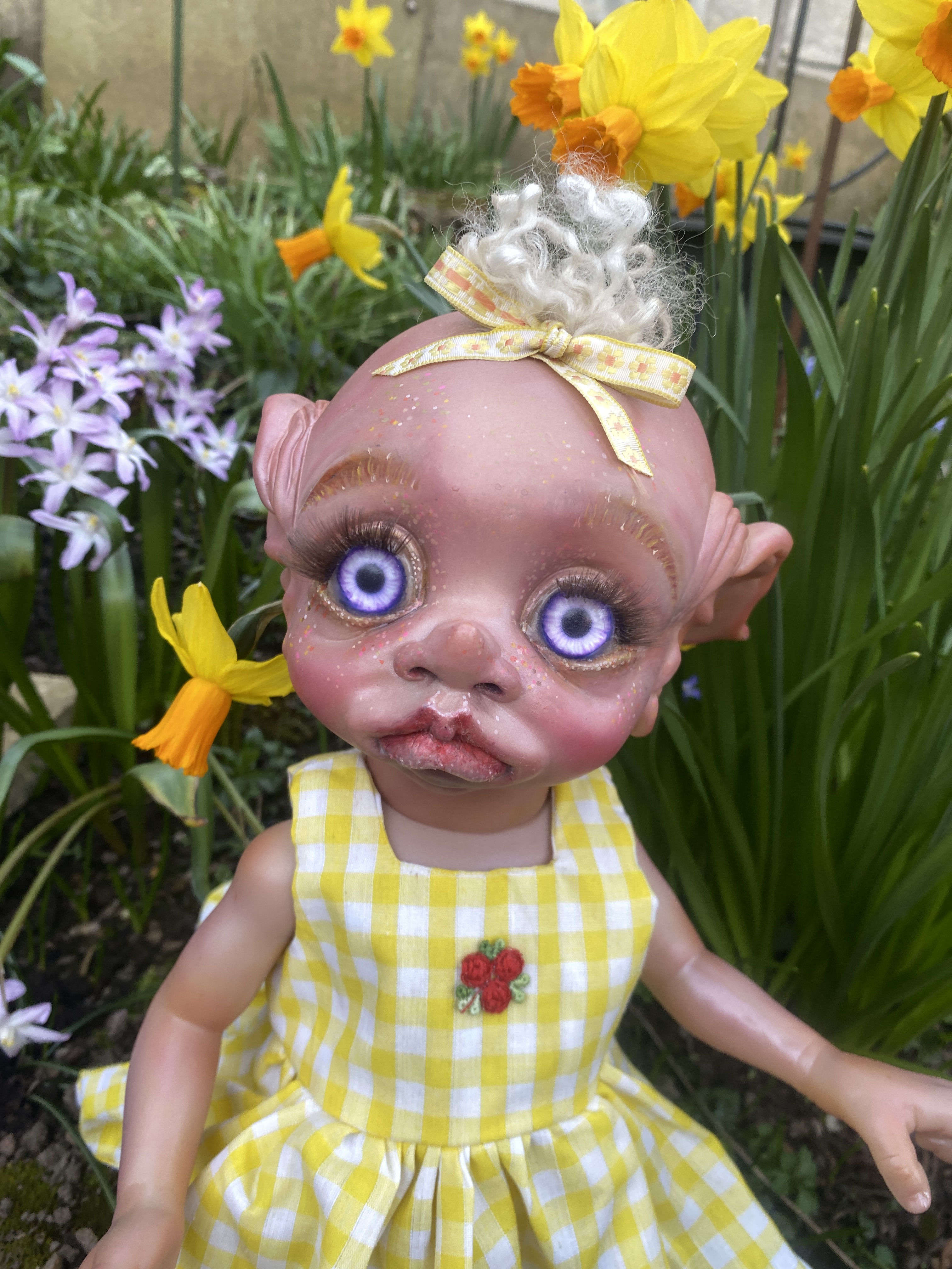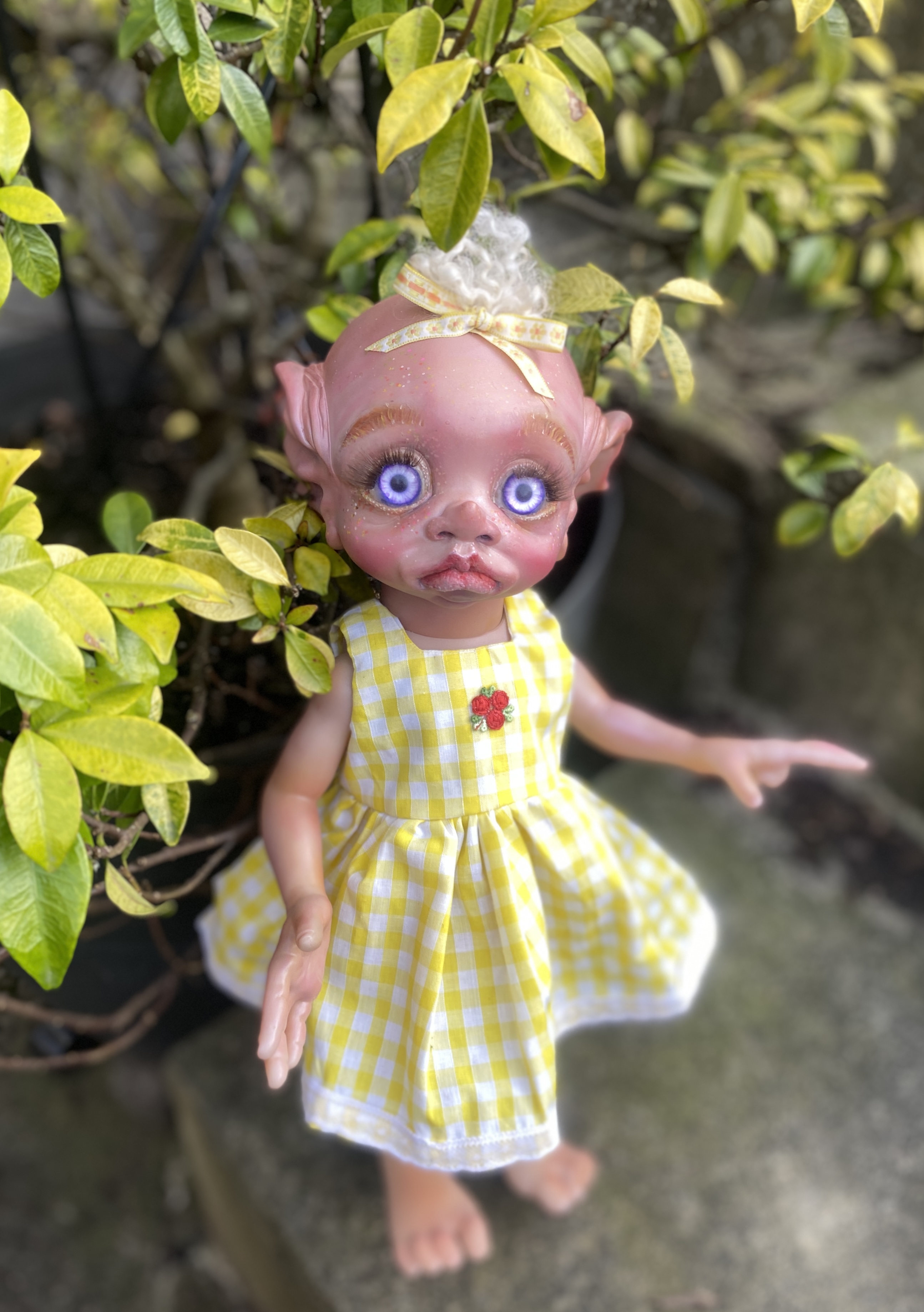 Ettie the Elf is my Ooak (one of a kind) Tinky Fairy Elf reborn doll hand customised by me “The Dolly Fairy”. 17 inches in height, she’s made from super quality weighty silicone vinyl with bright lilac inset eyes (hand made by me), long curly lashes, adorable squishy pronounced features and those amazing big pointy ears!. Ettie is jointed at the head and limbs and can sit and stand nicely. I created this special little girl’s face up using professional quality products, all layers sealed with MSC. This delightful little Elfin girl comes just as her photos in beatifully made gingham dress and knickers set.