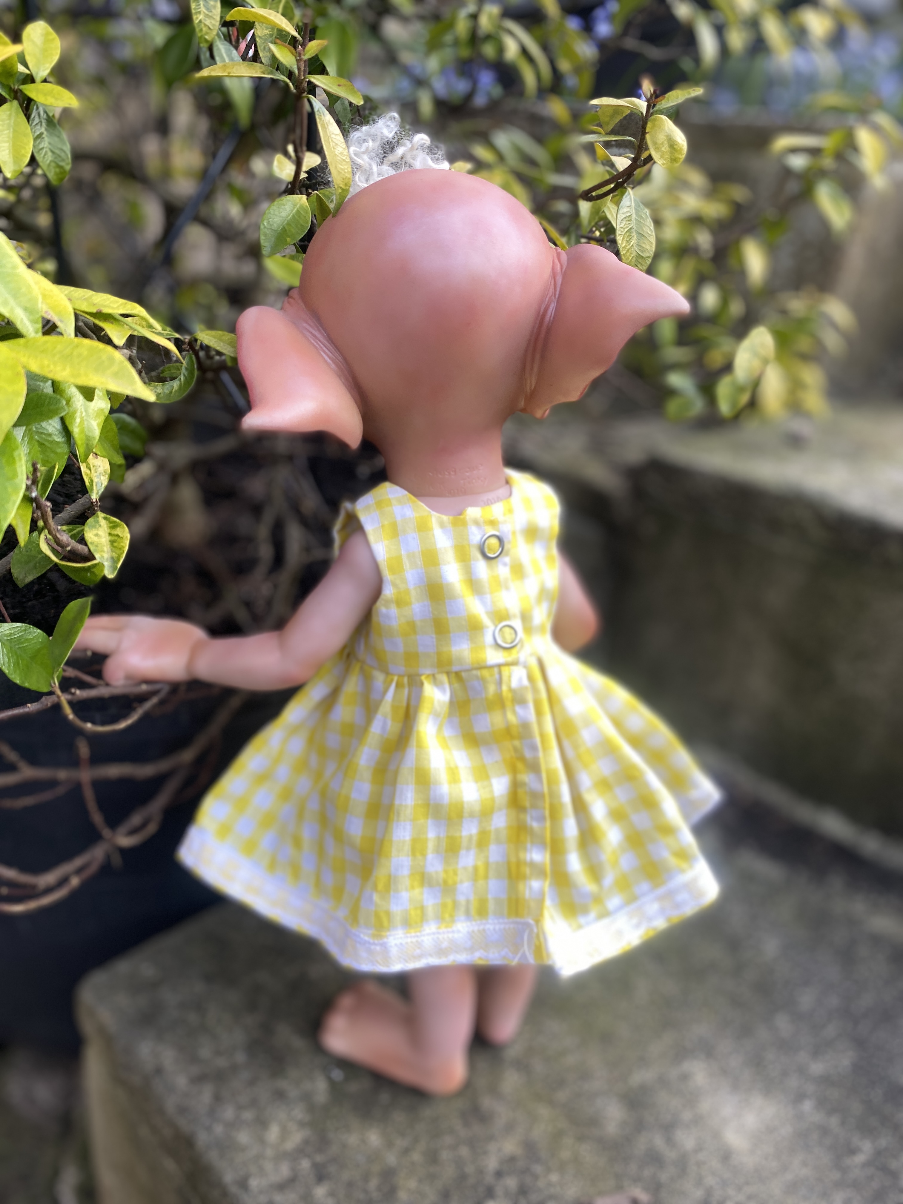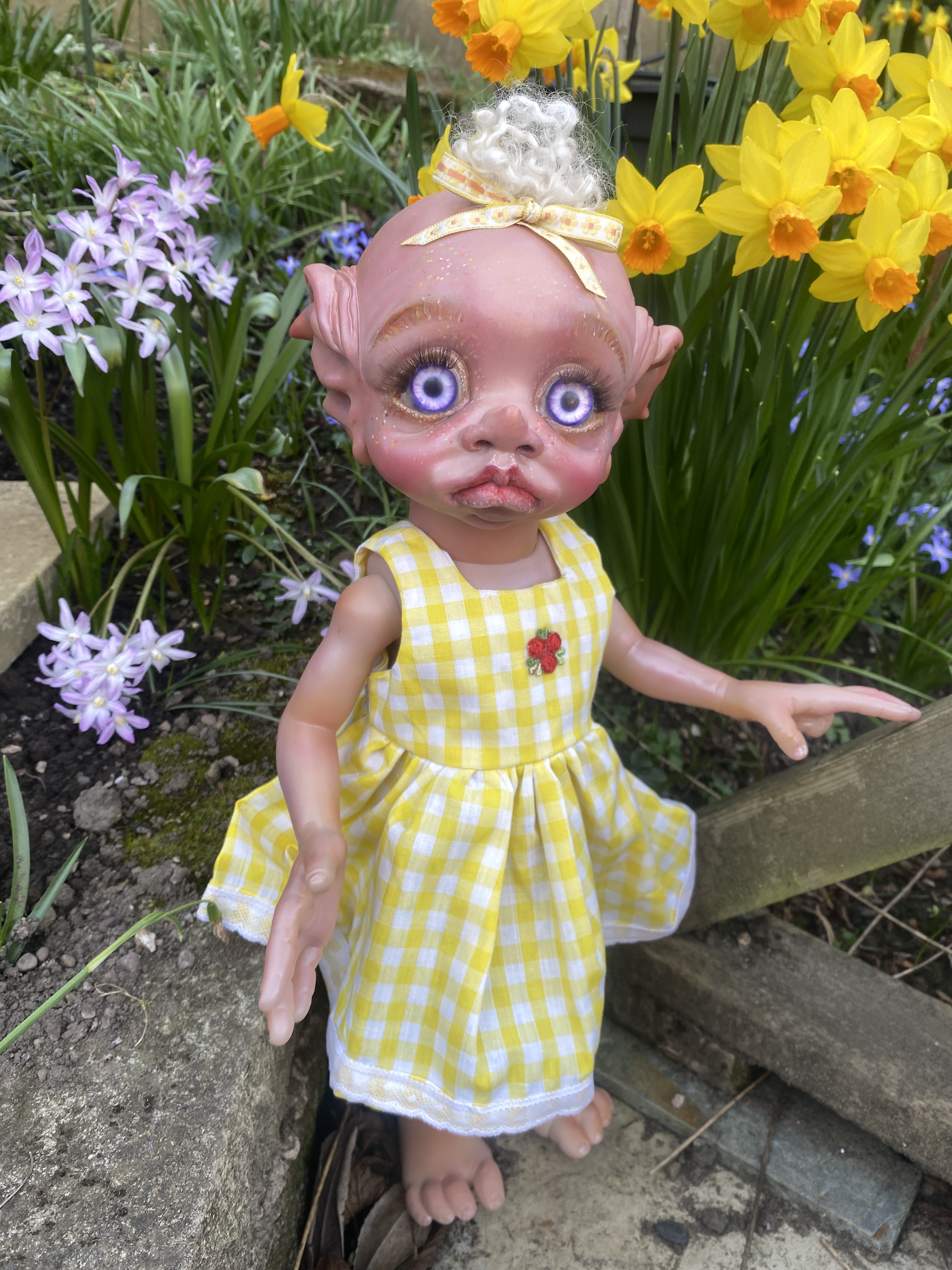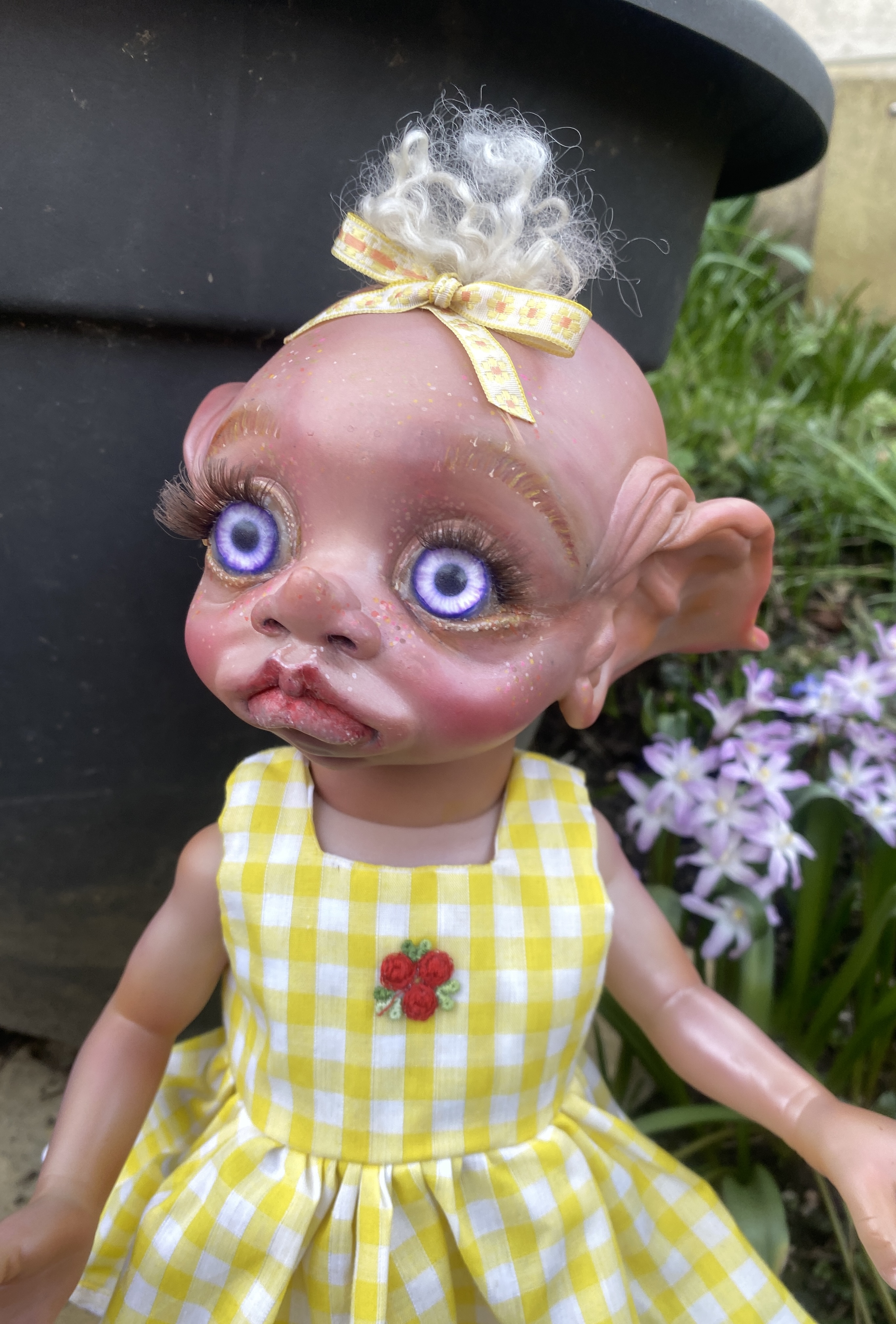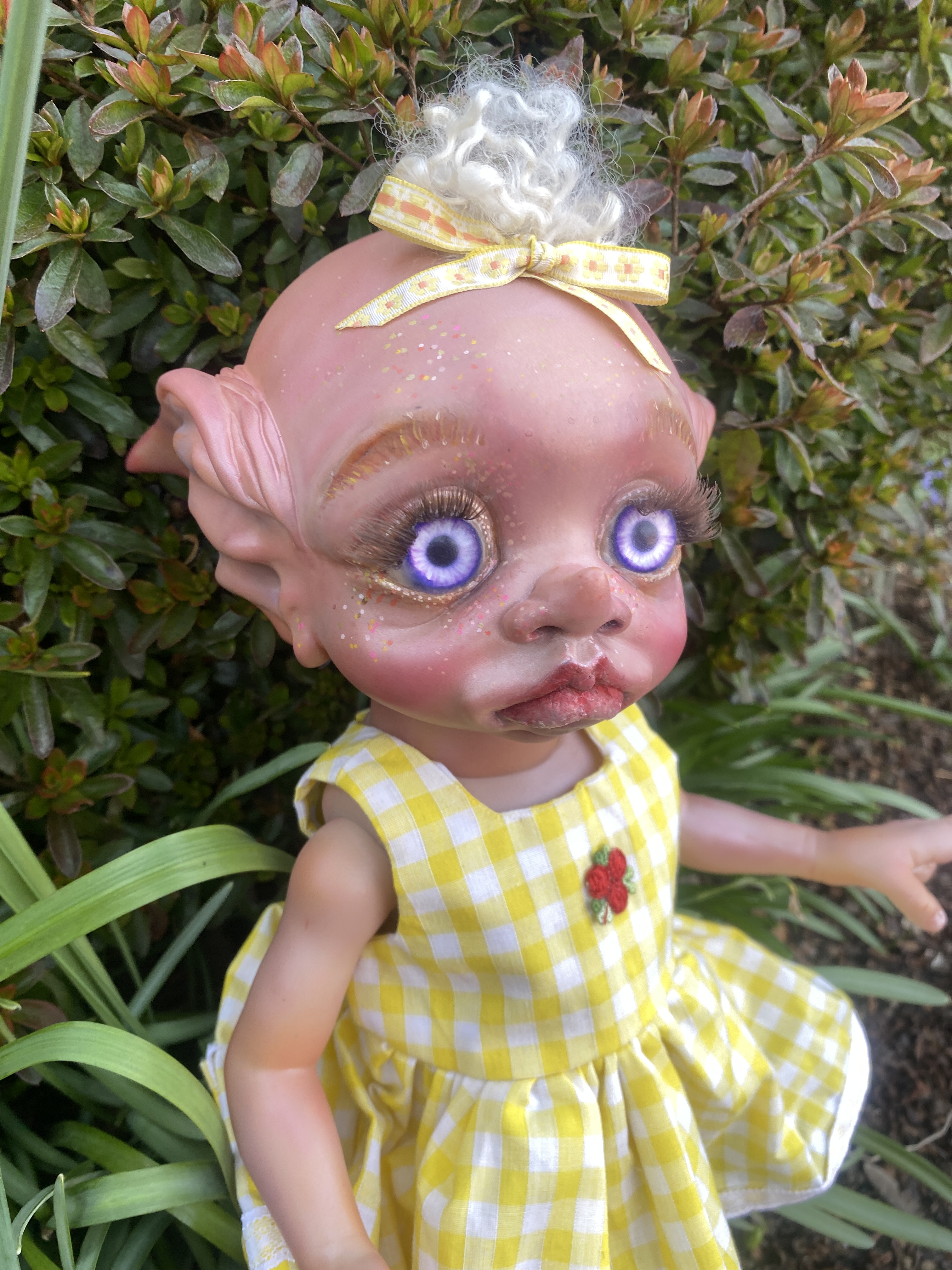 Ettie the Elf is my Ooak (one of a kind) Tinky Fairy Elf reborn doll hand customised by me “The Dolly Fairy”. 17 inches in height, she’s made from super quality weighty silicone vinyl with bright lilac inset eyes (hand made by me), long curly lashes, adorable squishy pronounced features and those amazing big pointy ears!. Ettie is jointed at the head and limbs and can sit and stand nicely. I created this special little girl’s face up using professional quality products, all layers sealed with MSC. This delightful little Elfin girl comes just as her photos in beatifully made gingham dress and knickers set.
