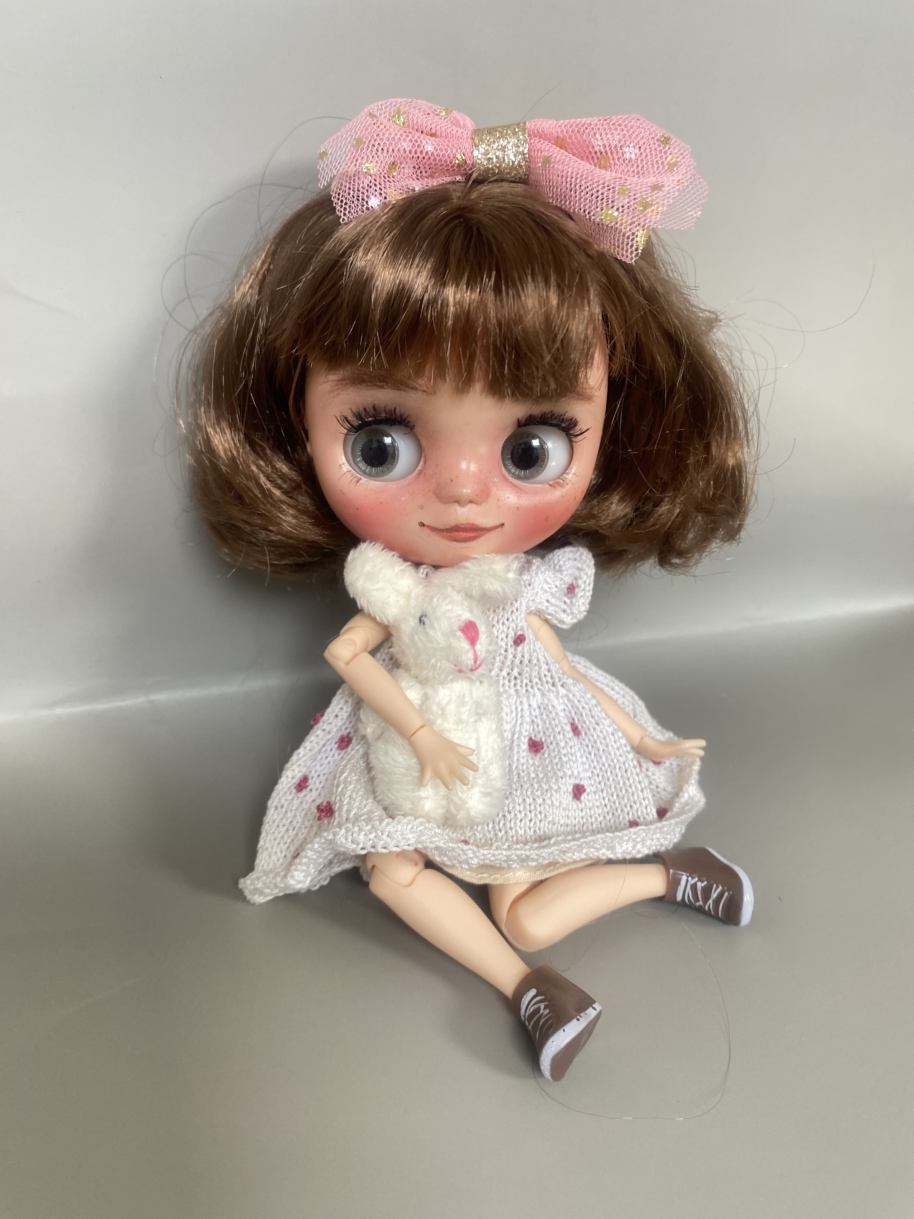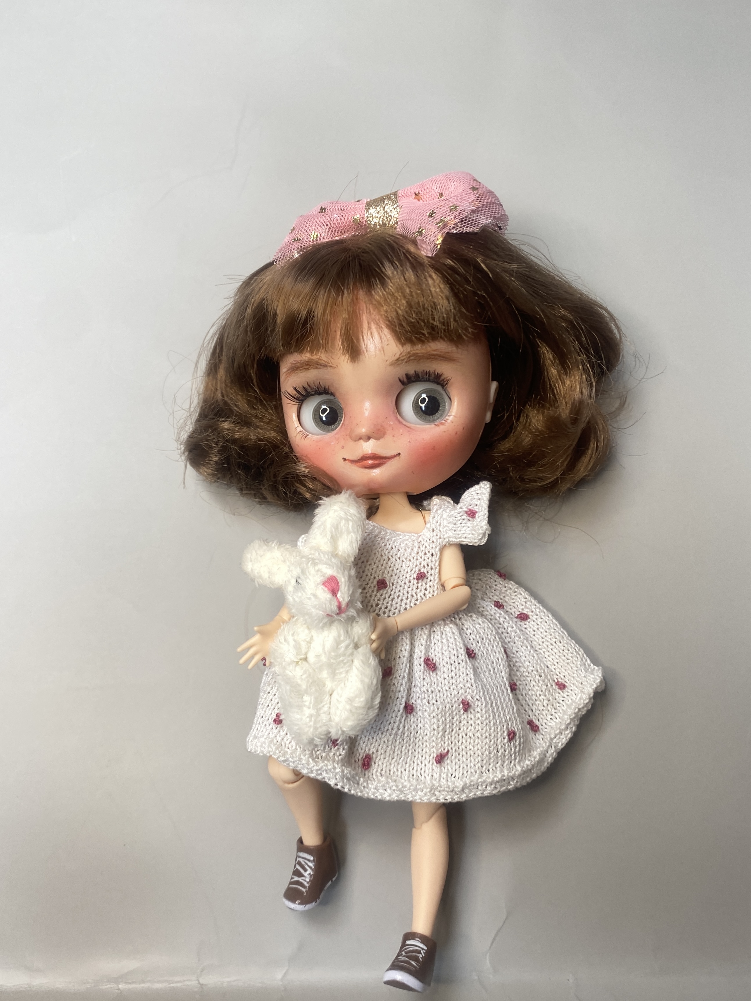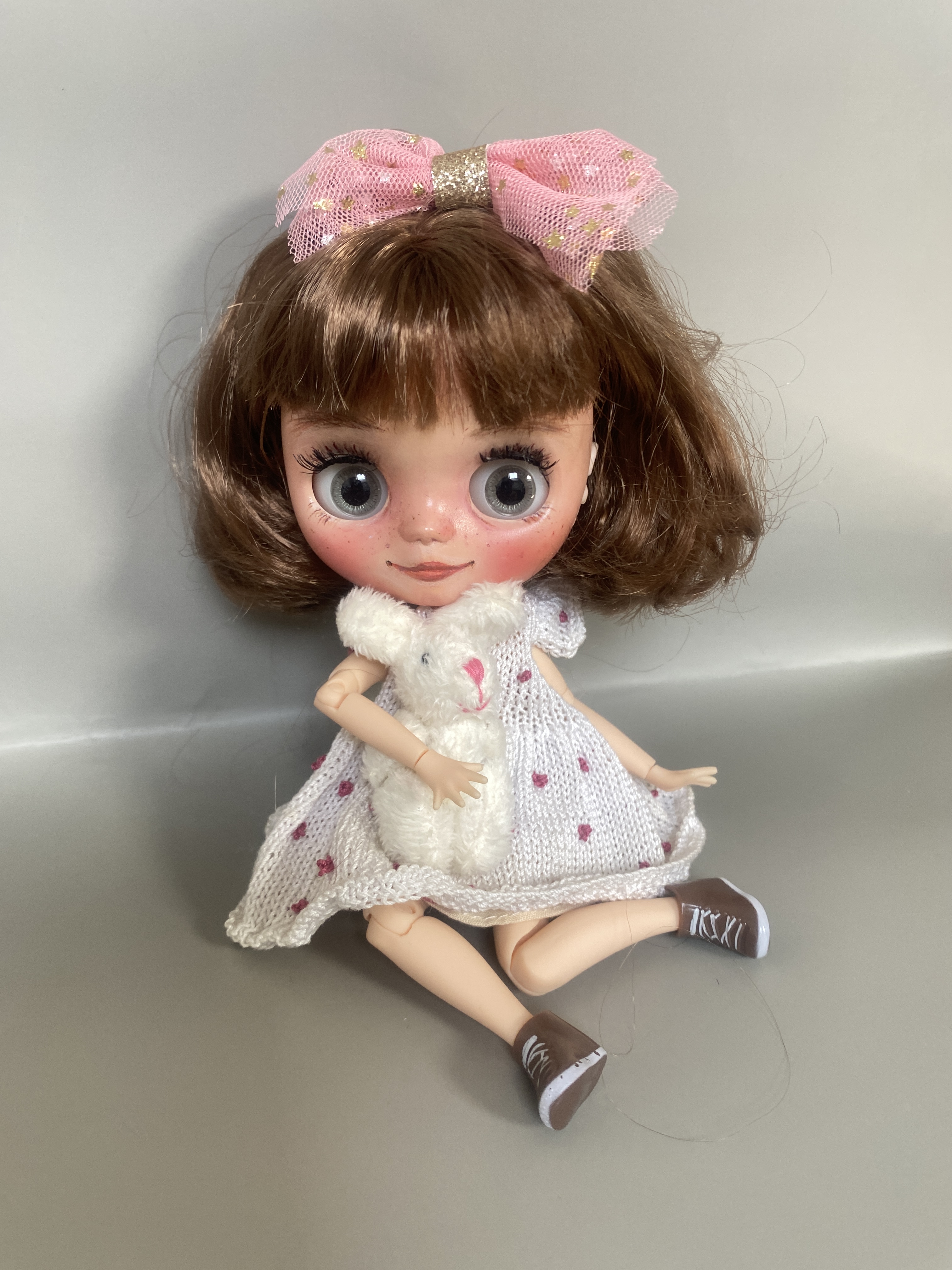Meet my latest creation Mary!..Her base is a factory DBS Middie doll (Blythe little sister doll). I’ve given her a full custom face-up, using professional quality products, pan pastels, gouache and Derwent water colour pencils, each layer of which sealed with MSC. Mary comes just as found in her adorable finely hand knitted dress with matching knickers along with plastic moulded shoes (shoes are the split back design to aid getting them on and off), big pink hair slide and Harry the floppy earred rabbit who will also travel with her. 20 cm in height (1/8 scale). Middies have a dial at the back of their heads to change eye position from right to left instead of a pullstring. Their multi jointed limbs make them super little posers.