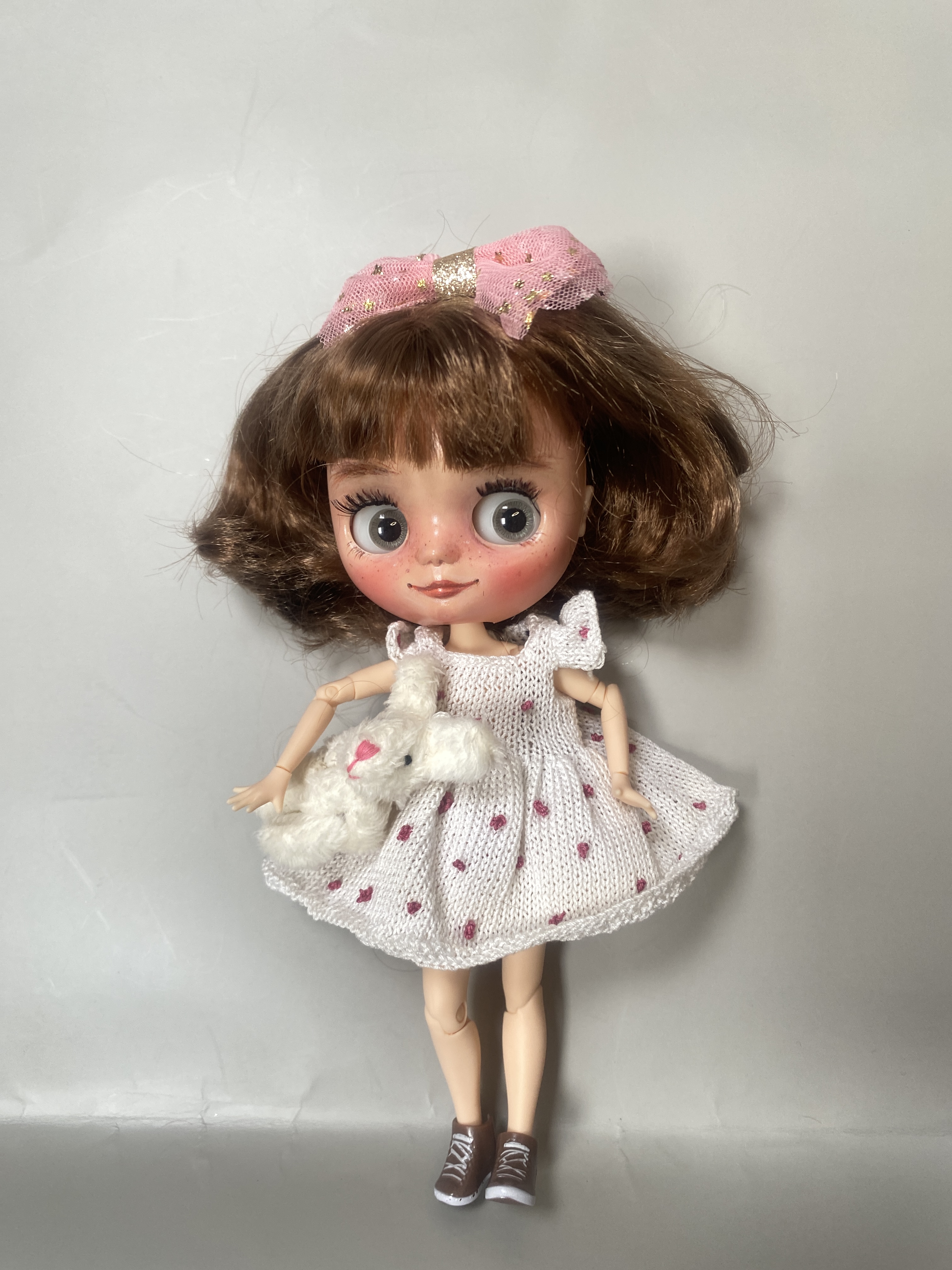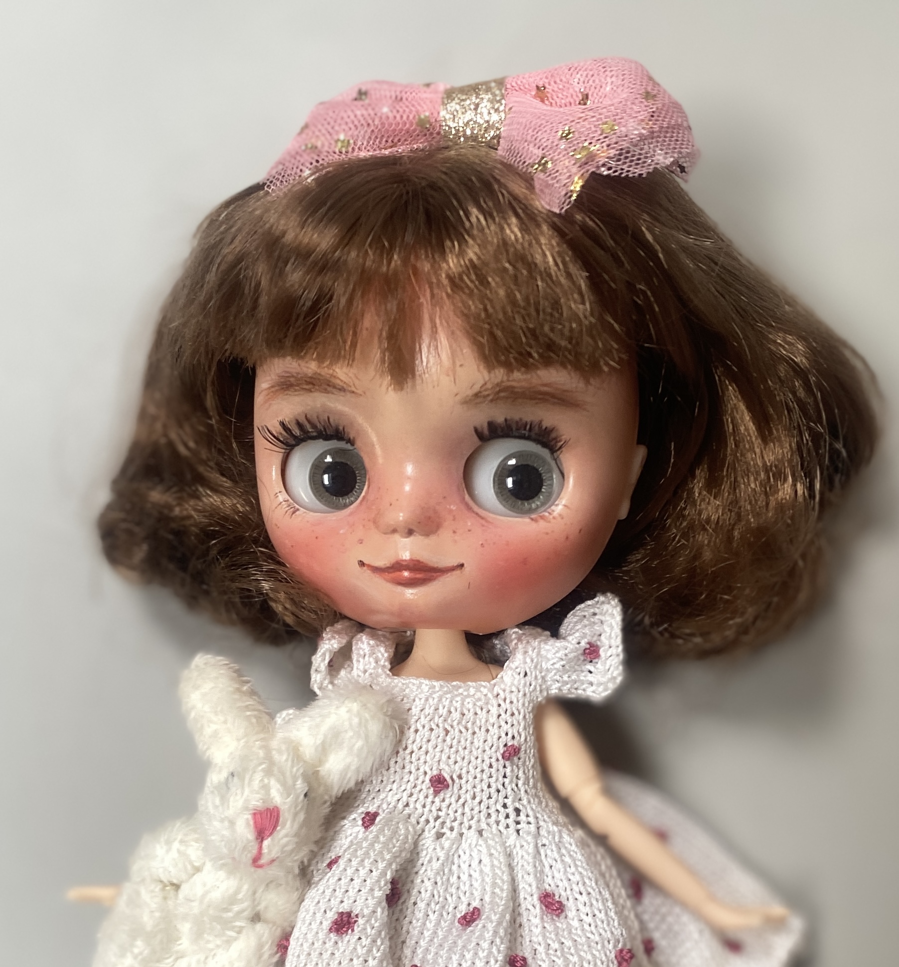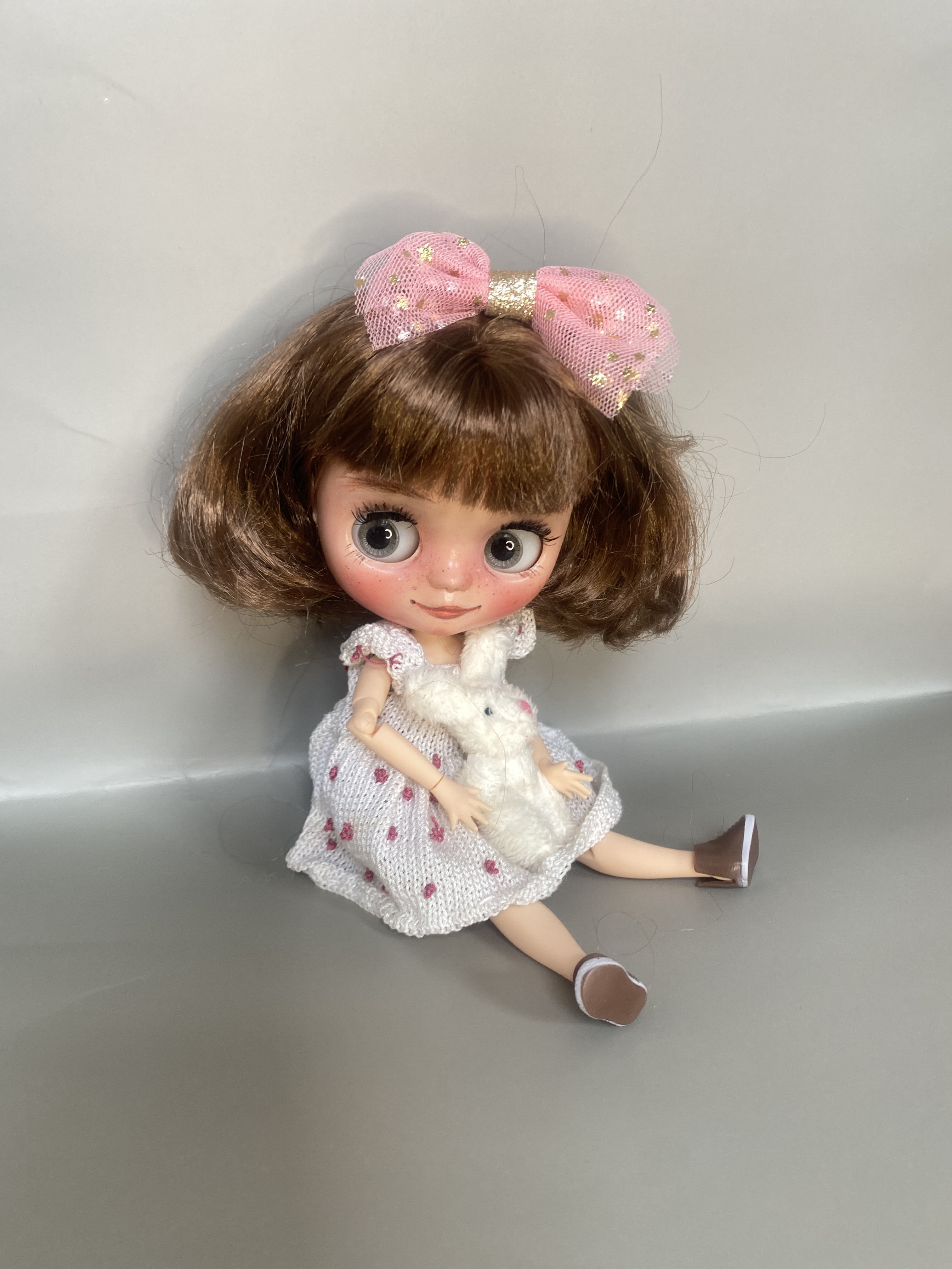 Meet my latest creation Mary!..Her base is a factory DBS Middie doll (Blythe little sister doll). I’ve given her a full custom face-up, using professional quality products, pan pastels, gouache and Derwent water colour pencils, each layer of which sealed with MSC. Mary comes just as found in her adorable finely hand knitted dress with matching knickers along with plastic moulded shoes (shoes are the split back design to aid getting them on and off), big pink hair slide and Harry the floppy earred rabbit who will also travel with her. 20 cm in height (1/8 scale). Middies have a dial at the back of their heads to change eye position from right to left instead of a pullstring. Their multi jointed limbs make them super little posers.