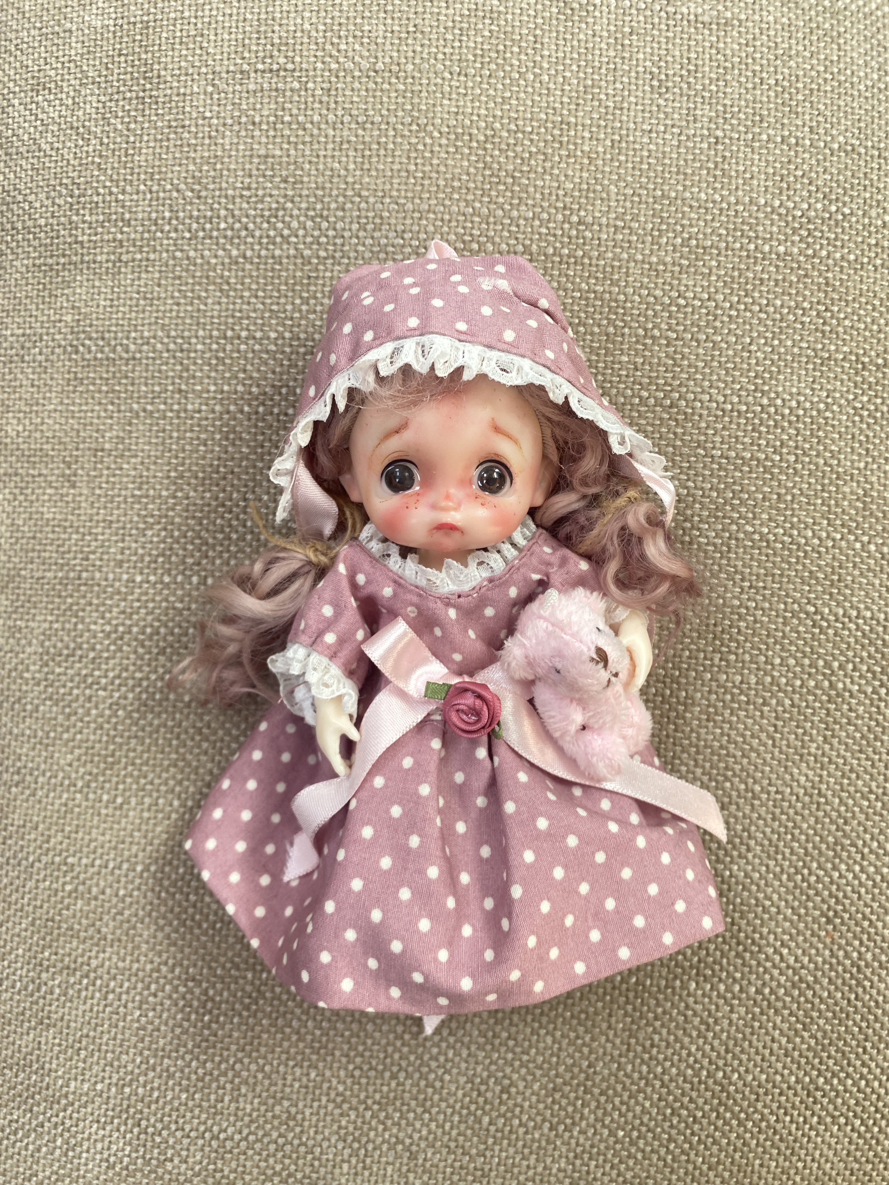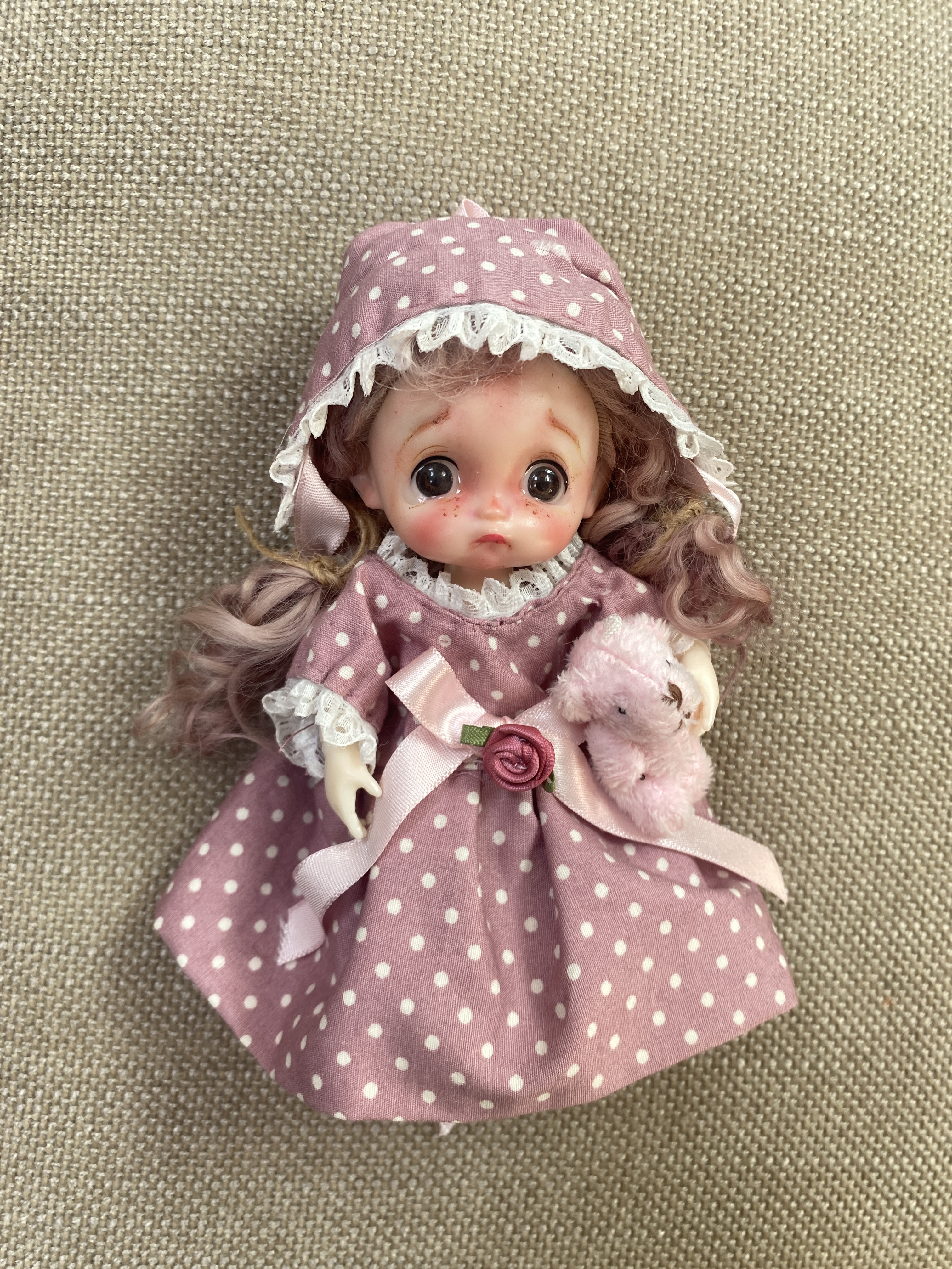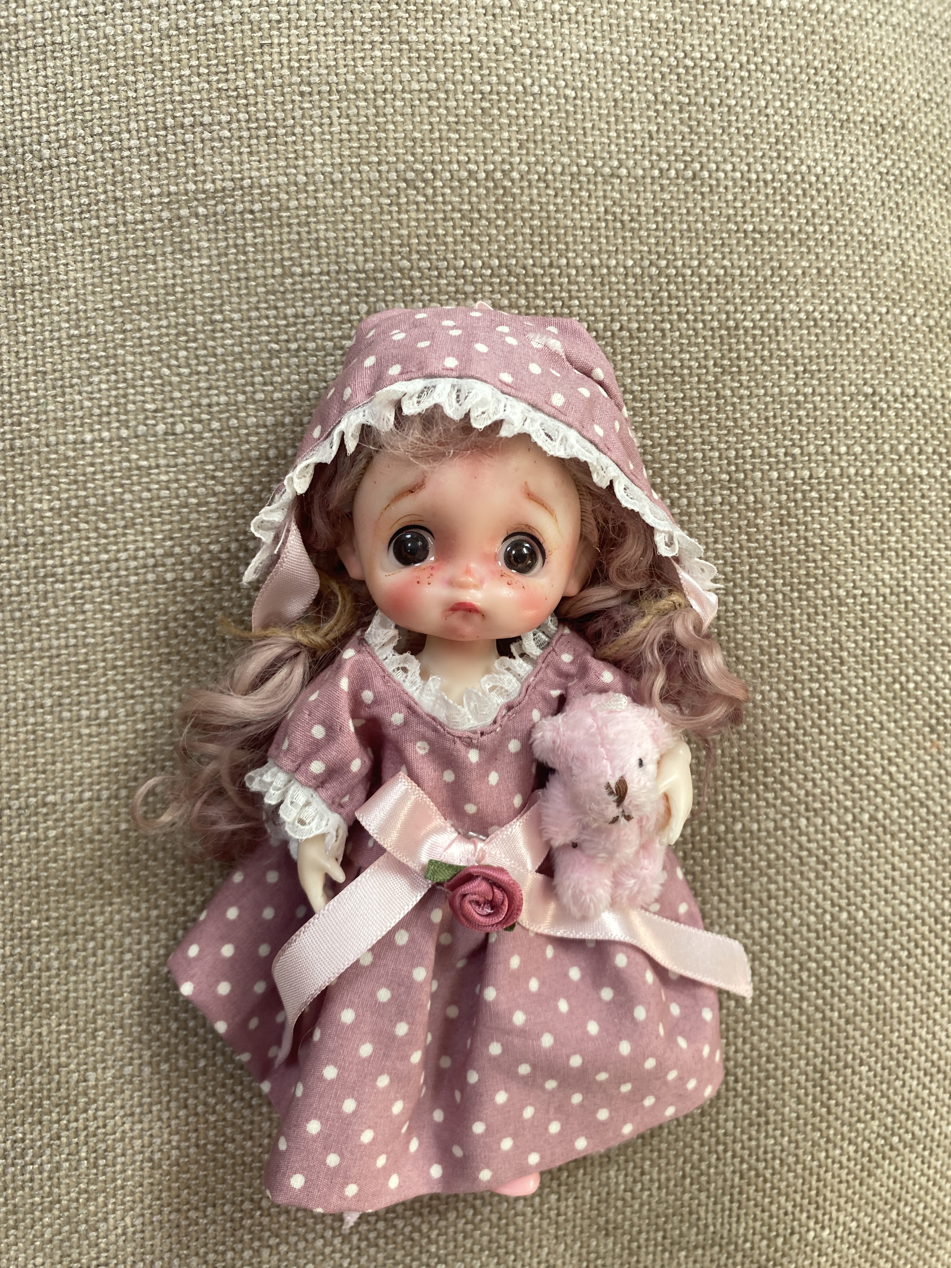 Heidi is the cutest little dinky doll hand customised by me “The Dolly Fairy”. She’s a 14 cm 1:12 scale BJD DBS factory base doll who comes with her outfit as shown and her pink teddy. Heidi is on her basic jointed factory body. I created her teary little face up using professional quality products (each layer sealed with MSC) and hand made her braided wig from curly Teeswater locks (not re-styleable or for children to play with).