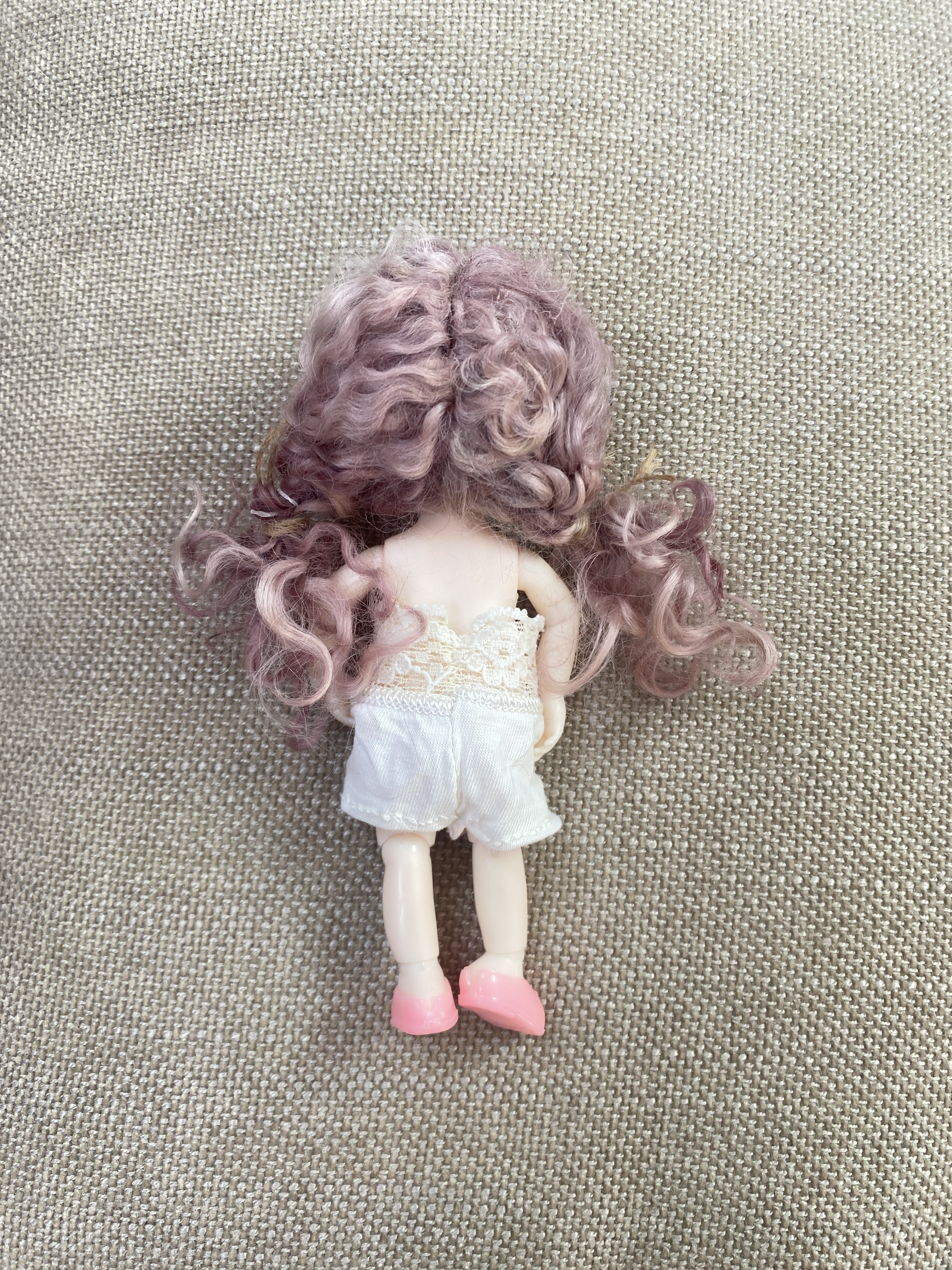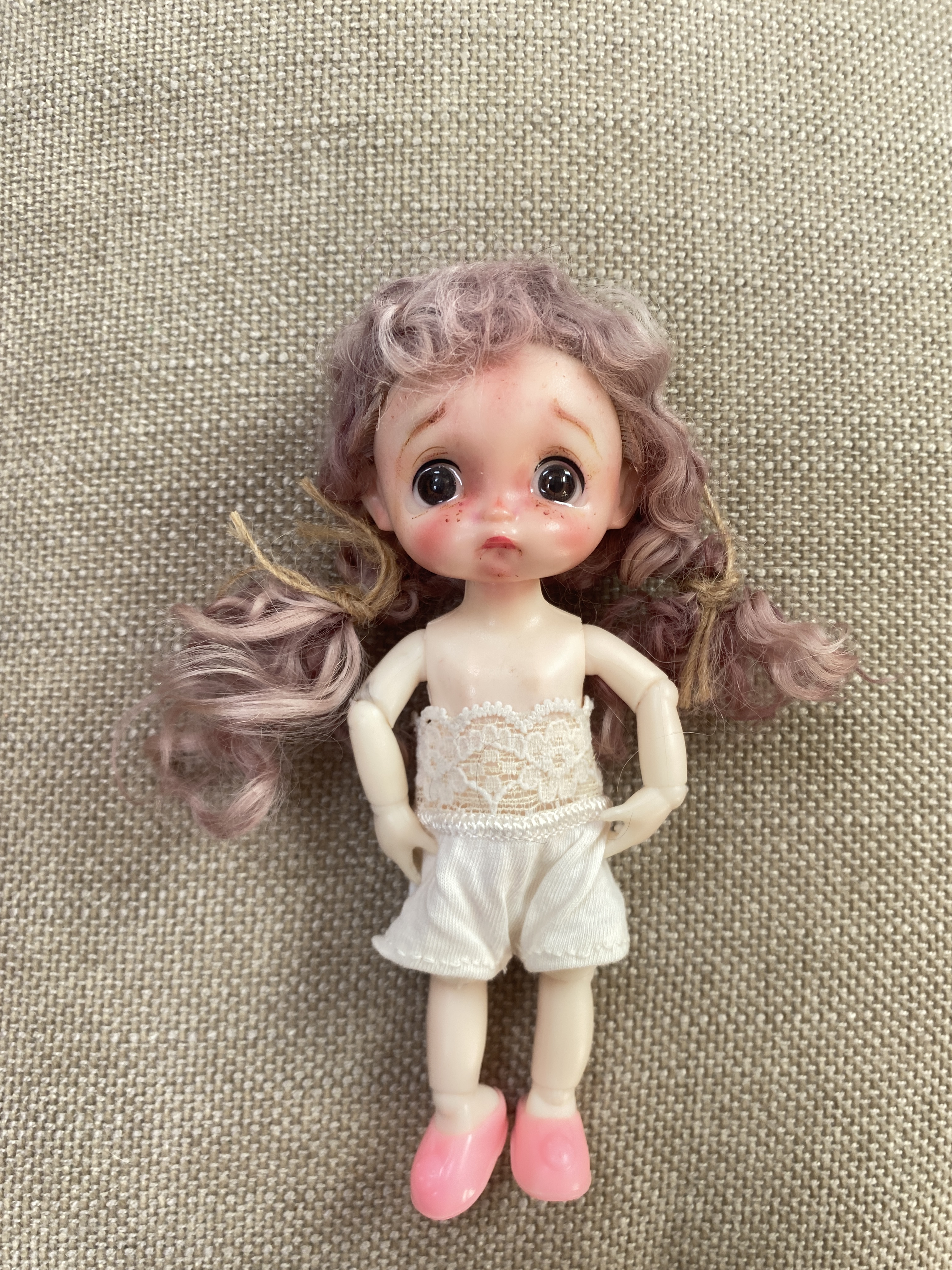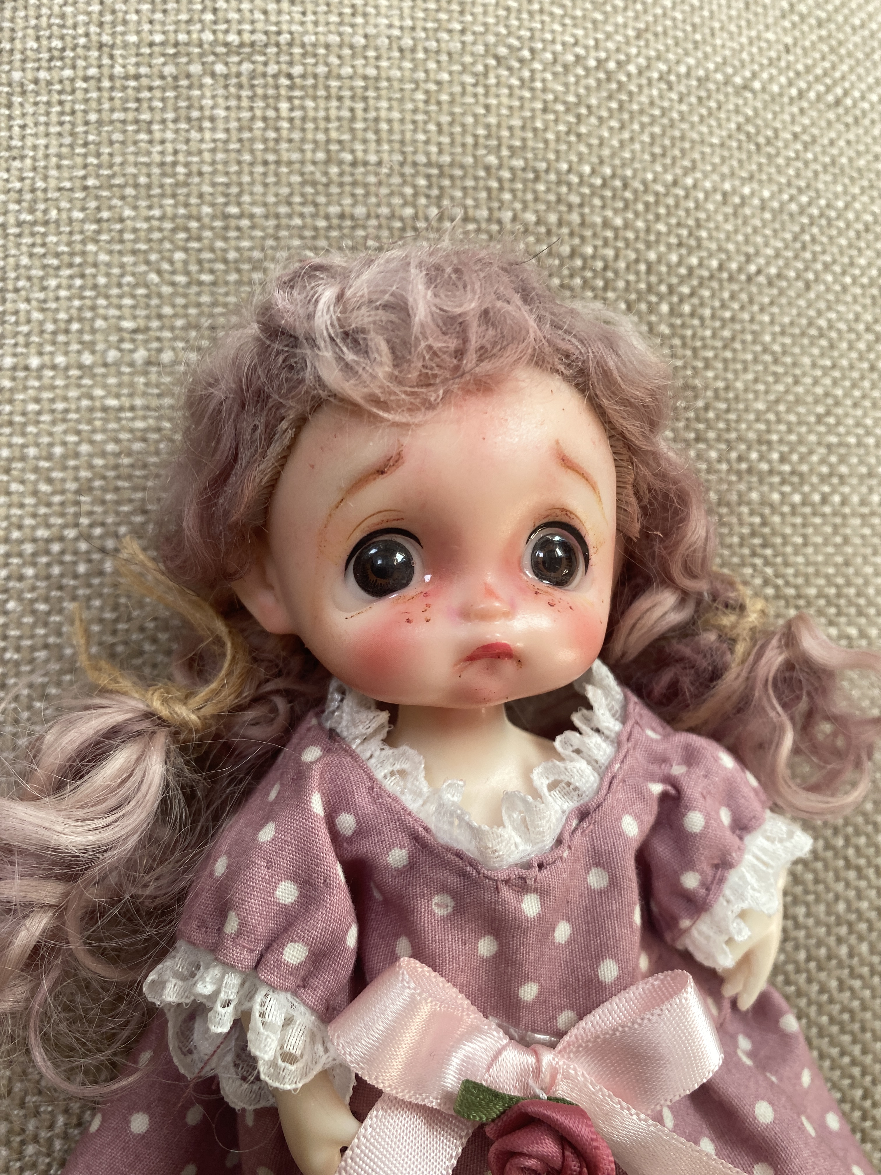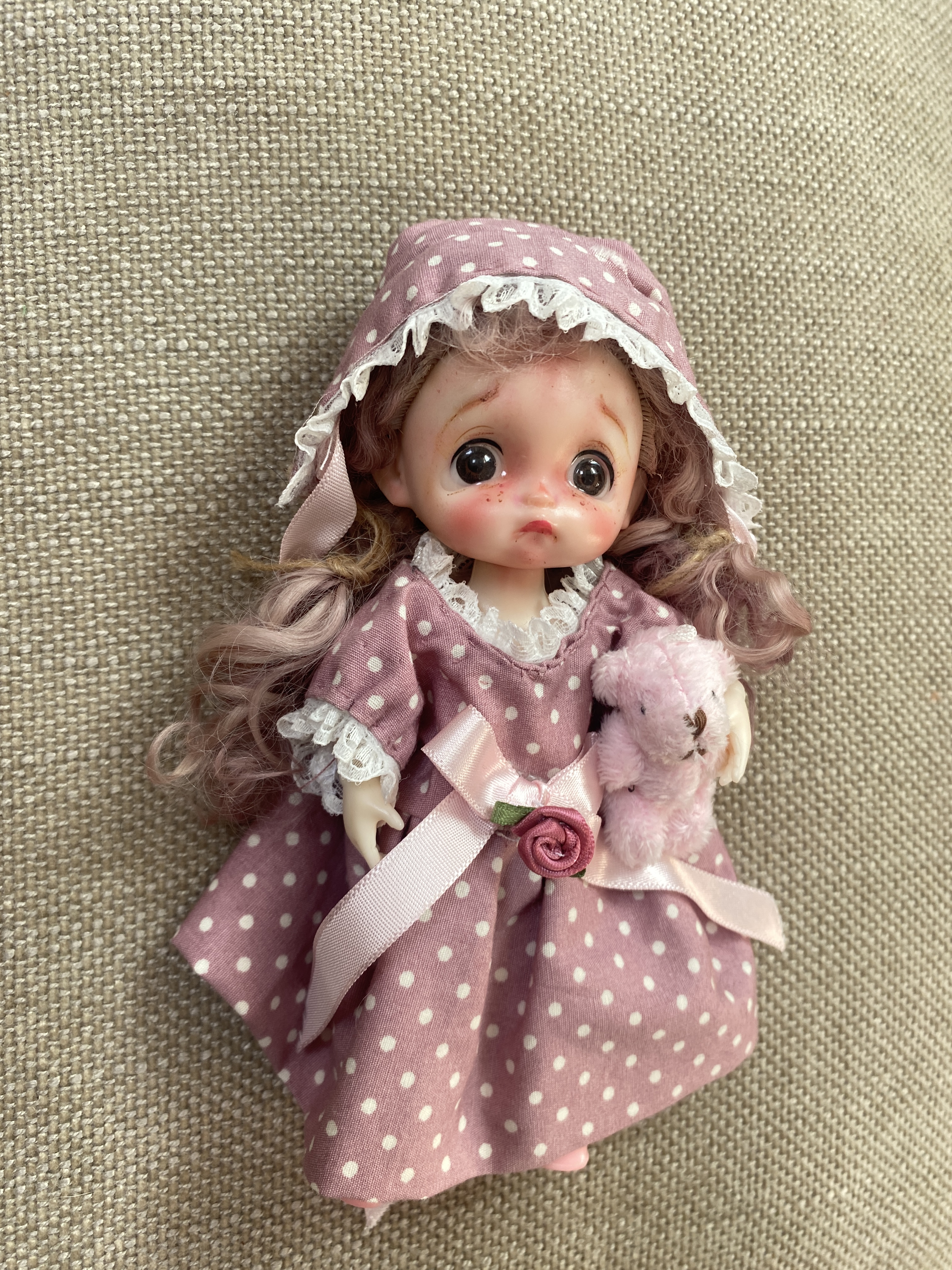 Heidi is the cutest little dinky doll hand customised by me “The Dolly Fairy”. She’s a 14 cm 1:12 scale BJD DBS factory base doll who comes with her outfit as shown and her pink teddy. Heidi is on her basic jointed factory body. I created her teary little face up using professional quality products (each layer sealed with MSC) and hand made her braided wig from curly Teeswater locks (not re-styleable or for children to play with).