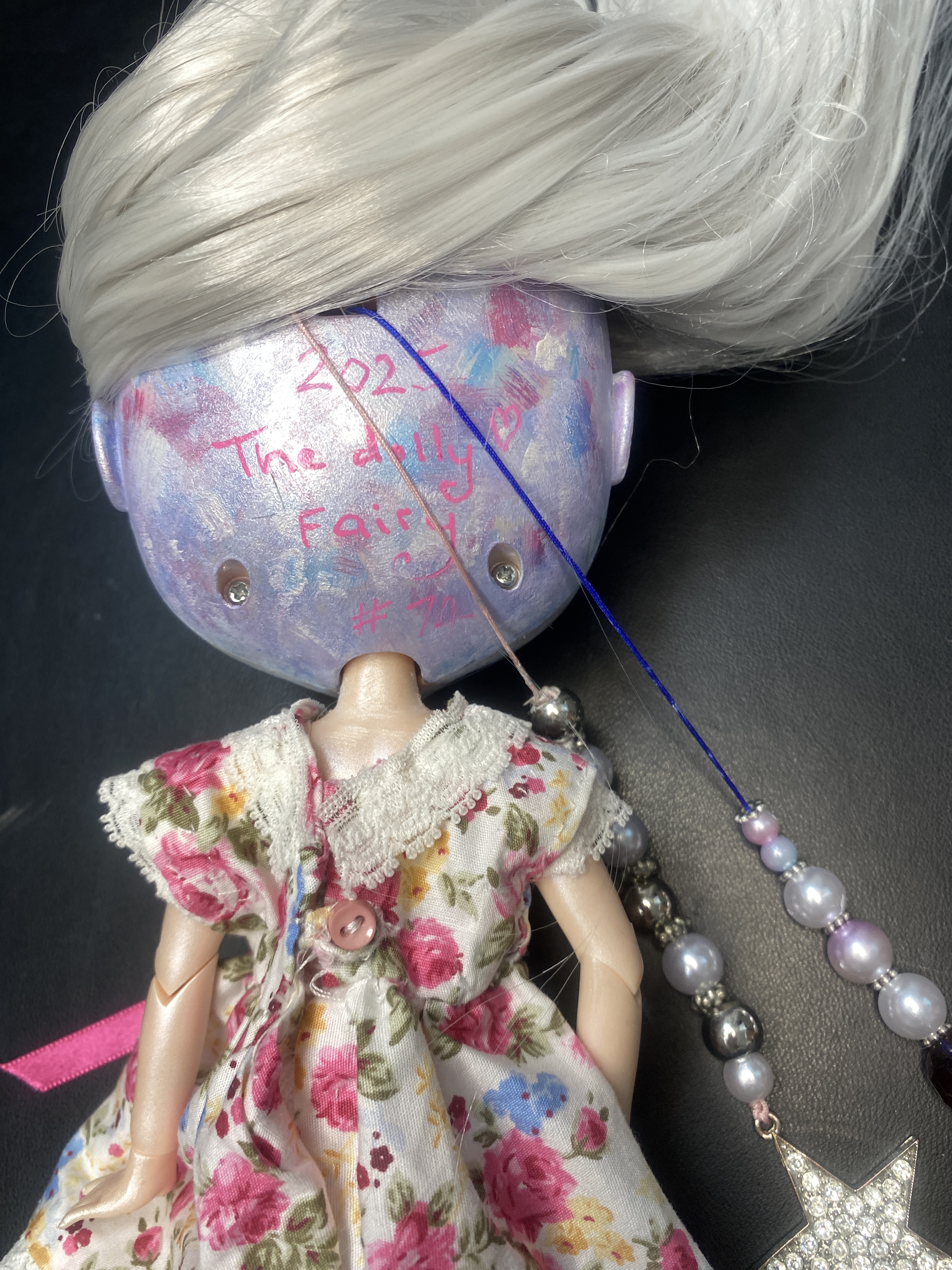The BJD dolls on this page are all unique hand customised creations by me “The Dolly Fairy”. I will never repeat my creations so please rest assured your doll will be the only one of her unique creation in the world. There will be no copies done by me. My artist dolls are for serious collectors only, they are unsuitable for children to play with. Each doll’s description will state the art work I have done whether hand sculpturing, facial carving, hand painting, wig making and adaptations such as eye mechanisms, gaze lifting, eye boggling, new eye chips, lashes etc.. Care always needs to be taken with eye changing mechanism cords, they are not designed for heavy handed use or for children to play with. Long haired Blythes especially need vigilence with eye changing, it’s important to put the hair up first to avoid strings/hair tangling and jamming the mechanism.