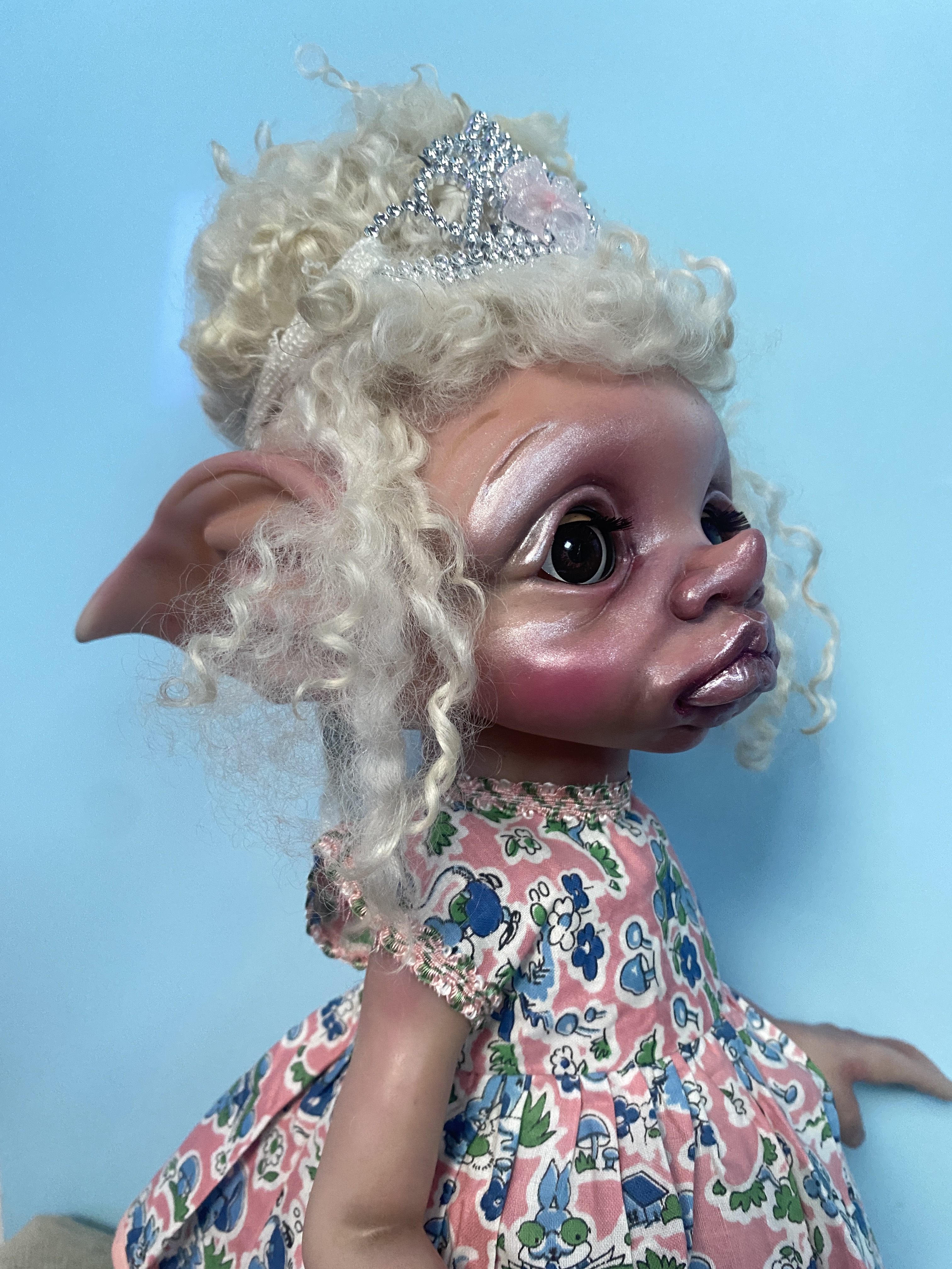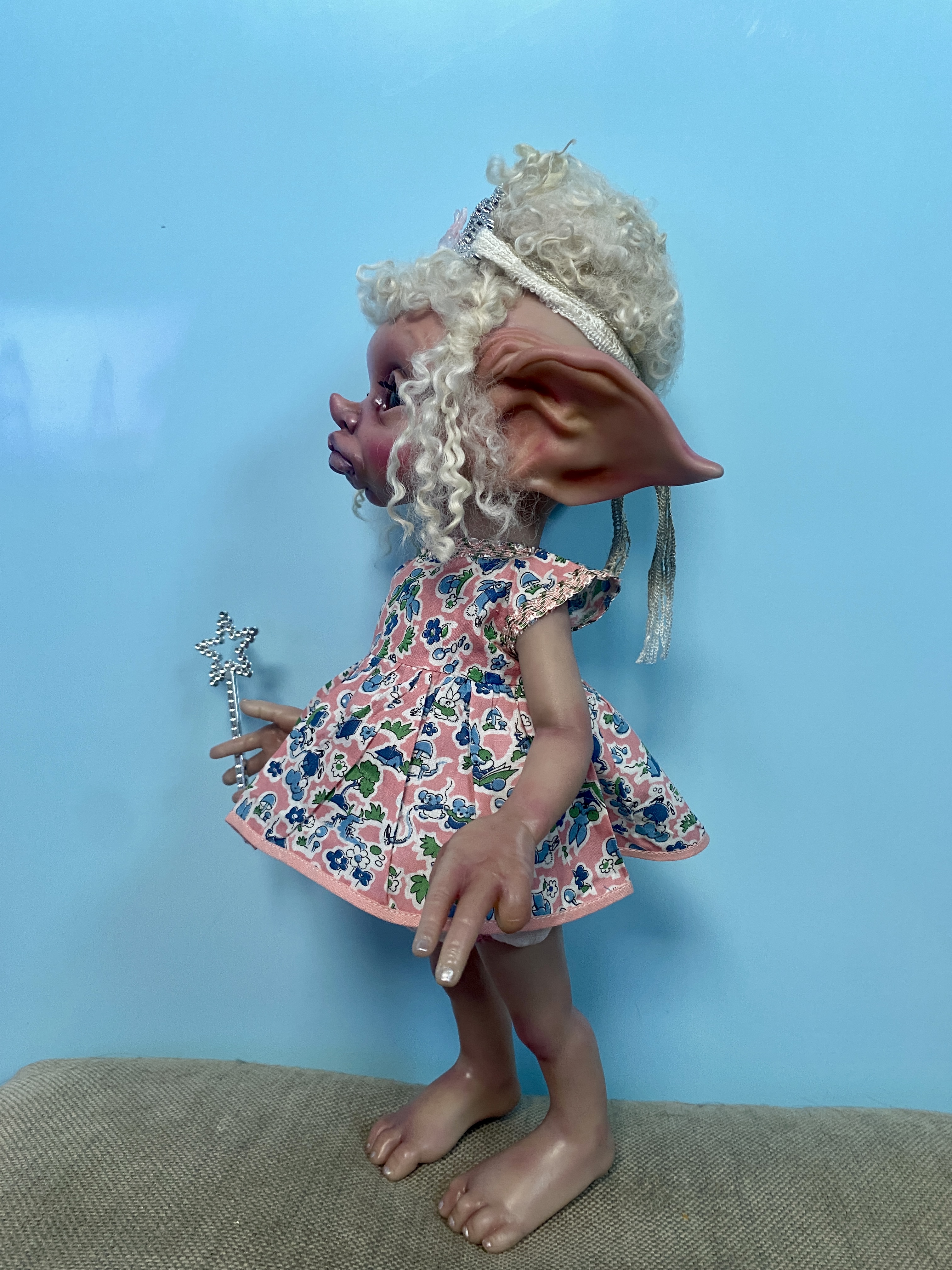 Nolly Dolly is my Ooak (one of a kind) Tinky Fairy Elf reborn doll hand customised by me “The Dolly Fairy”. 17 inches in height, she’s made from super quality weighty silicone vinyl with brown sleep eyes, adorable squishy pronounced features and those amazing big pointy ears!. Nolly Dolly is jointed at the head and limbs and can sit and stand nicely. I created this special little girl’s face up using professional quality products, all layers sealed with MSC. This delightful little Elfin girl comes just as her photos in vintage woodland dress, fairy wand, and tiara.
