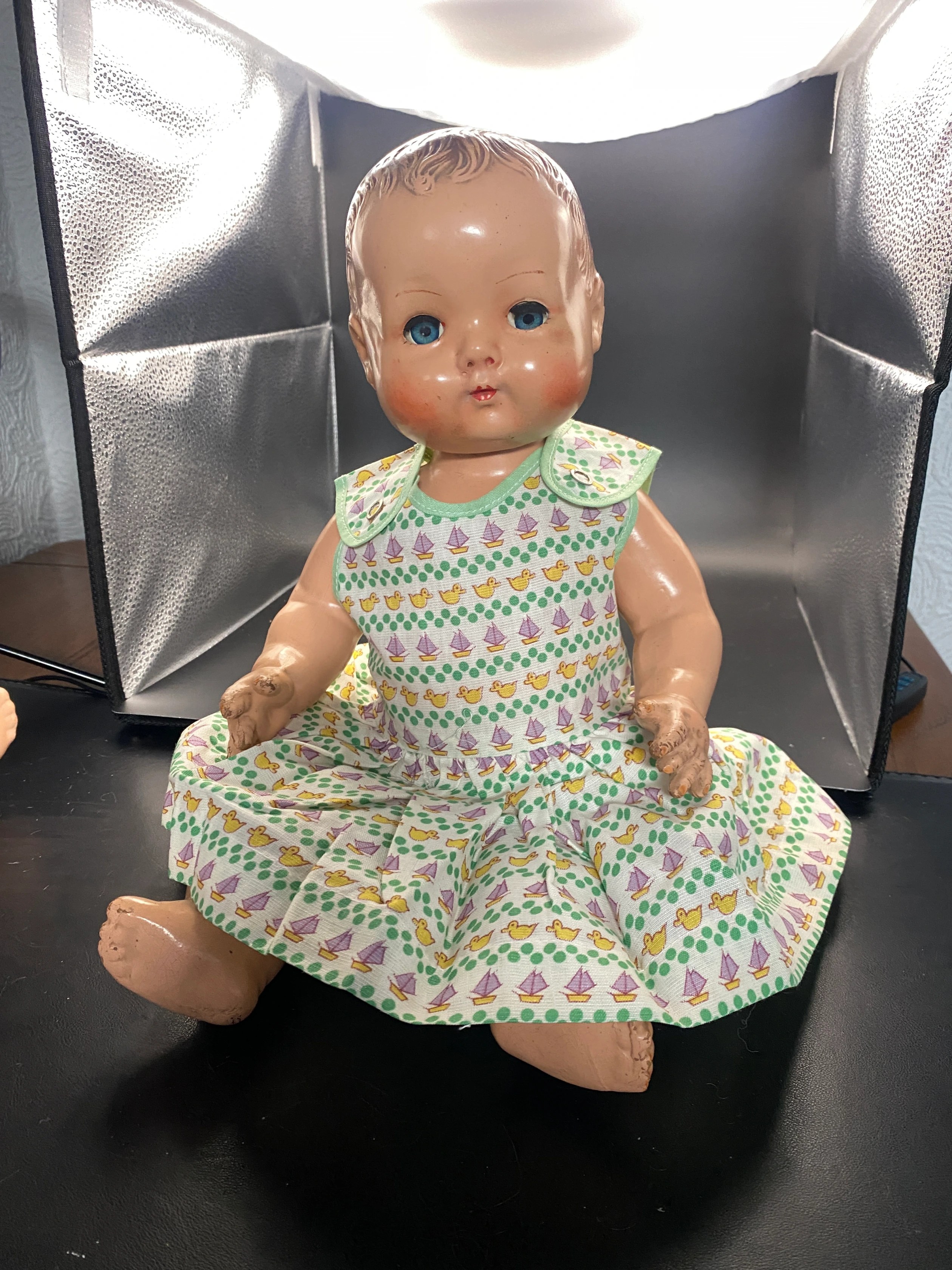 Genuine unused 1950’s stock from the Pedigree doll factory in original plain packet. This fabulous rare find original unlabelled Pedigree doll pinafore features cute pattern with ducks and fastens at the front with factory press studs – fits dolls up to 21 inches in height. Modeled here by a 18″ Roddy baby doll and 21 inch Pedigree walker doll just to give you an idea of size (dolls not included).