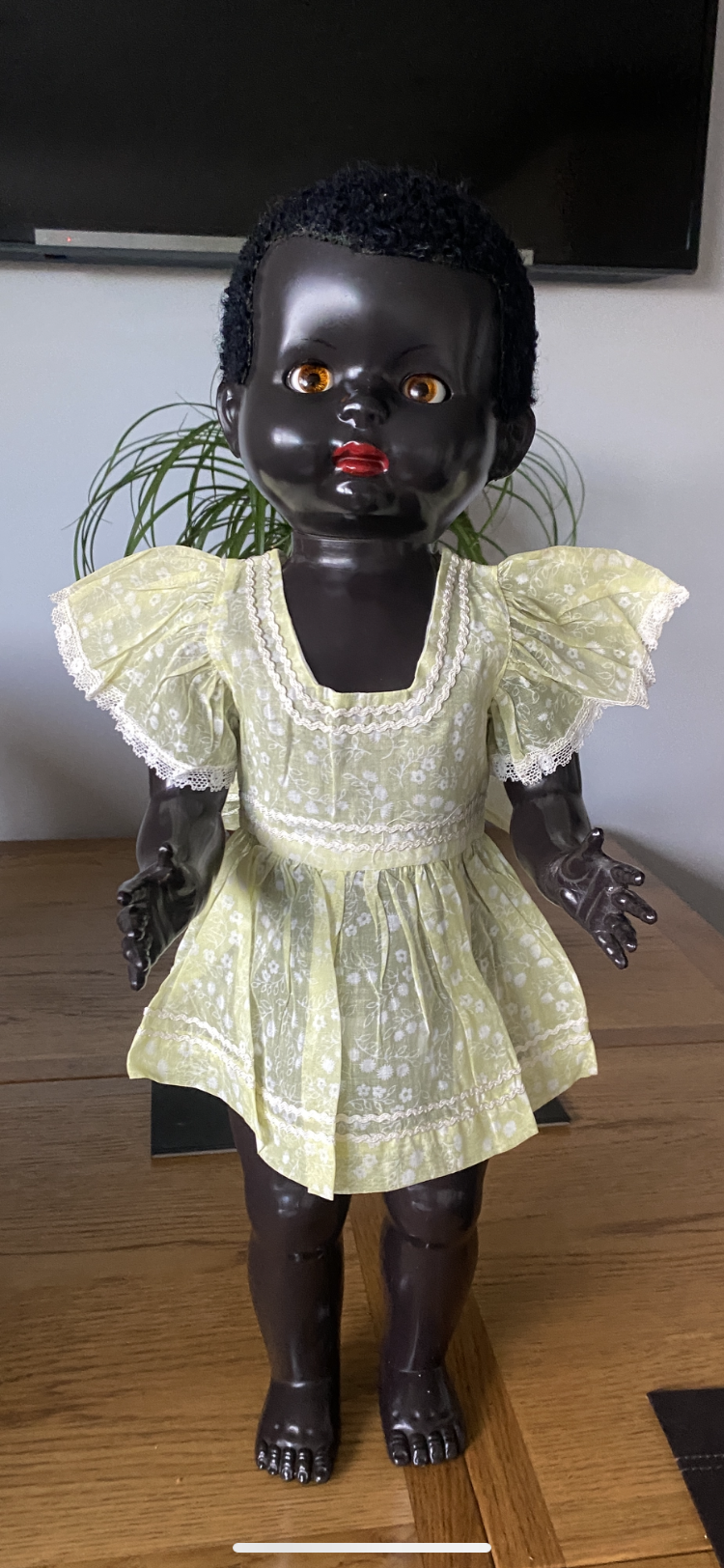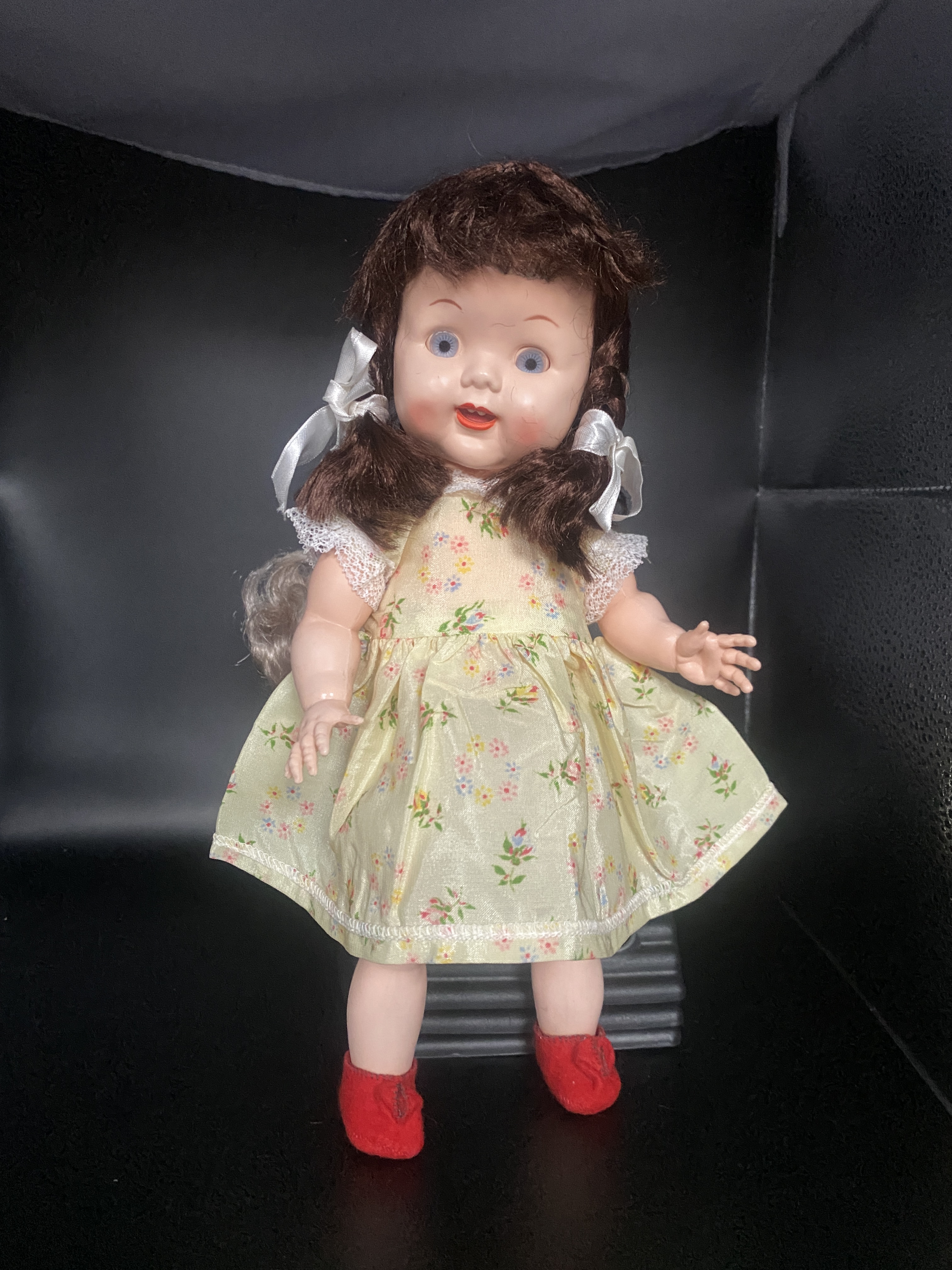 Genuine unused 1950’s stock from the Pedigree doll factory in original plain packet. This fabulous rare find original unlabelled Pedigree doll dress features dainty floral pattern, angel sleeves and fastens at the back with belt and factory press studs – fits dolls up to 21 inches in height. Modeled here by a 21″ Pedigree walker doll just to give you an idea of size (doll not included).
