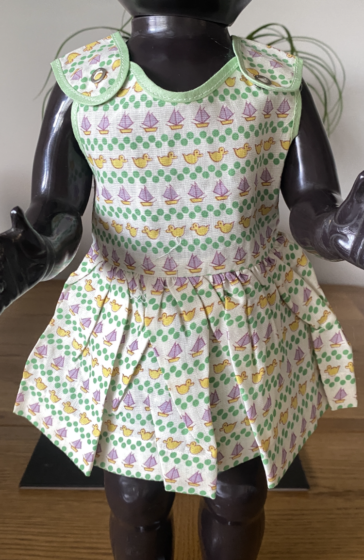 Green trim yellow ducks Pedigree Doll Pinafore 1950s Dress – up to 21 inches