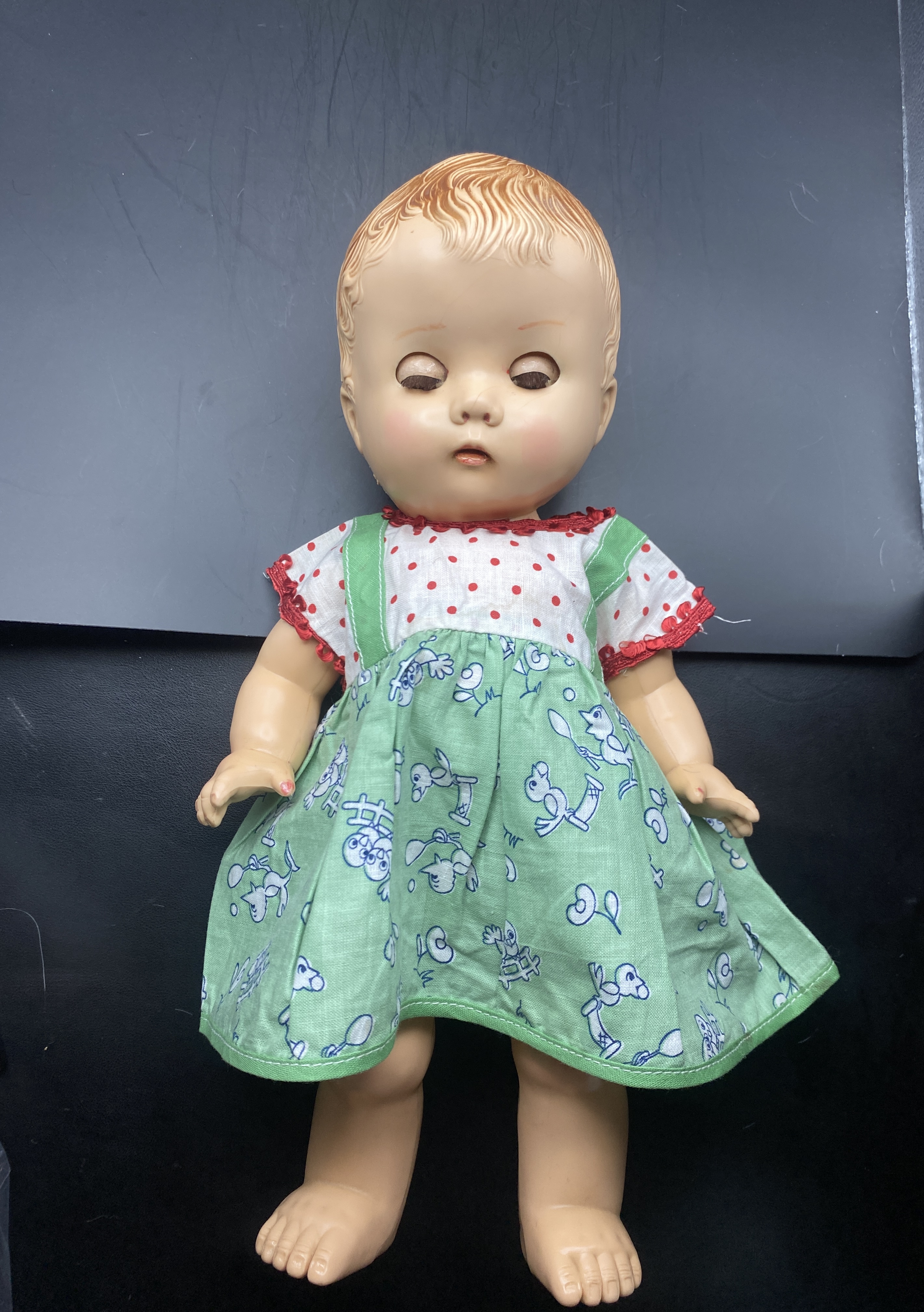 Genuine unused 1950’s stock from the Pedigree doll factory in original plain packet. This fabulous rare find original unlabelled Pedigree doll dress features pattern of super cute characters and fastens at the back with wide belt and factory press studs – fits dolls up to 16 inches in height. Modeled here by a 16″ Pedigree toddler doll just to give you an idea of size (doll not included).
