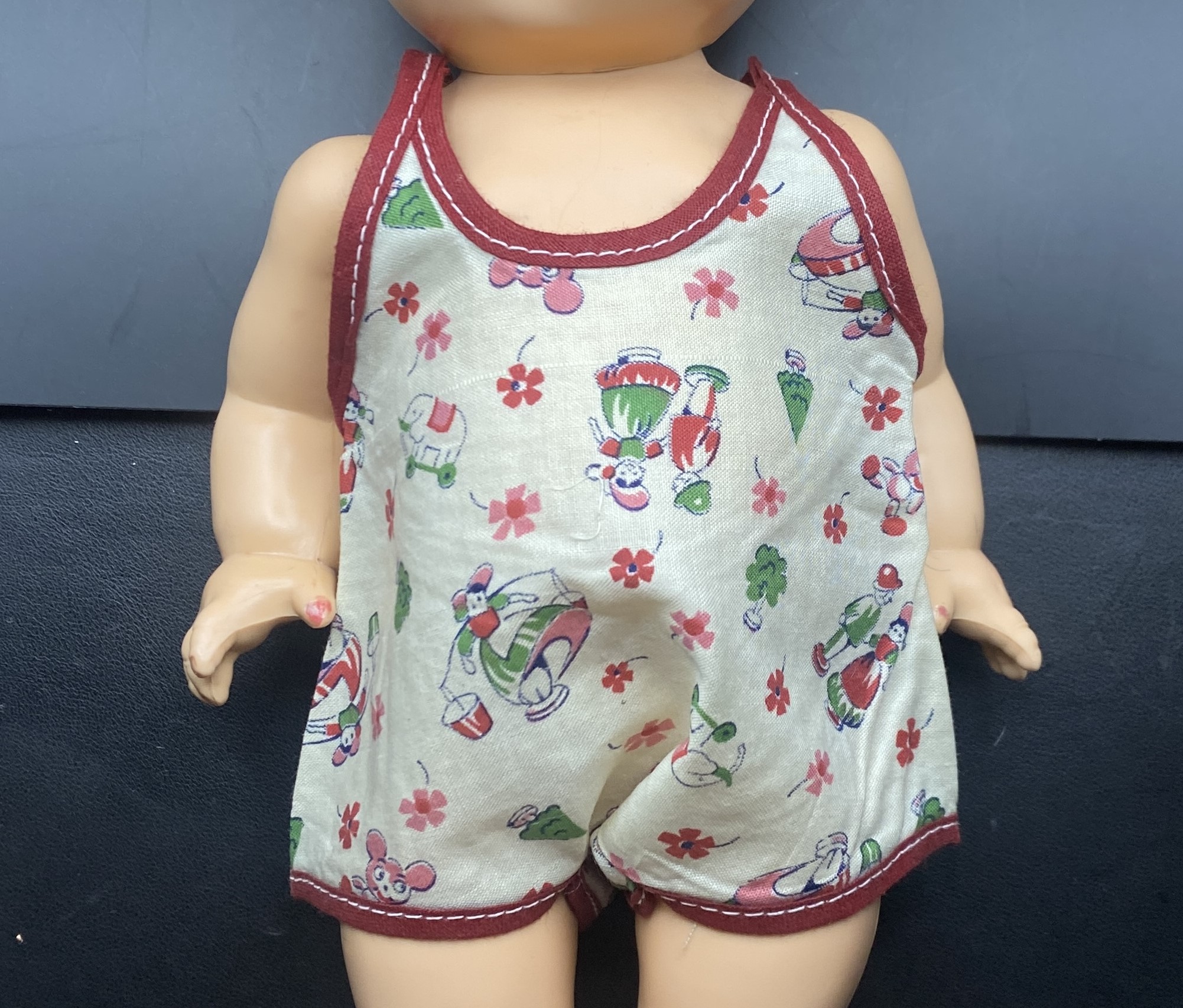 Genuine unused 1950’s stock from the Pedigree doll factory in original plain packet. This fabulous rare find original unlabelled Pedigree doll romper features mice/teddies print and fastens at the back with a tie loop – fits dolls up to 14 inches in height. Modeled here by a 12″ Rosebud baby doll just to give you an idea of size (doll not included).