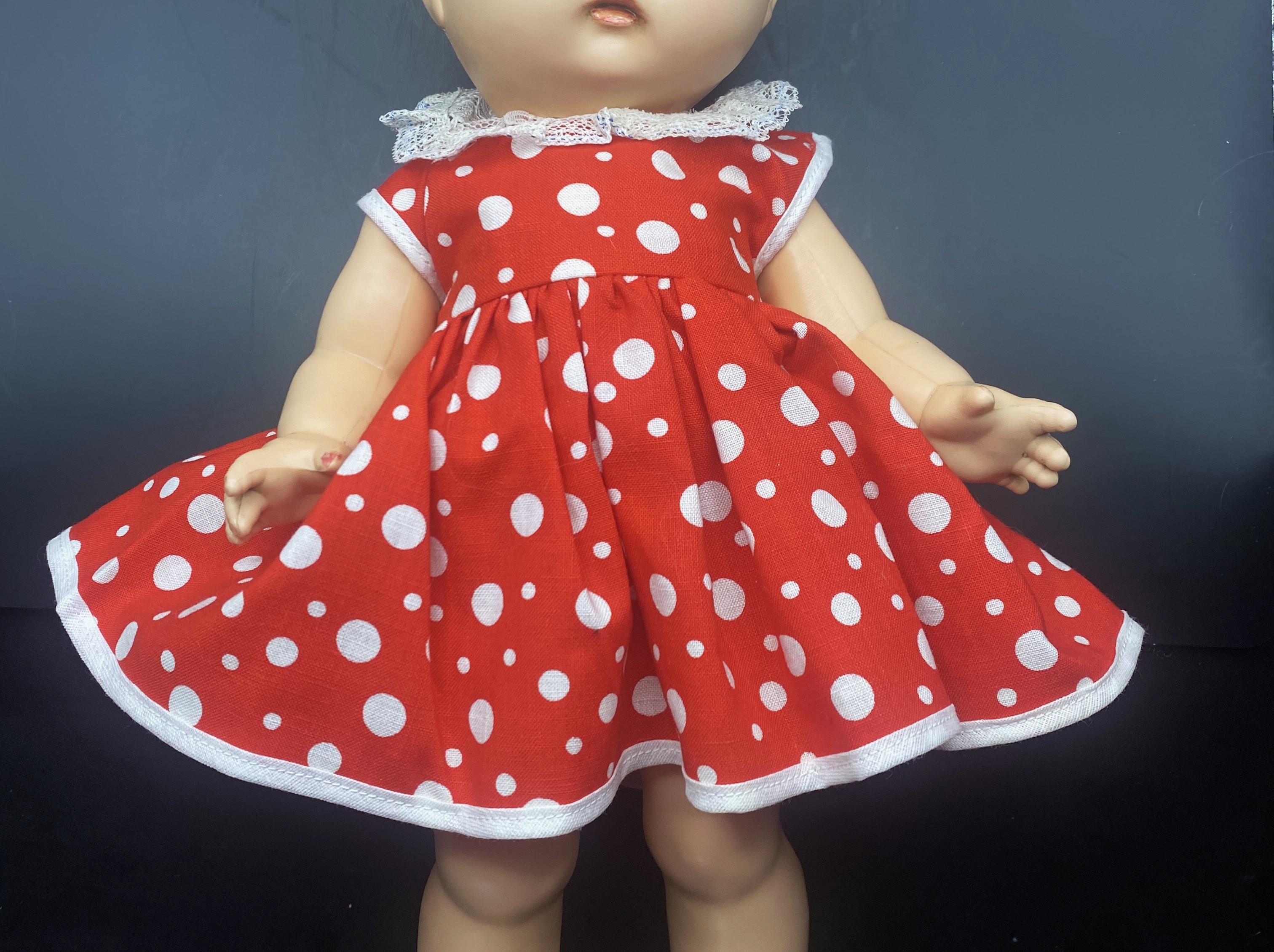Red/white polka dot 1950’s Pedigree Doll Dress – up to 14 inches