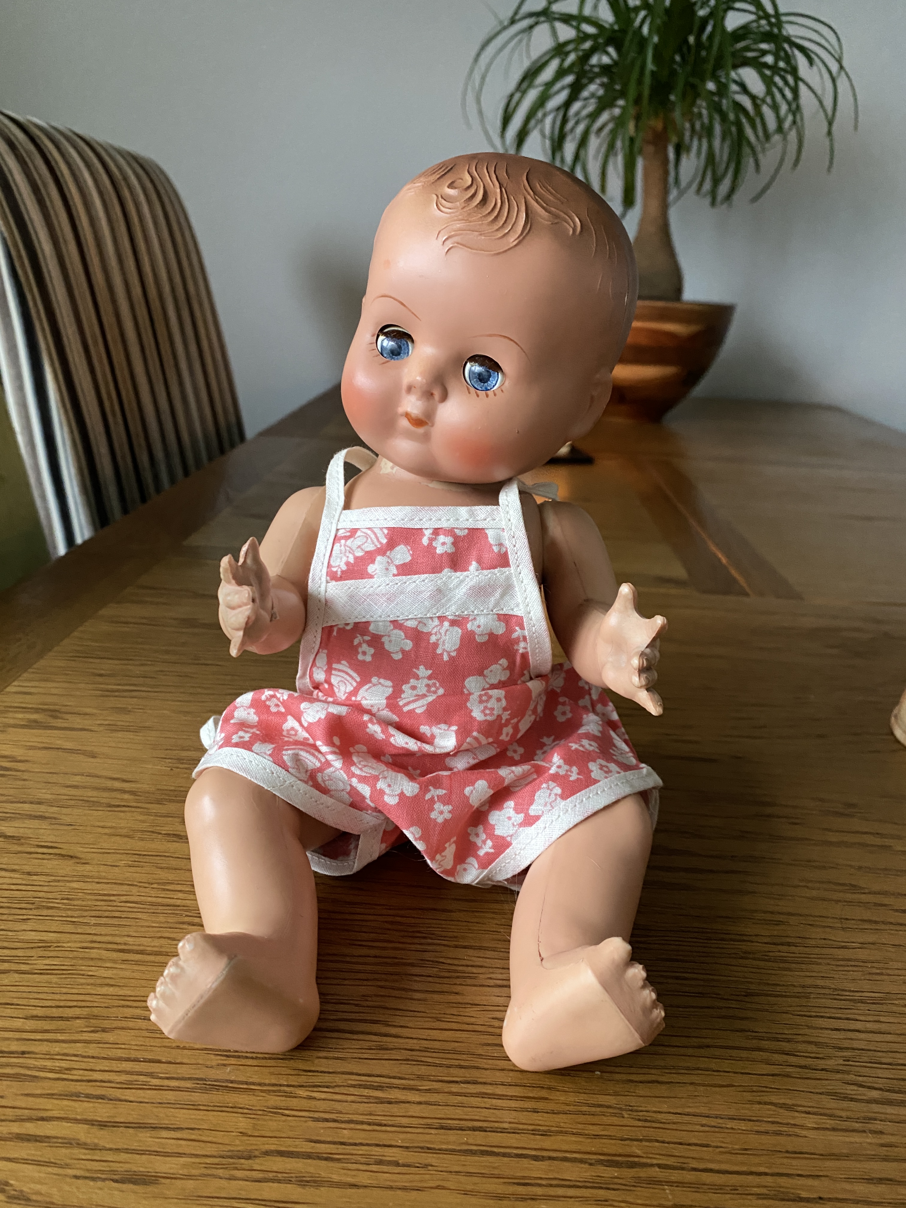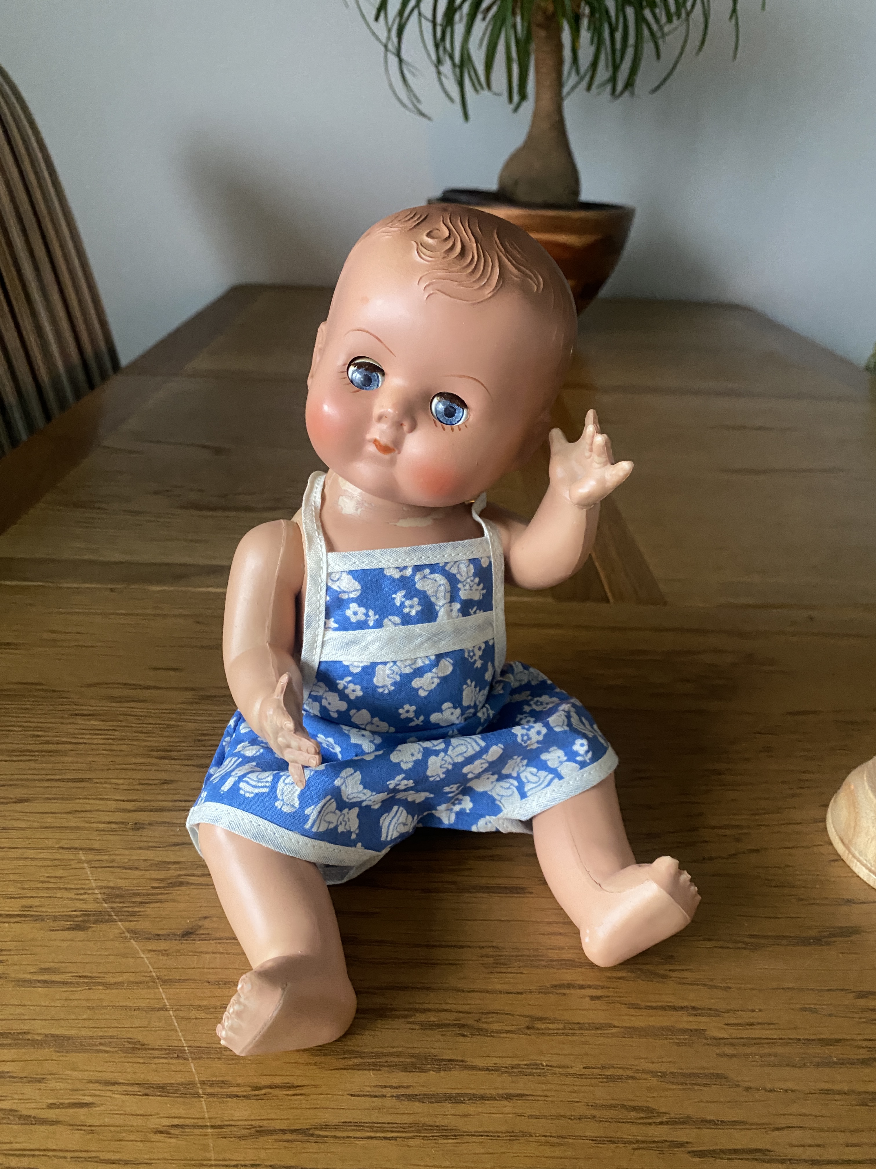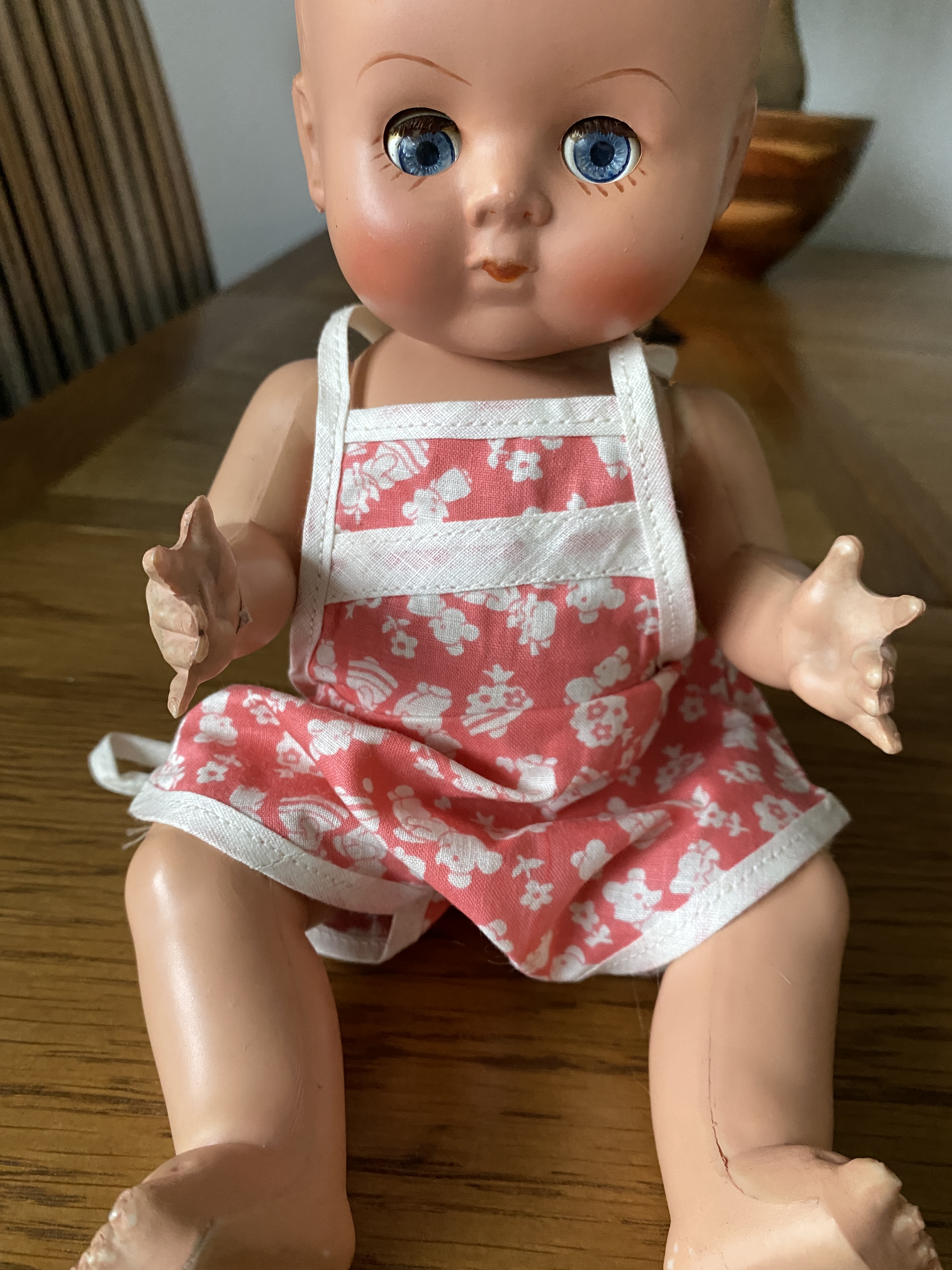 Genuine unused 1950’s stock from the Pedigree doll factory in original plain packet. This fabulous rare find original unlabelled Pedigree doll romper features cherub character pattern, large white collar and fastens at the back with factory press studs – fits dolls up to 15 inches in height. Modeled here by a 13″ BND toddler doll just to give you an idea of size (doll not included).