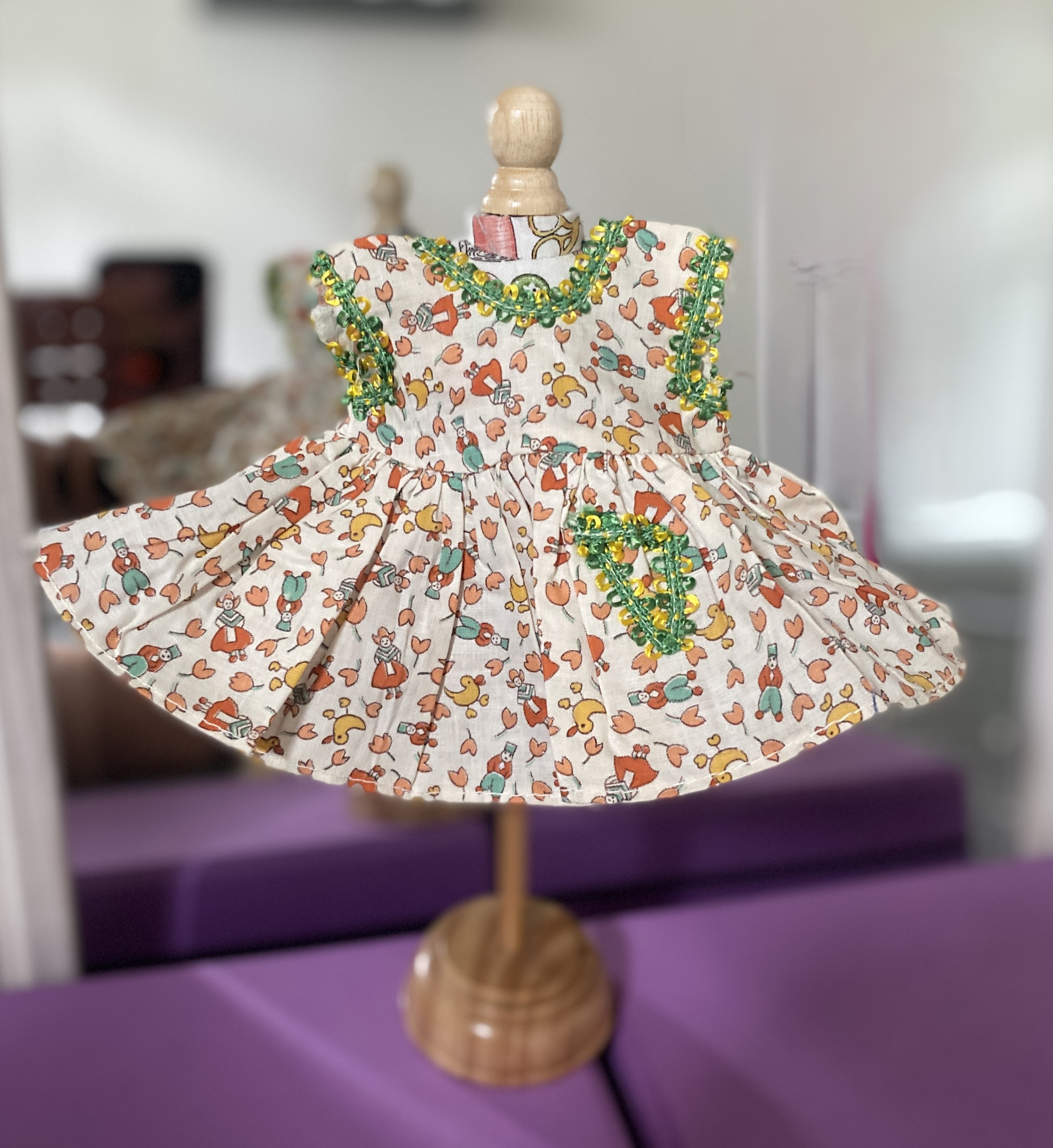 Genuine unused 1950’s stock from the Pedigree doll factory in original plain packet. This fabulous rare find original unlabelled Pedigree doll dress features pattern of super cute characters and fastens at the back with wide belt and factory press studs – fits dolls up to 16 inches in height. Modeled here by a 13″ BND toddler doll just to give you an idea of size (doll not included).