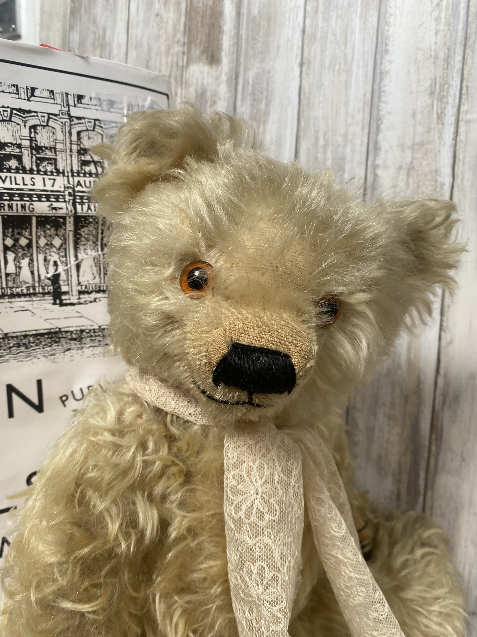 Charles is a very handsome antique British Chiltern teddy bear dating to the 1930’s. 19 inches in height, he’s fully jointed with clear glass eyes and all original nose, mouth, paw stitching and pads retained. Expected wear and thinning to his mohair but nothing major. Charles wears an old jangley bell around his neck along with vintage children characters hanky as a neckerchief… FREE UK SHIPPING.