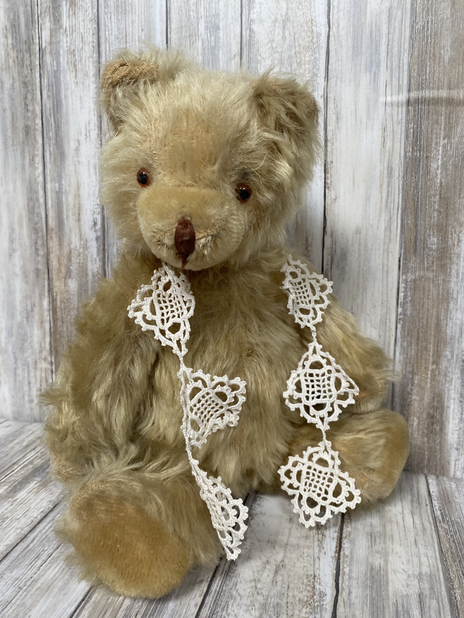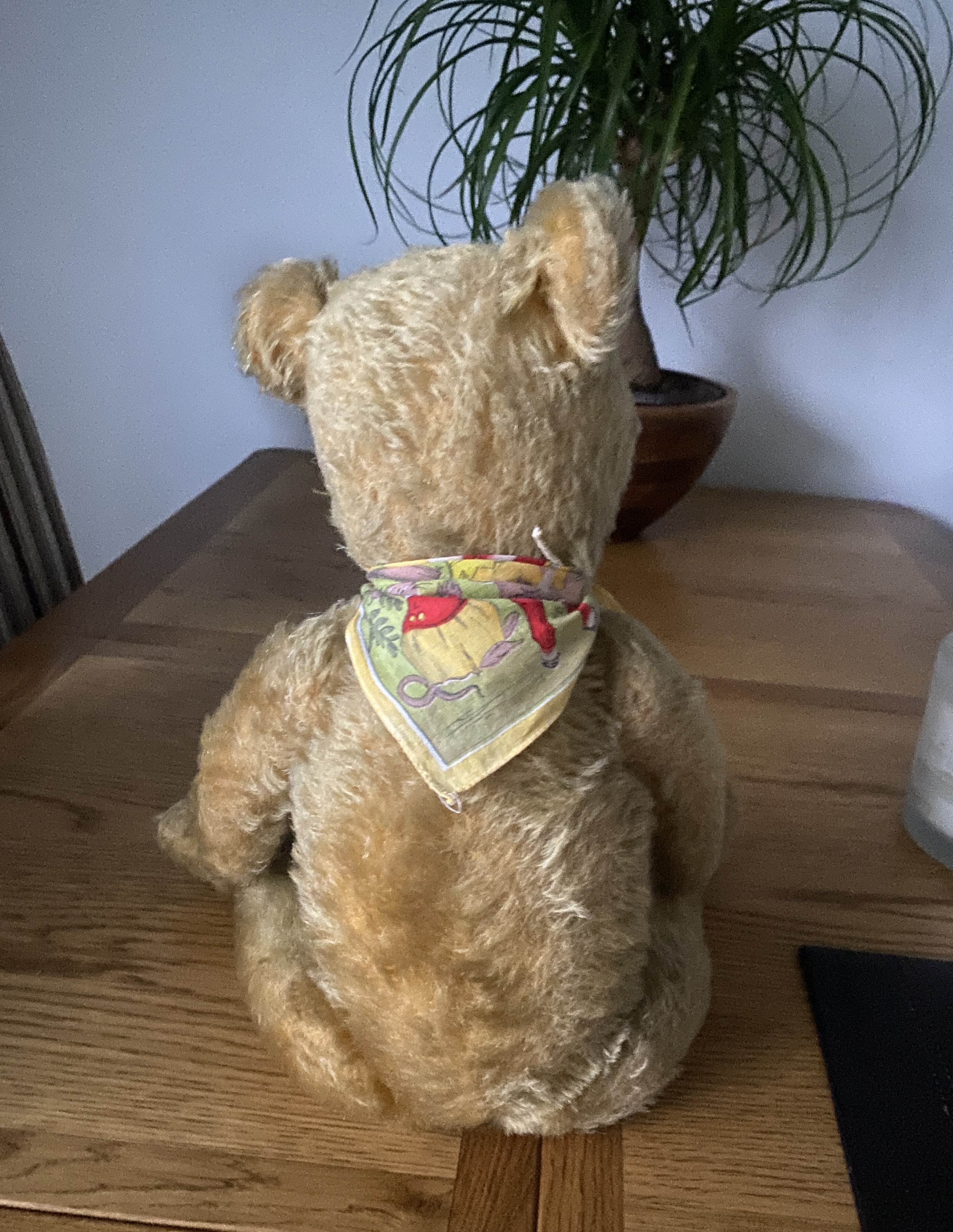 Elliot is a 1950’s antique german Schuco teddy bear with tiny glass eyes and plush pads. He’s a stocky hard stuffed bear with lovely long thick fur, a couple of little marks, dusty areas and holes but nothing too bad. Elliot’s back seam stitching has probably been over-stitched. 14 inches in height. No label. .FREE UK SHIPPING.,