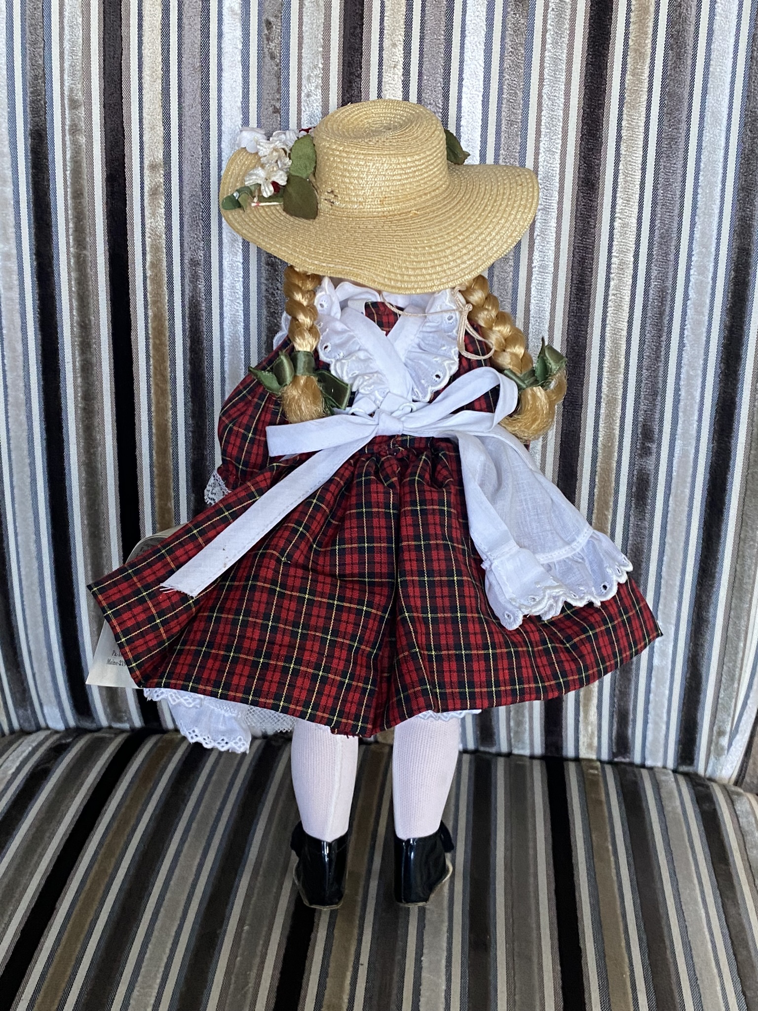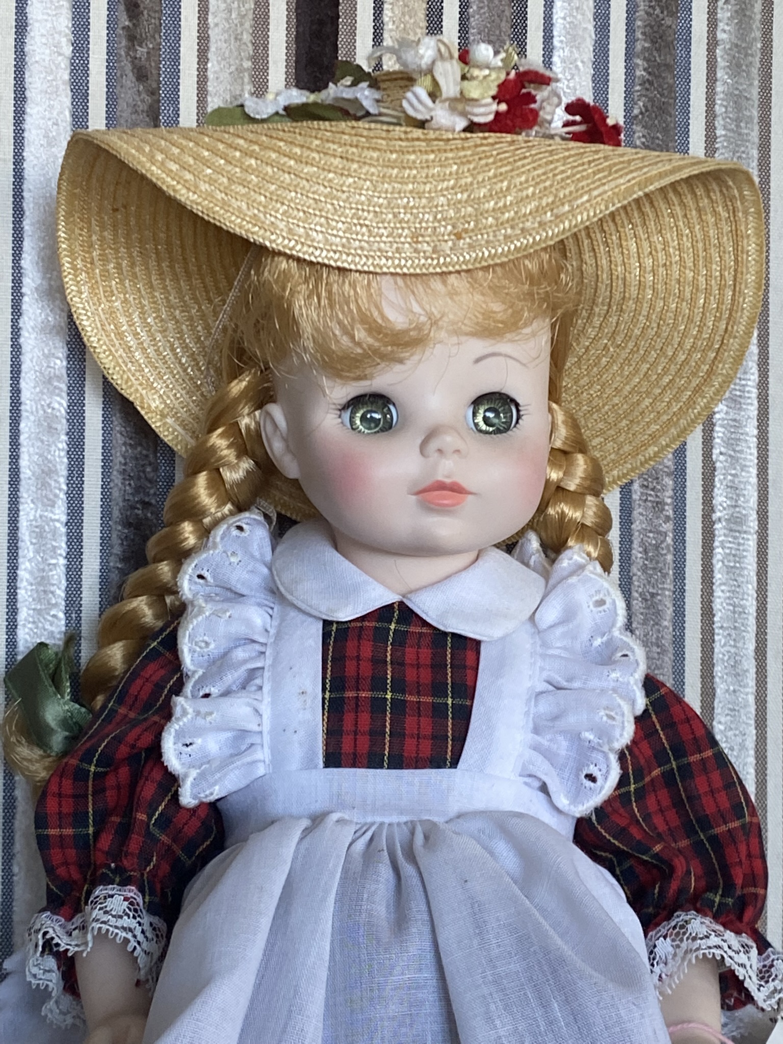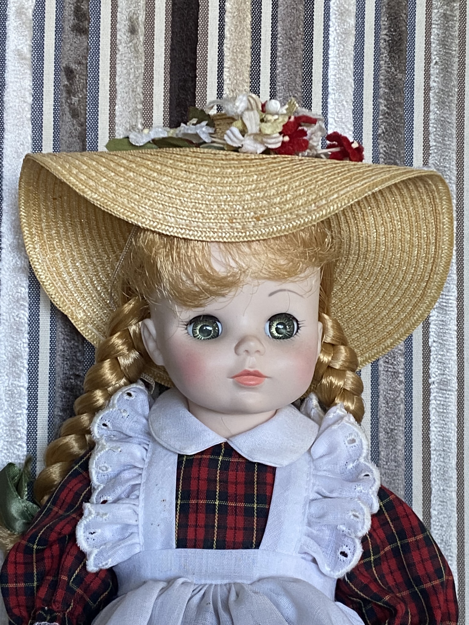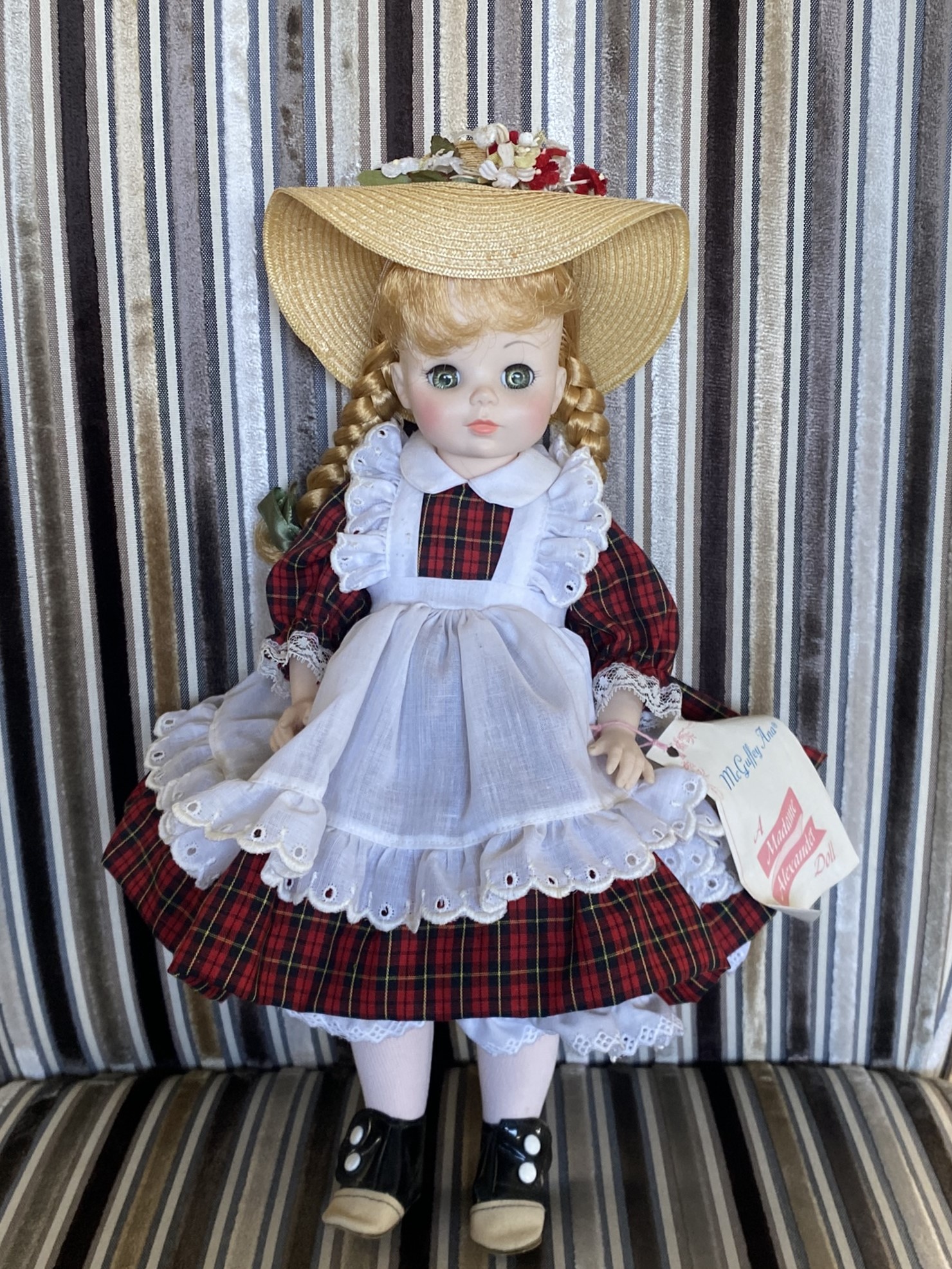 Madame Alexander McGuffy Ana Mary-Ann face Classic Series, 1525 produced (1977-86). Complete with her wrist tag and original tagged outfit of tartan dress, white frilly apron, tulle underskirt, lace trimmed cotton bloomers, stockings, black shiny boots and flower adorned straw hat. Lovely clean condition for her years. 14 inches in height. FREE SHIPPING (WITHIN THE UK ONLY)
