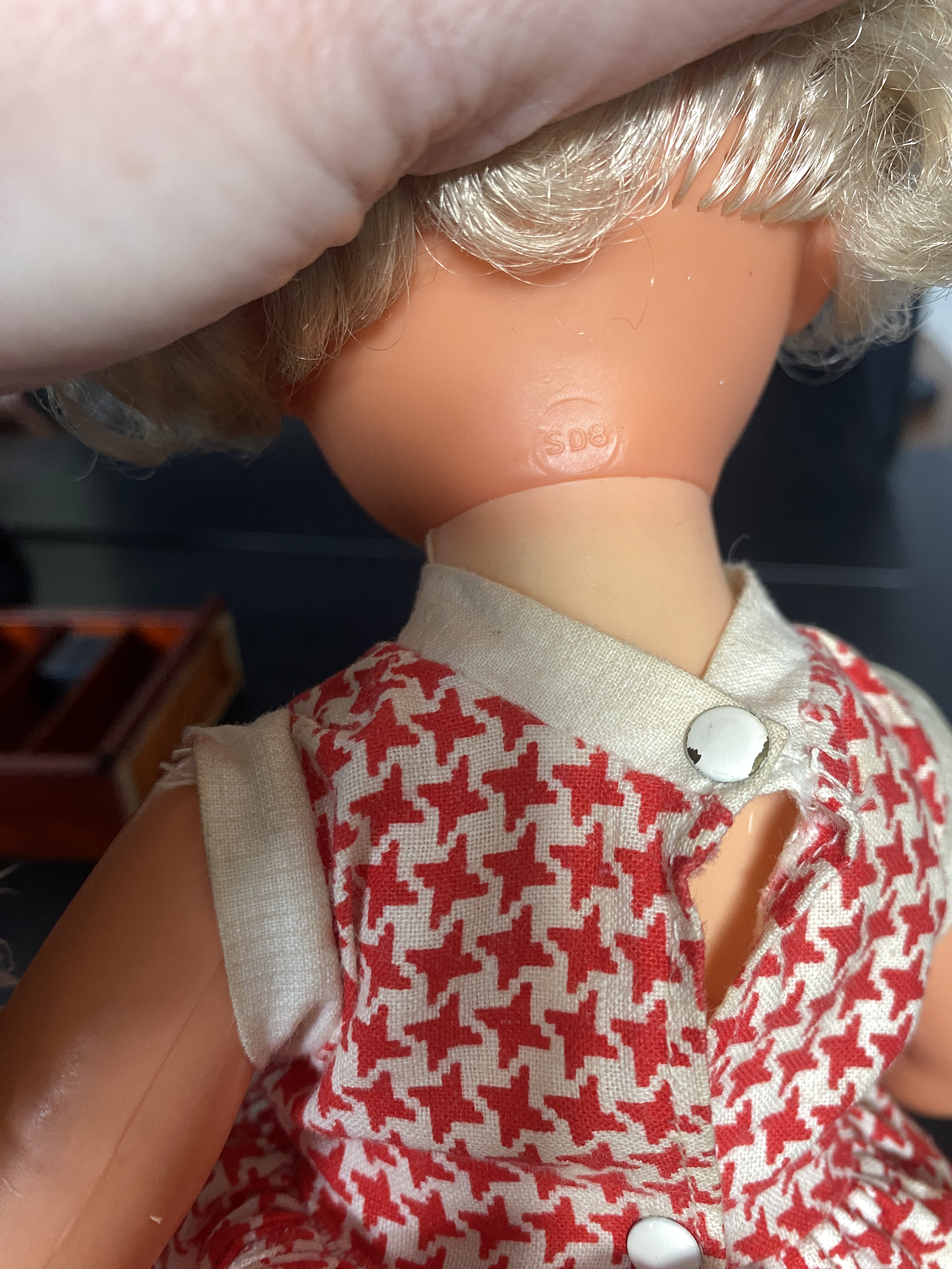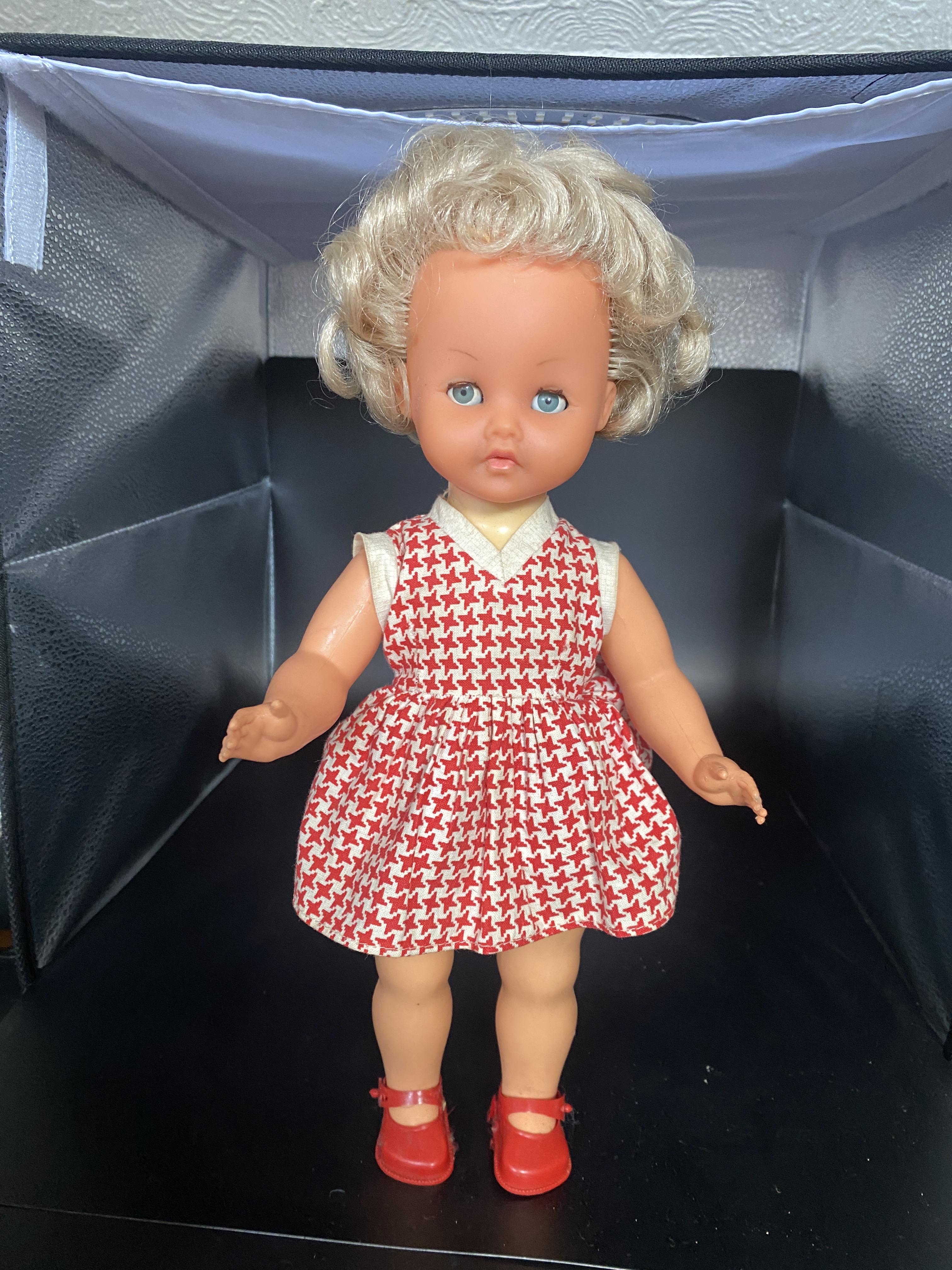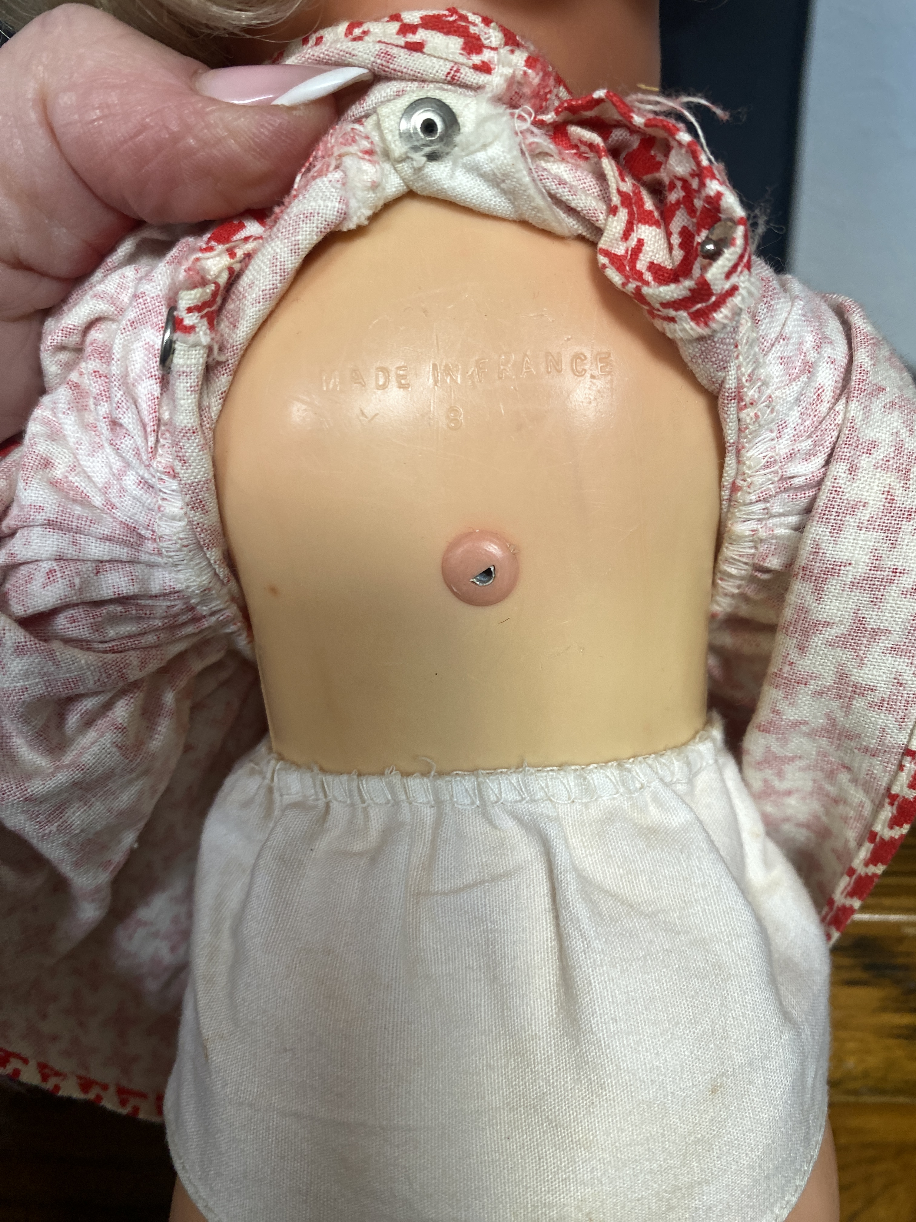 Oohh la la this circa 1960’s/70’s French vinyl and light plastic girl is the first I’ve seen!. 12 inches in height, she has manual open/close eyes, good colour and original outfit. Slighty grubby with age and storage but overall lovely for her years. Not sure what the function on her back was?. FREE SHIPPING (WITHIN THE UK ONLY)