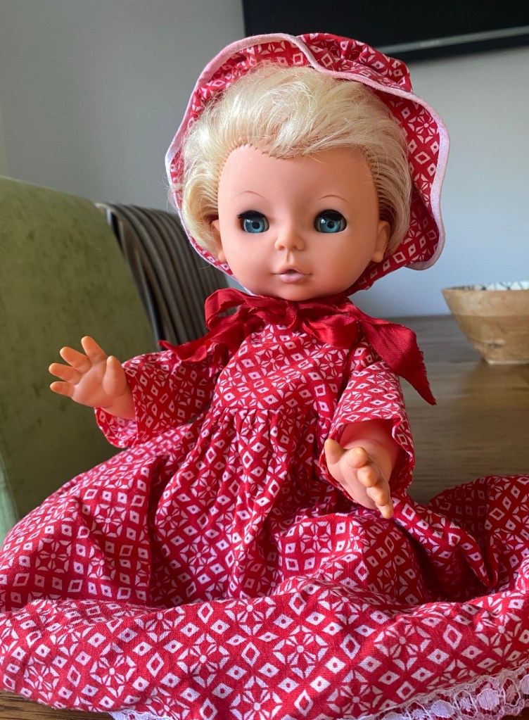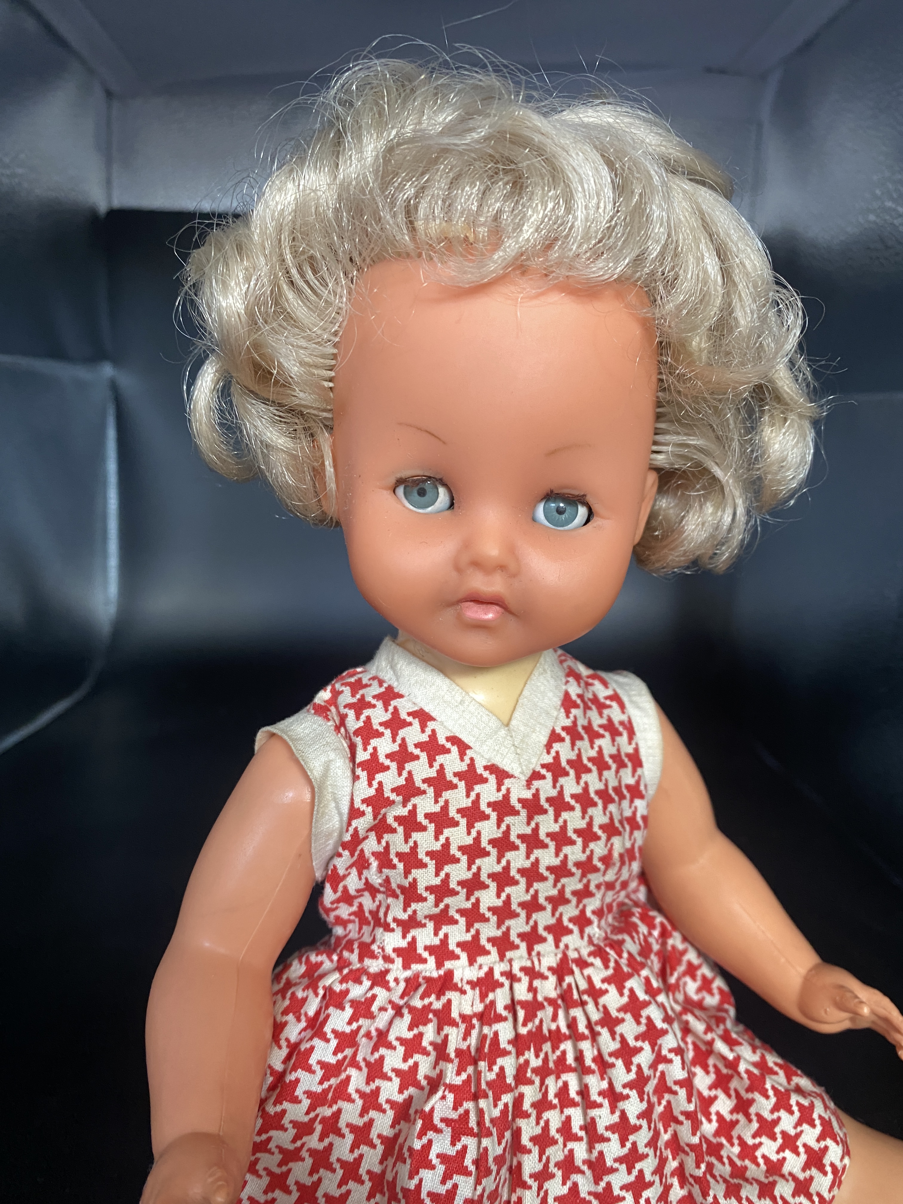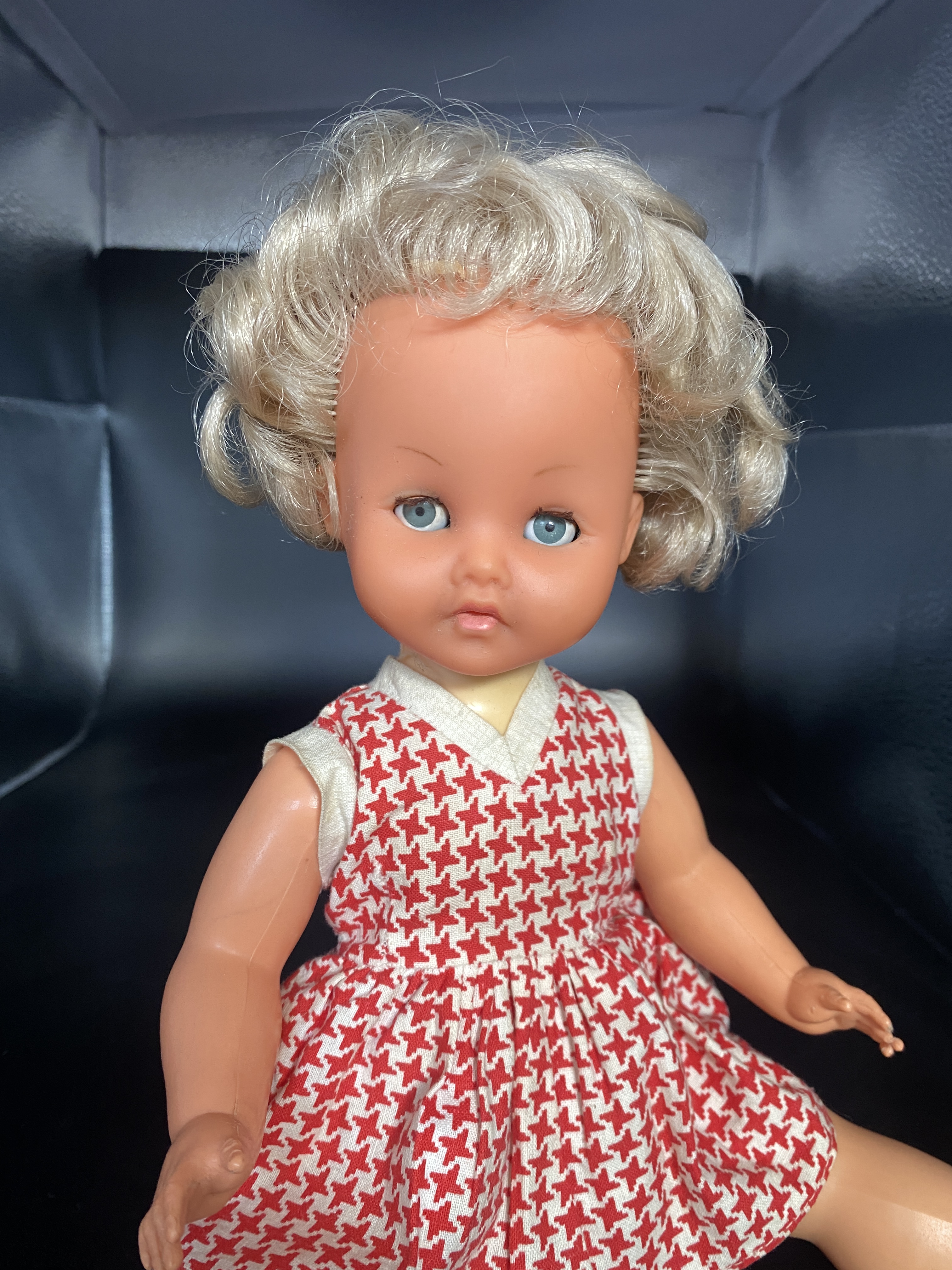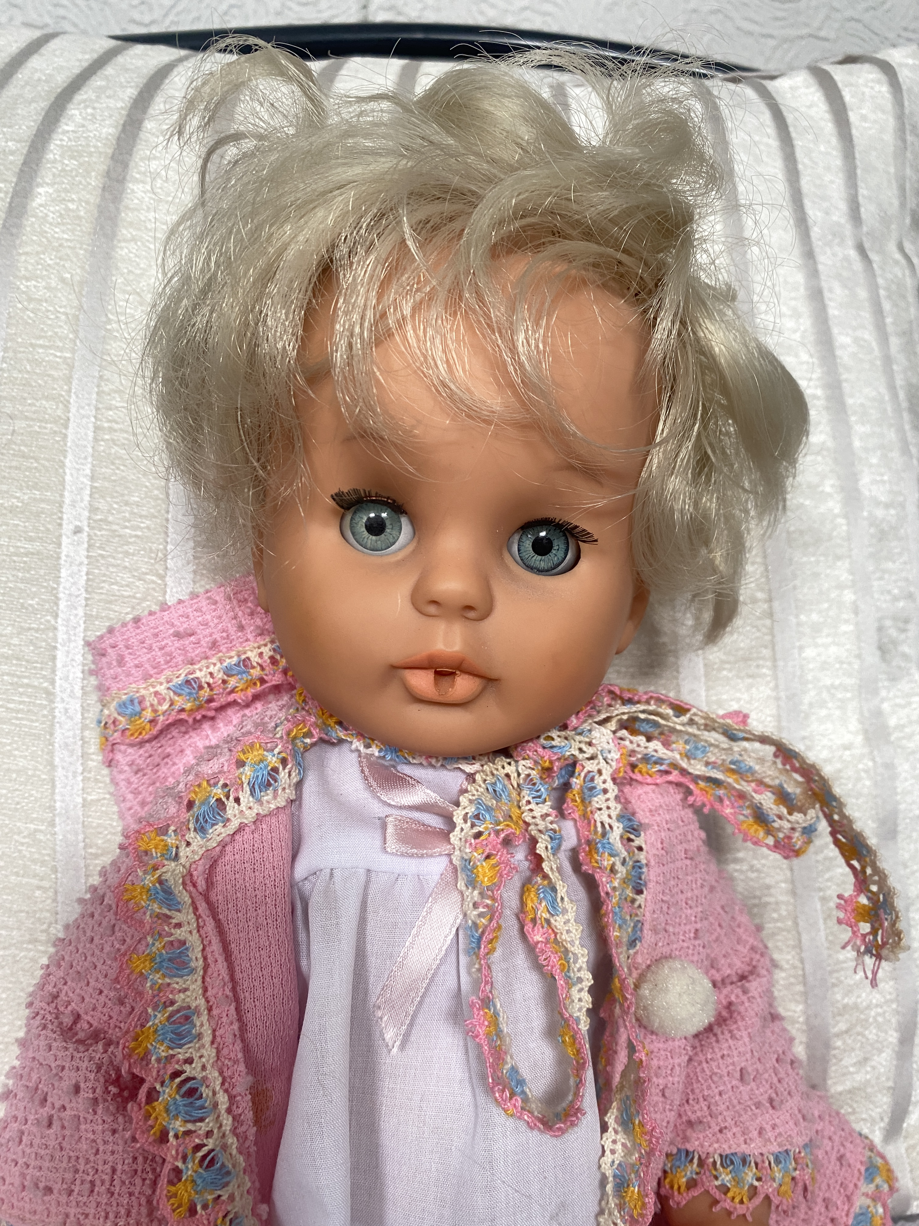 Alice is a circa 1970’s vintage British hand assisted walking doll who comes nicely dressed in her cosy knitted outfit. Approx 21 inches in height, she’s made from vinyl and plastic with blue sleep eyes, lashes and thick rooted hair. Good played with condition for her years. FREE SHIPPING (WITHIN THE UK ONLY)