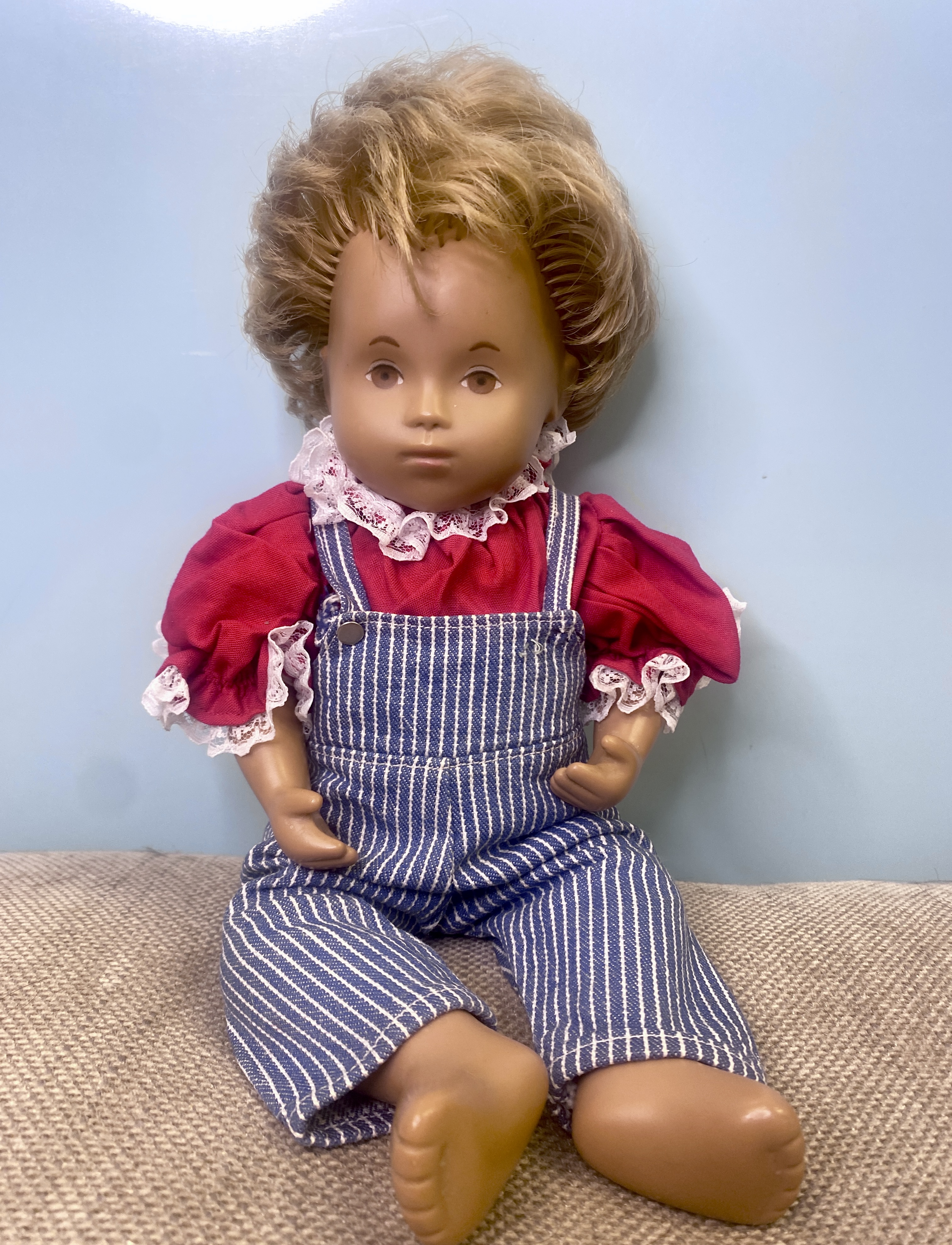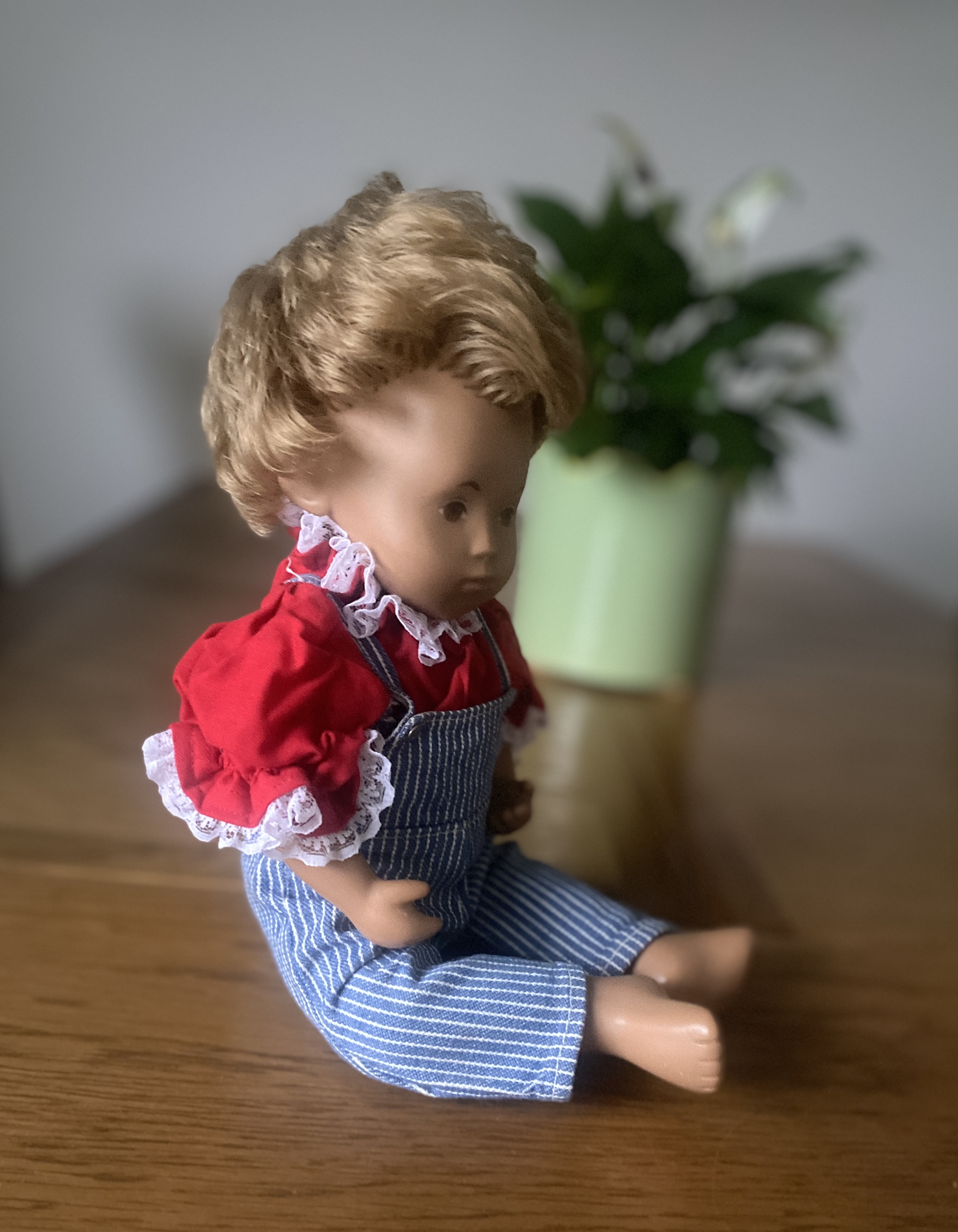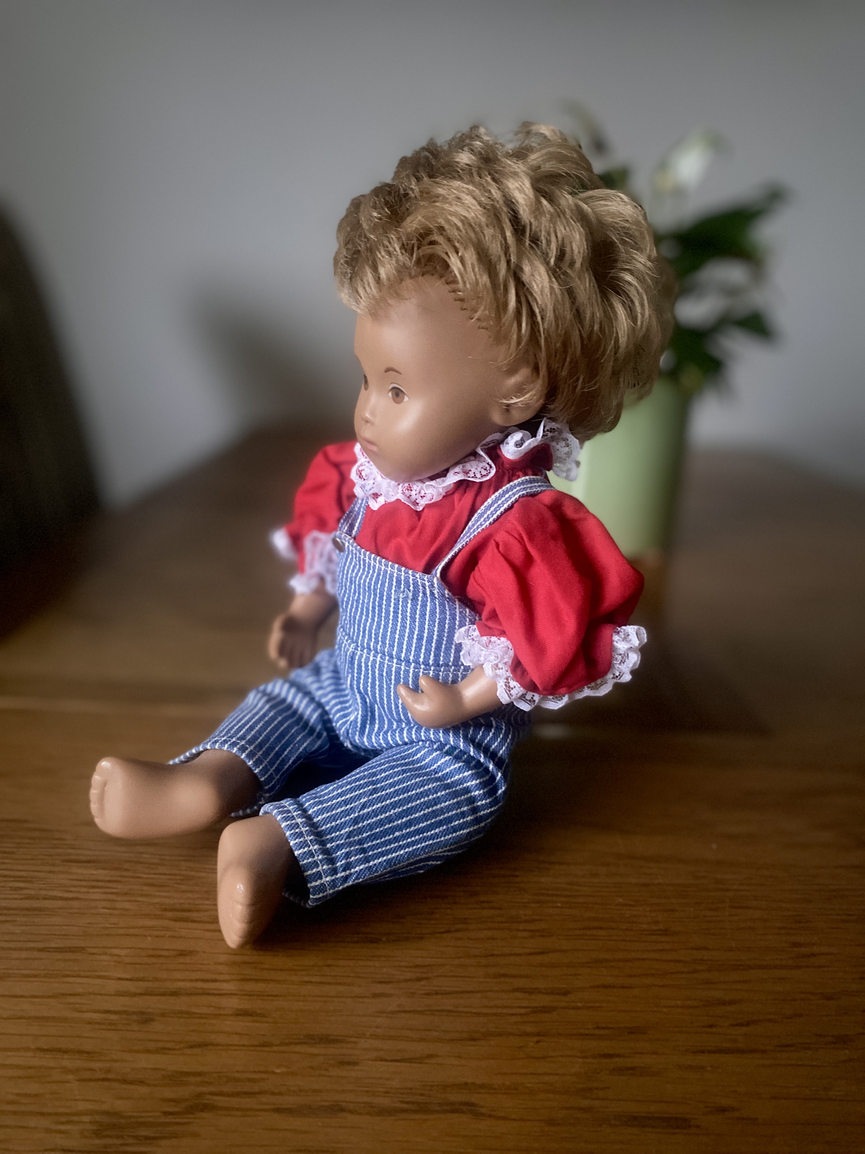 Super condition for her years, this gorgeous 1970’s baby Sasha has the rarer coffee hair and wears her original dungarees along with modern frilly blouse. 12 inches in height, I’ve given baby Sasha my bespoke dolly fairy dolly spa so she’s clean and fresh and I re-strung her arms as they were a bit slack with age. The original body cord remains good and strong. Her vinyl is excellent, no damage or marks. Dungarees had a press stud replaced at some point. FREE SHIPPING (WITHIN THE UK ONLY)