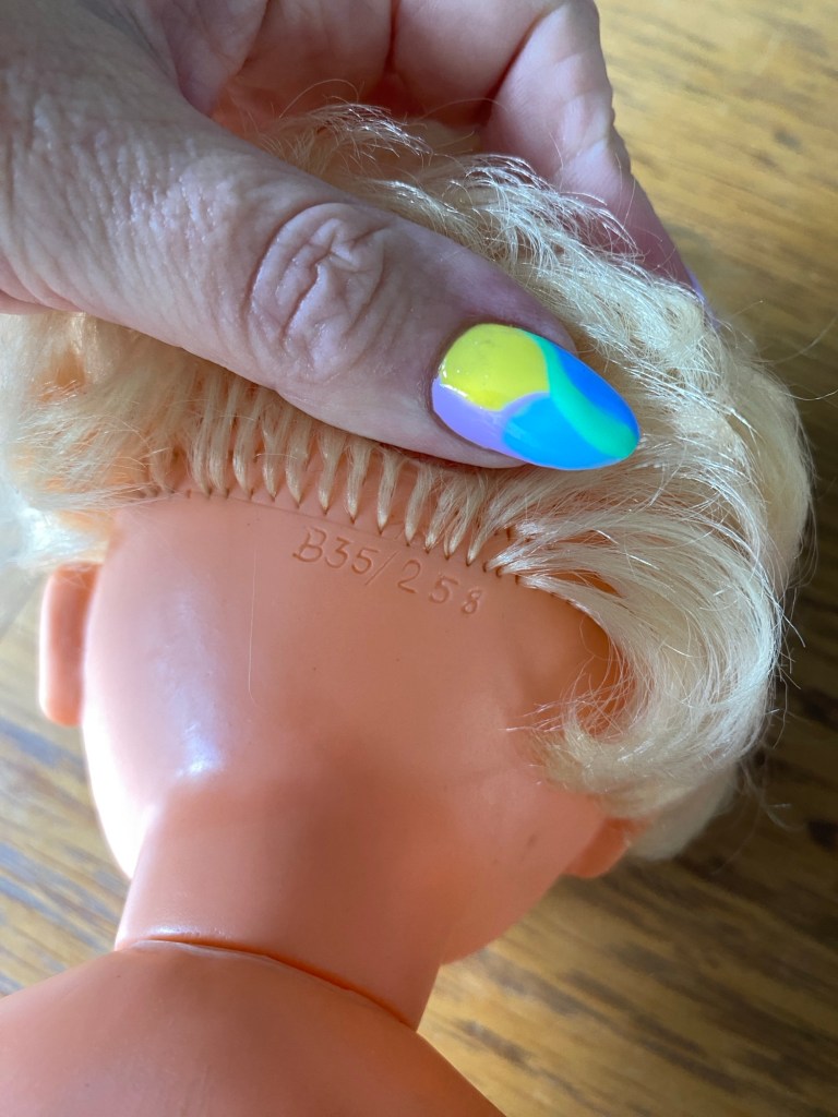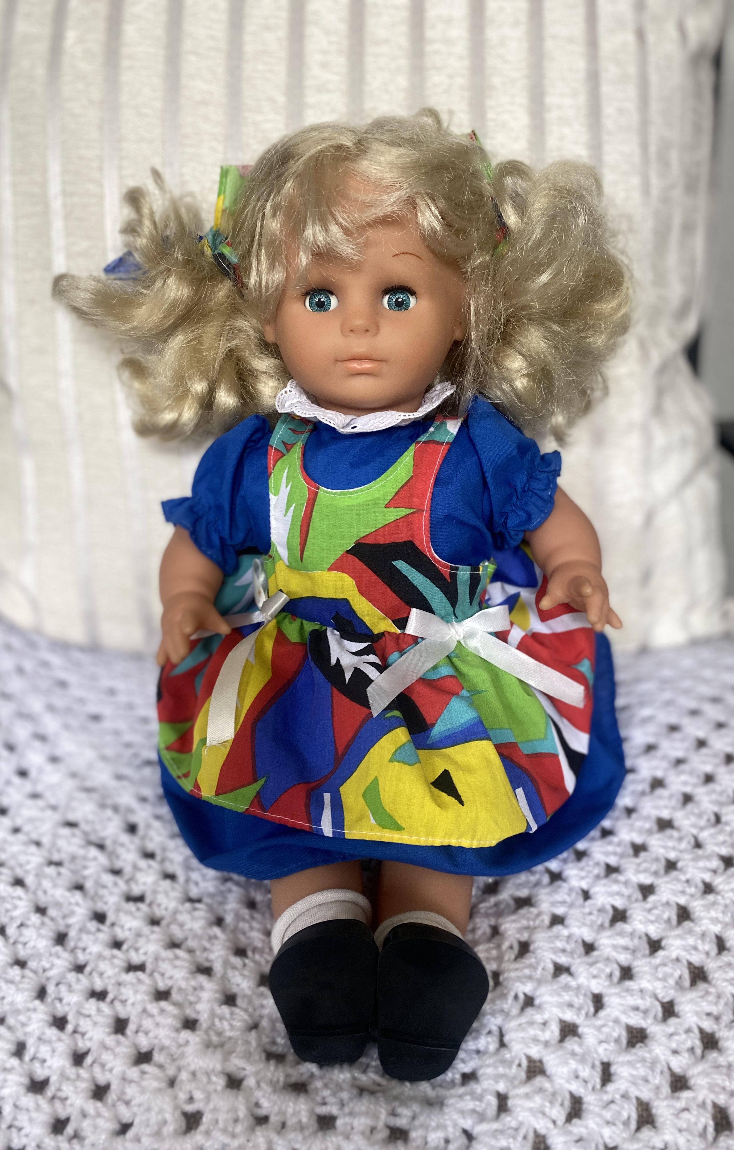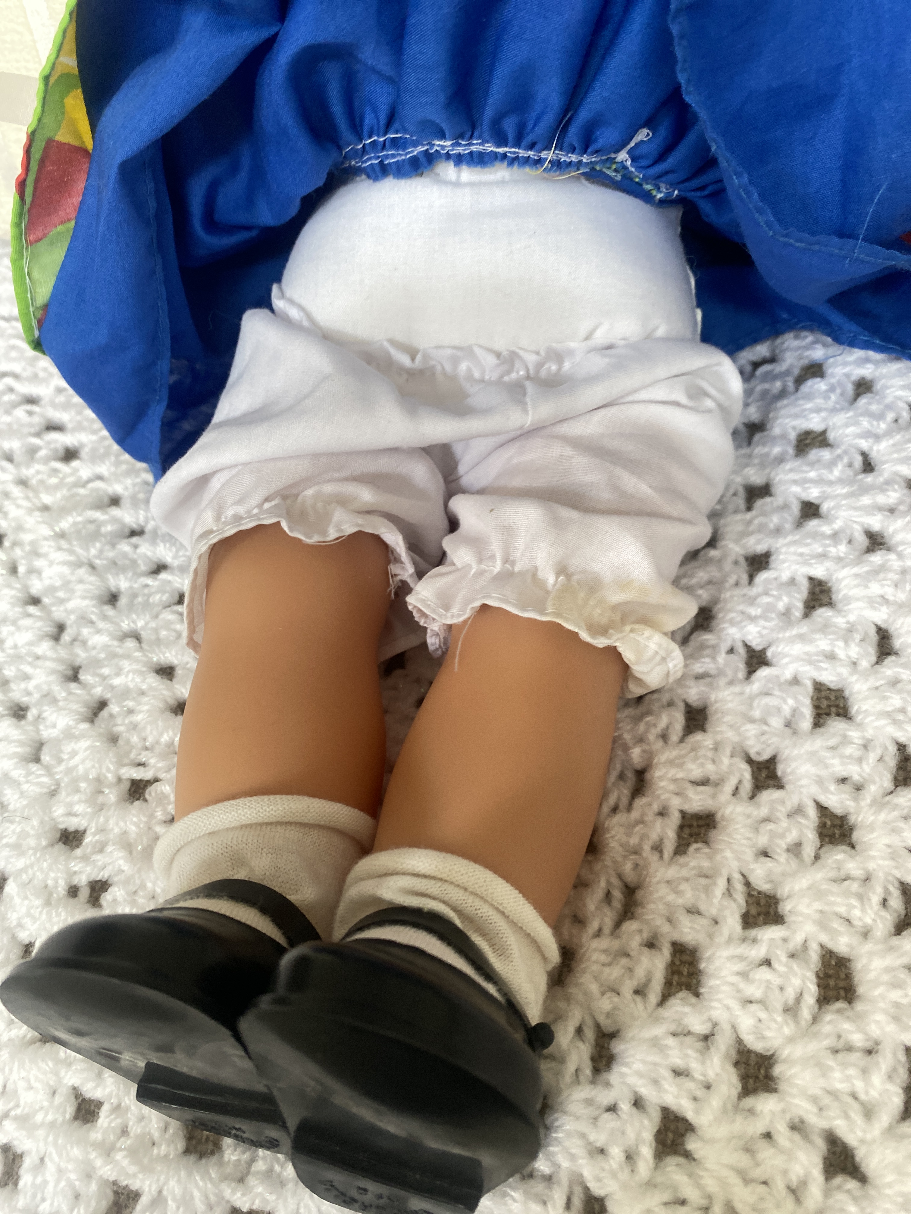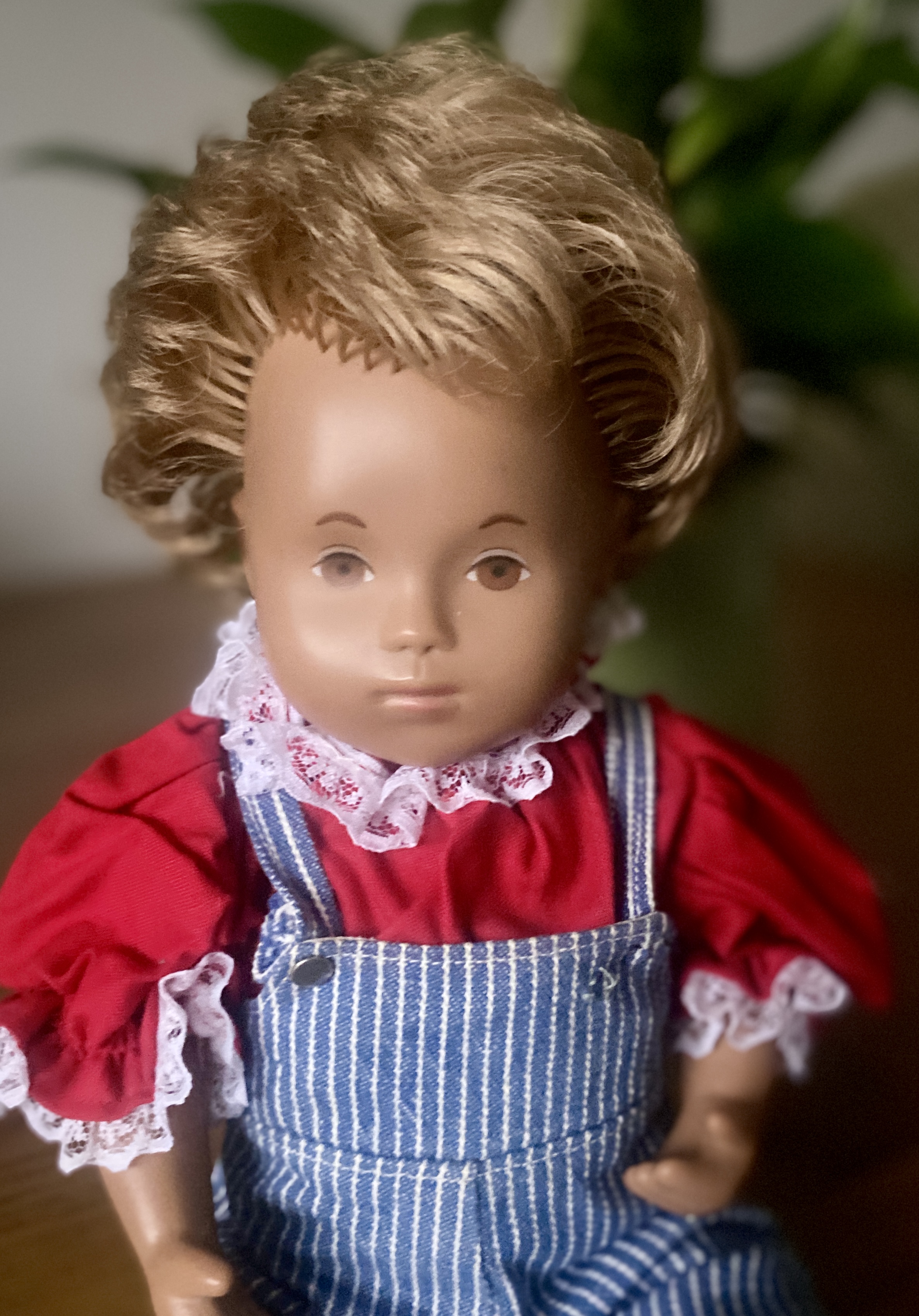 Super condition for her years, this gorgeous 1970’s baby Sasha has the rarer coffee hair and wears her original dungarees along with modern frilly blouse. 12 inches in height, I’ve given baby Sasha my bespoke dolly fairy dolly spa so she’s clean and fresh and I re-strung her arms as they were a bit slack with age. The original body cord remains good and strong. Her vinyl is excellent, no damage or marks. Dungarees had a press stud replaced at some point. FREE SHIPPING (WITHIN THE UK ONLY)