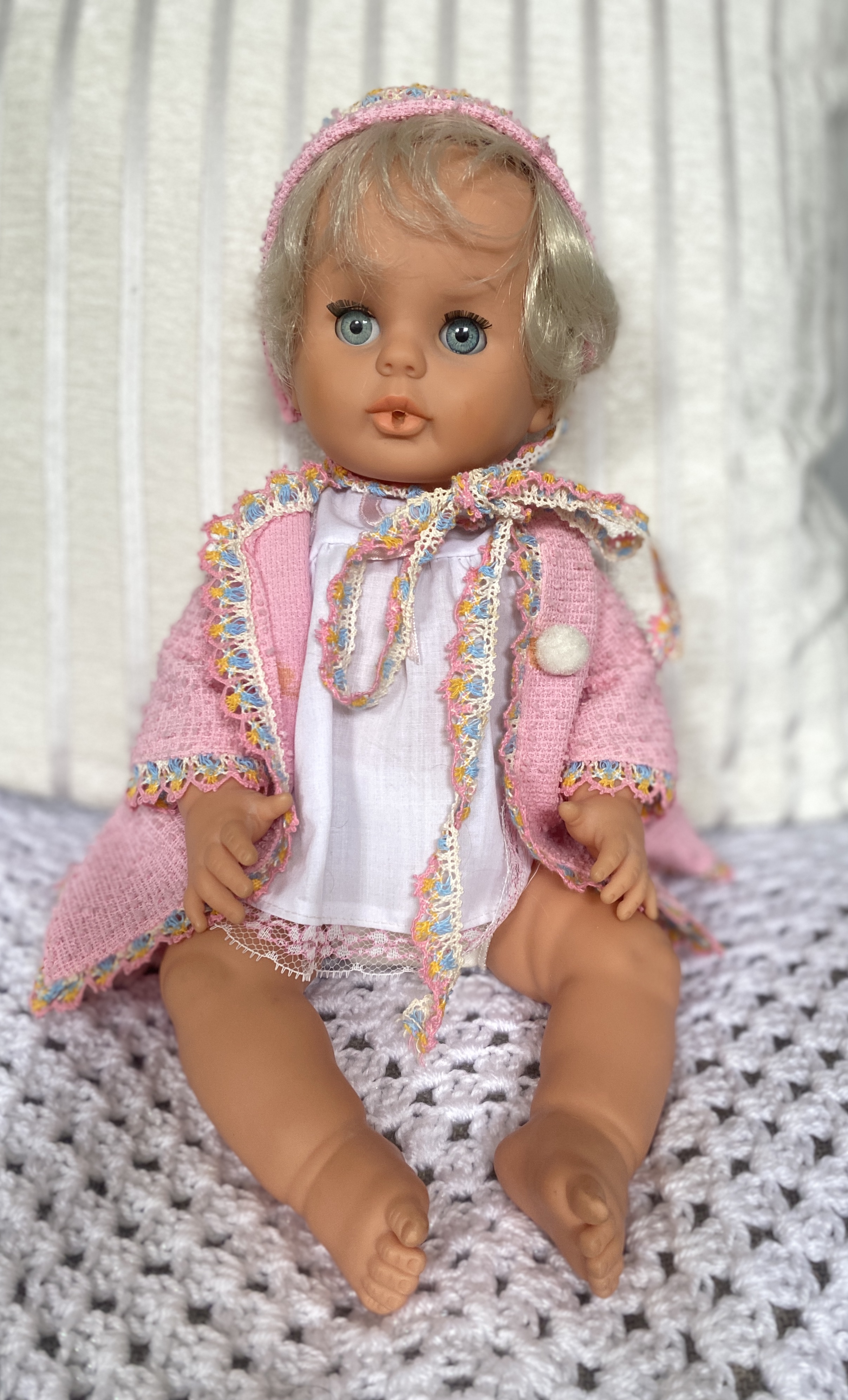 1970’s British Pedigree First Love straight waist baby doll, just as found in her pretty pink coat and bonnet set and white dress. 16 inches in height, she has blue sleep eyes, lashes and good colour. Lovely condition for her years, just in need of a clean and tidy after decades of storage .. FREE SHIPPING (WITHIN THE UK ONLY)