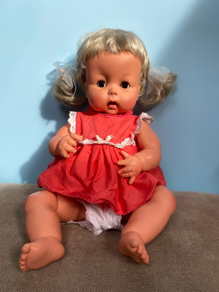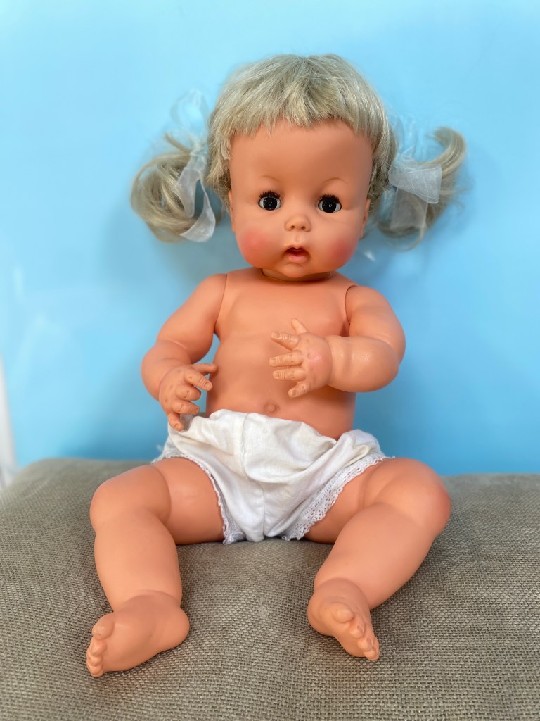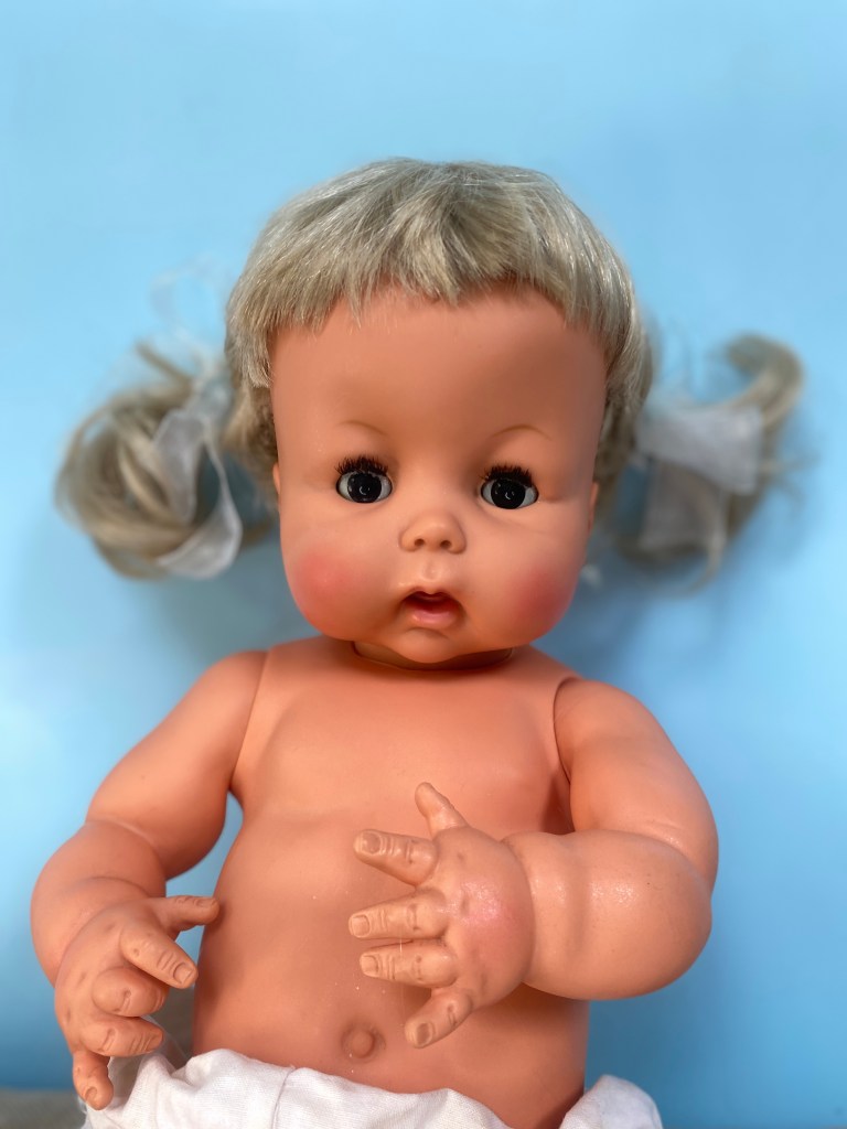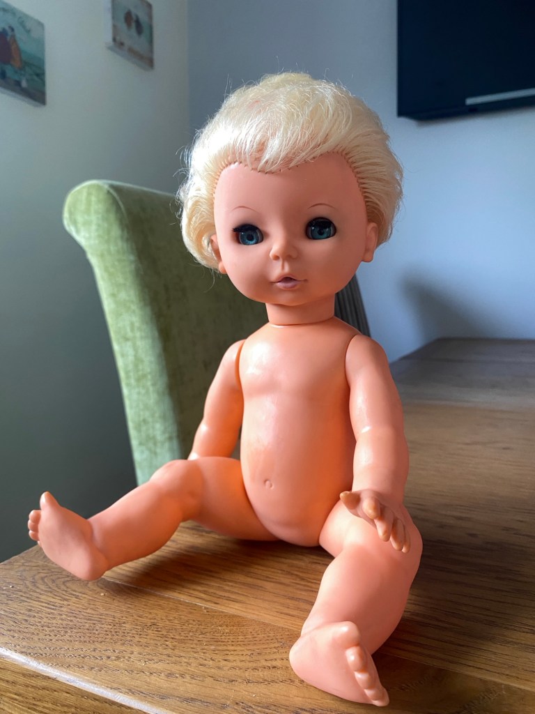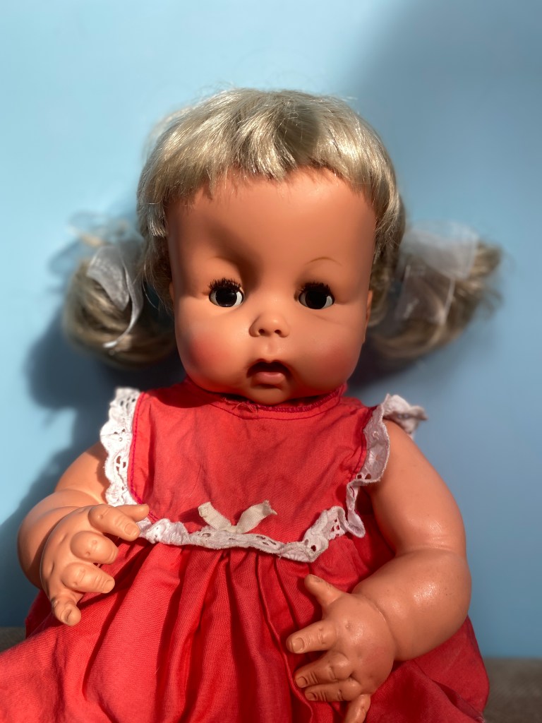 “Cory” is a circa 1970’s vintage British vinyl baby doll, just as found in what looks to be her original outfit. 13 inches in height, Cory has open/close eyes with all her lashes, good colour and golden blonde hair which just needs a little comb and tidy. Good vintage condition, a very sweet doll. FREE SHIPPING (WITHIN THE UK ONLY)