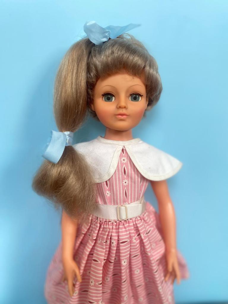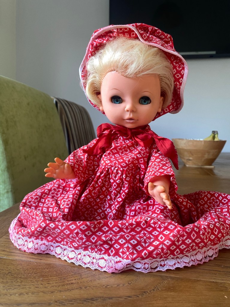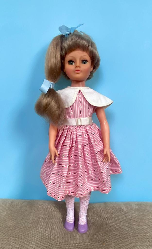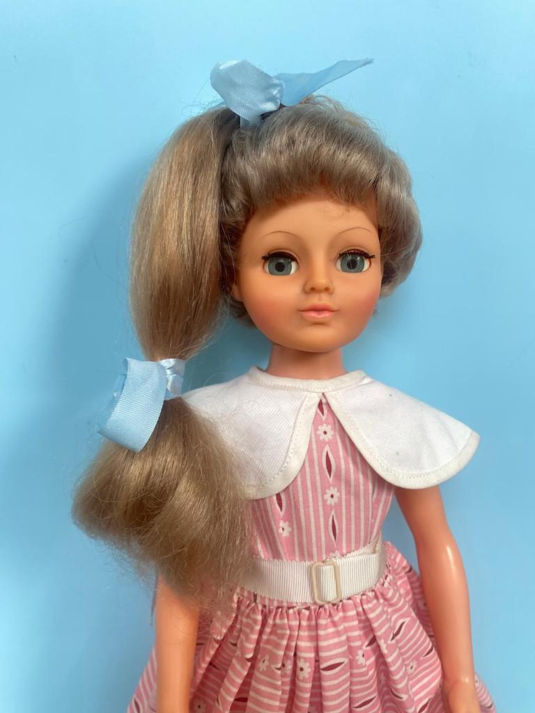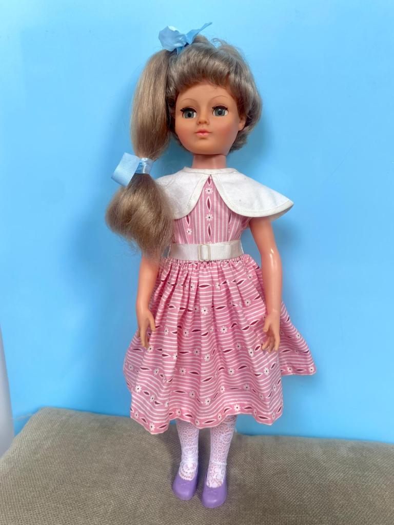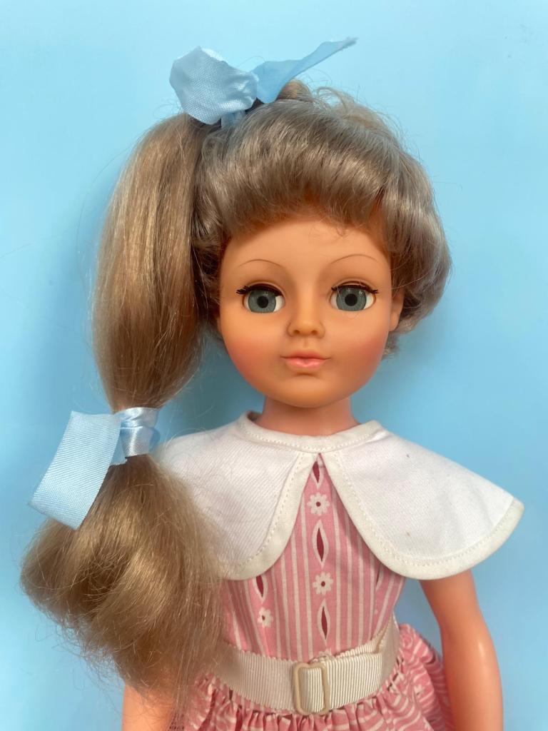 Lovely example of the vintage 1960’s Palitoy Sheena hair growing vinyl doll wearing vintage shawl collared belted dress, lacey knee socks and her original shoes. Sheena is 18 inches in height with blue sleep eyes, all her lashes and nice colouring. Good clean condition for her years, the hair still retracts in and out but a little slowly. FREE SHIPPING (WITHIN THE UK ONLY)