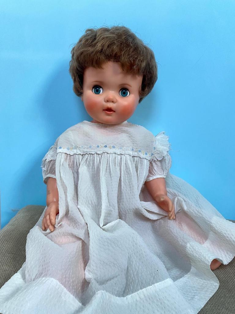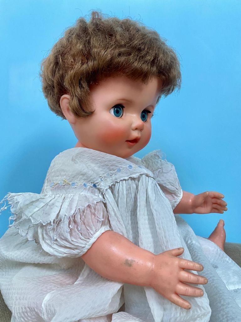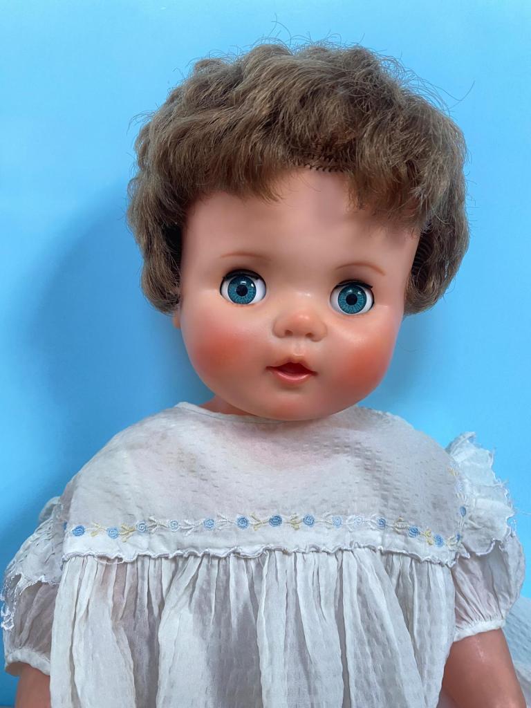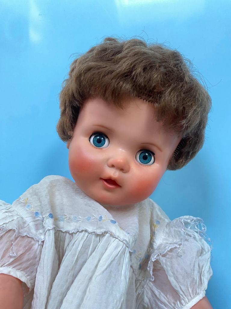 Jackie (aka Jacqueline) is an early 1960’s British Roddy vinyl pram baby doll (unmarked), 24 inches in height with sleep eyes, good colour and lovely vintage condition apart from a few body marks and snipped hair plugs as shown. Her dress is a bit tatty with age but still displays well. A fabulous big character pram doll!. FREE SHIPPING (WITHIN THE UK ONLY)